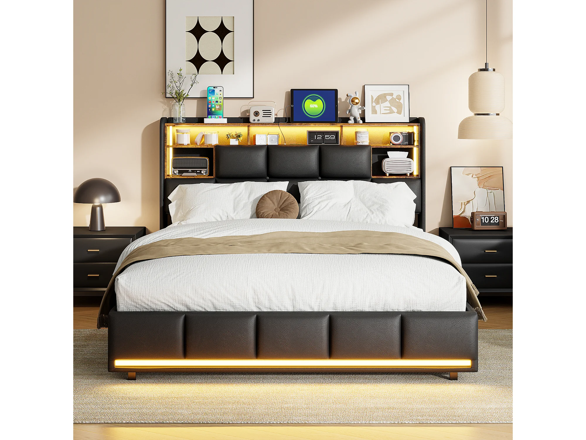 Lit double 160 x 200 cm - avec éclairage LED et rangement hydraulique - tête de lit avec port USB et fonction rangement - PU - noir