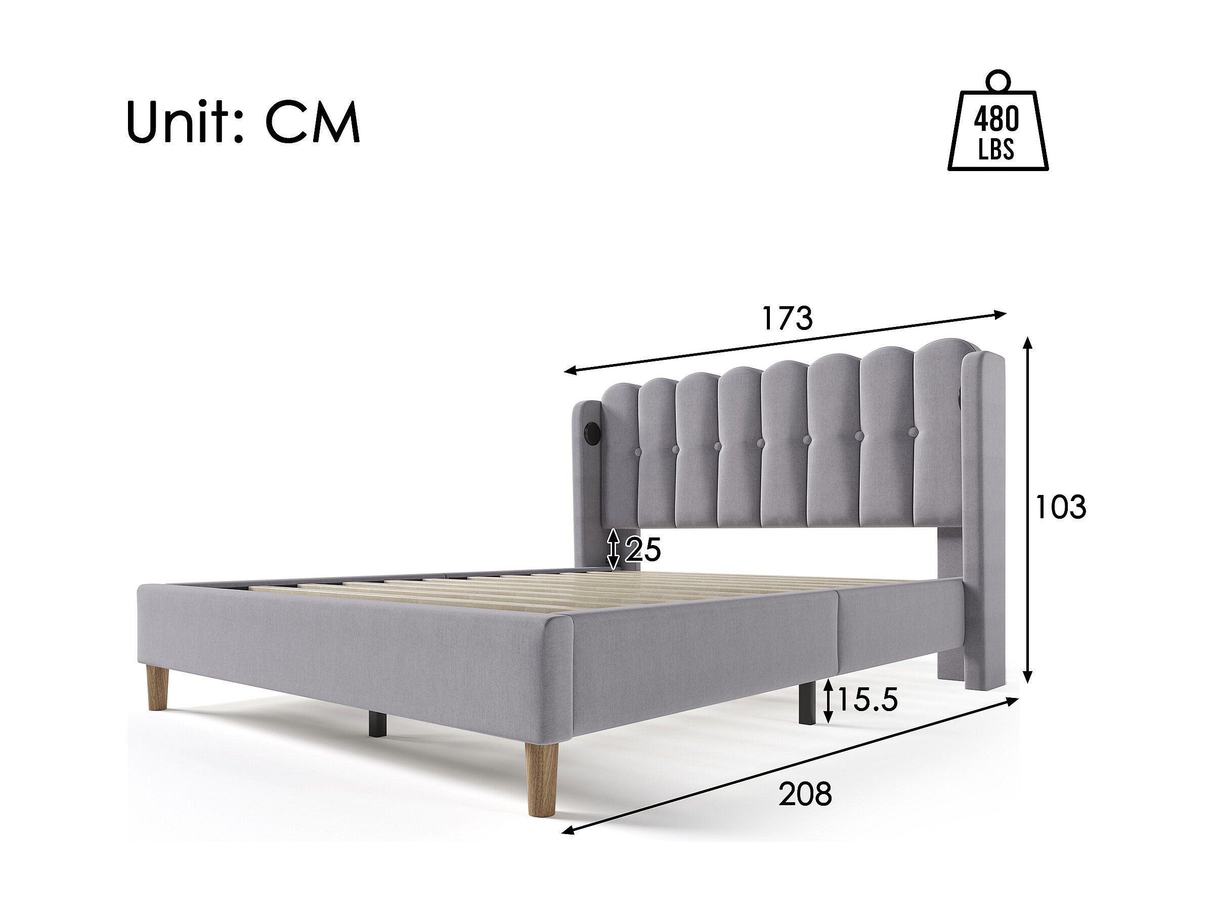 Lit double 160 x 200 cm avec fonction de chargement USB Type C, cadre en lin gris et sommier
