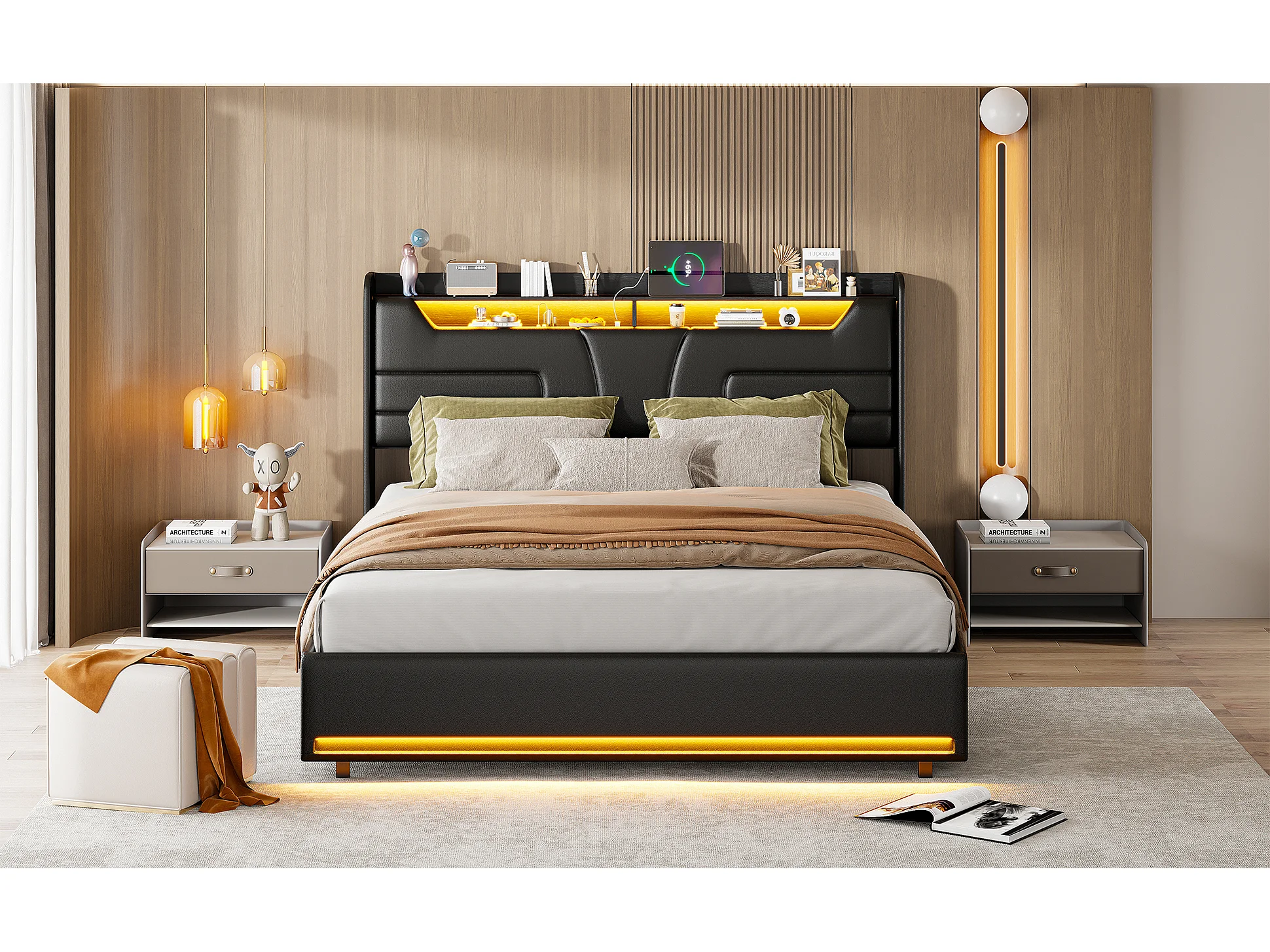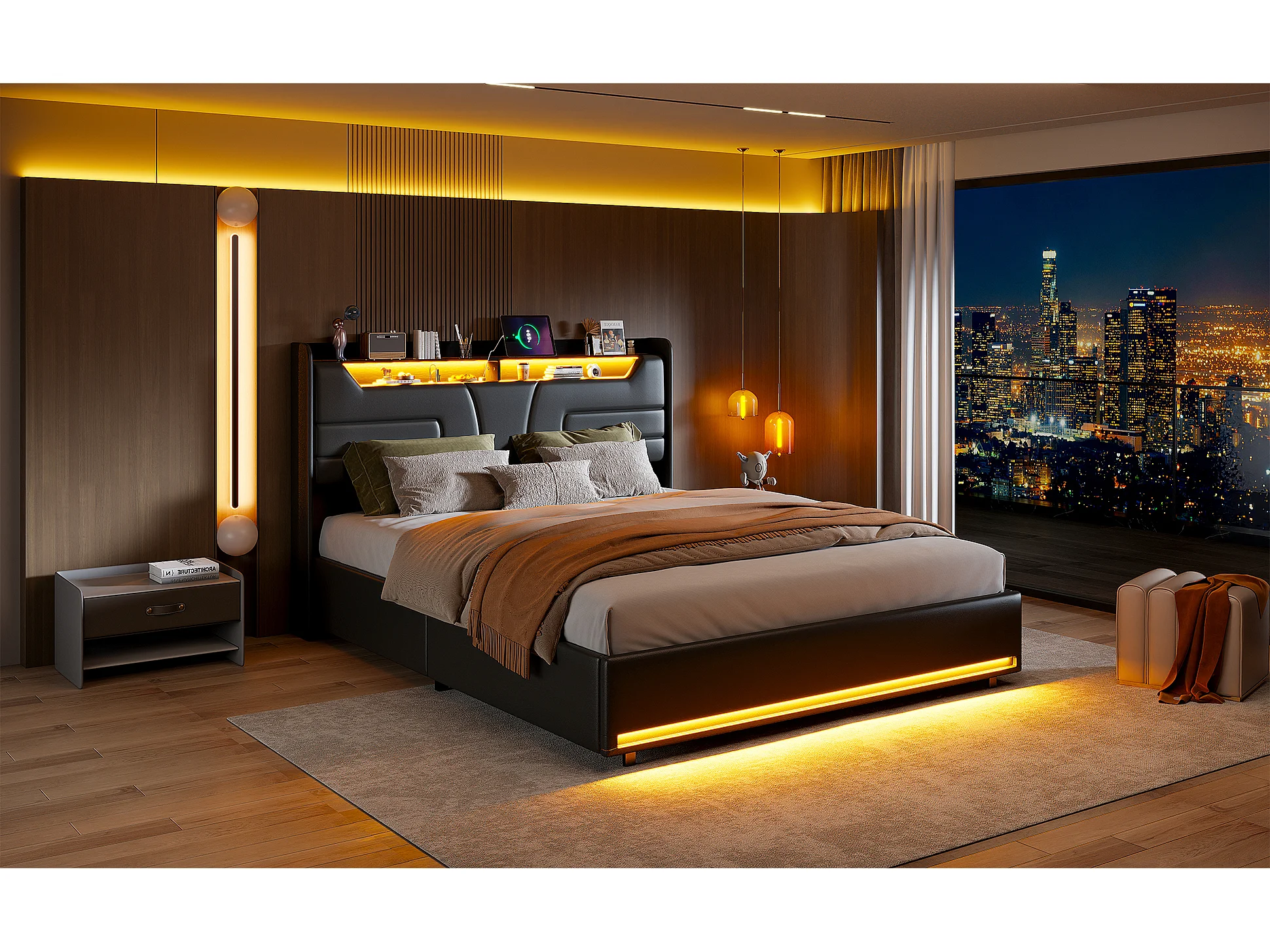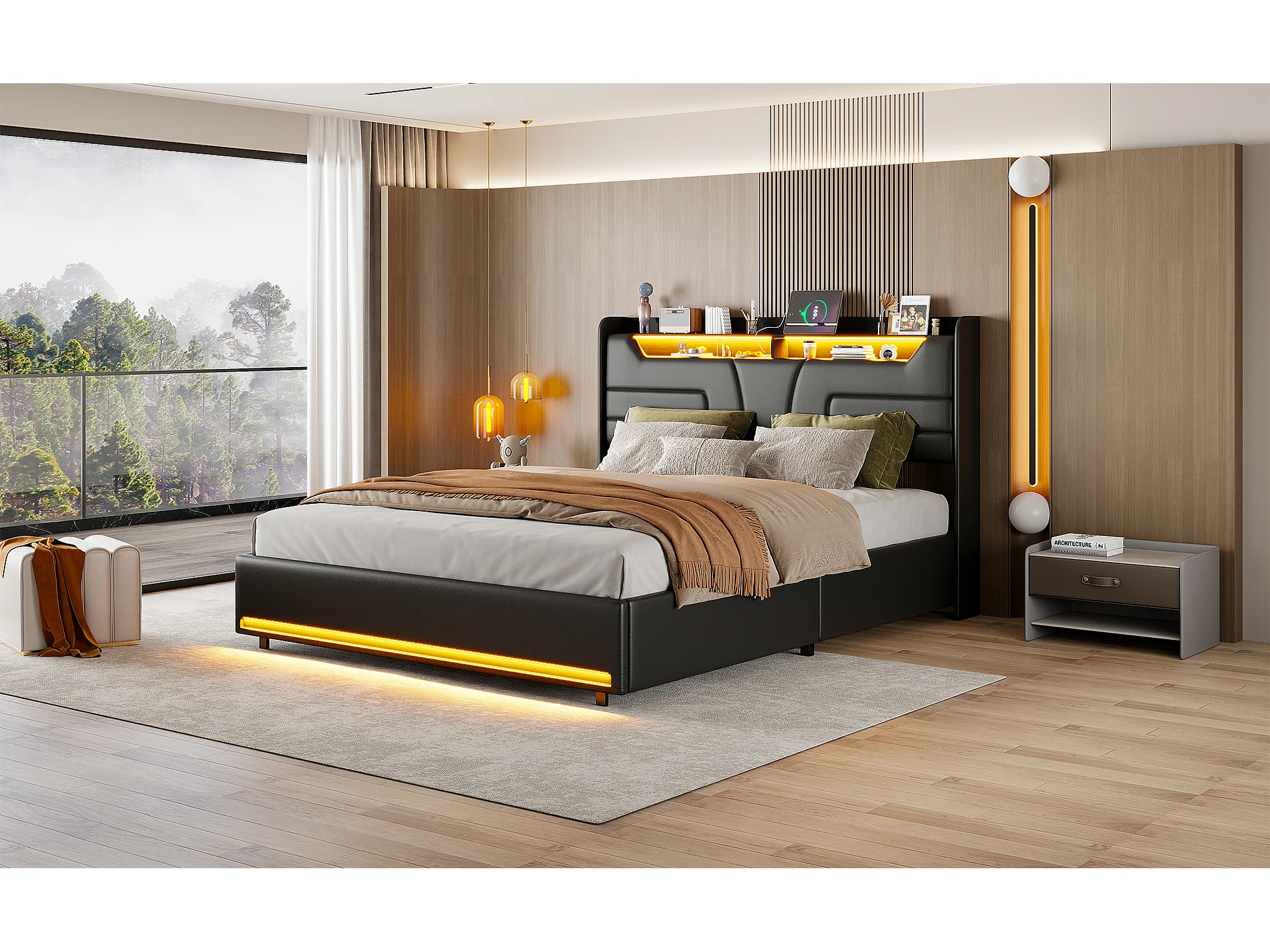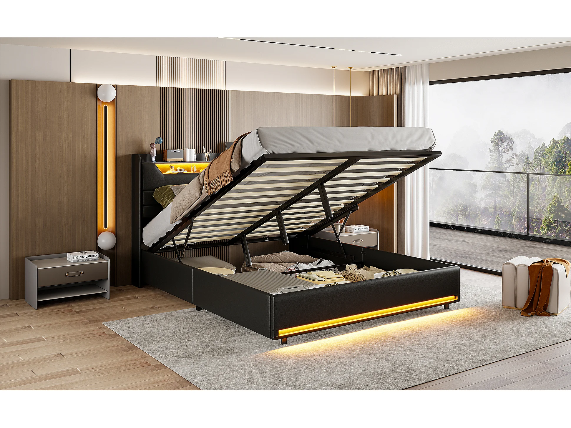 Lit double 160 x 200 cm, cadre de lit rembourré, lit adulte avec vérin hydraulique, lit de rangement avec éclairage LED, port de charge,