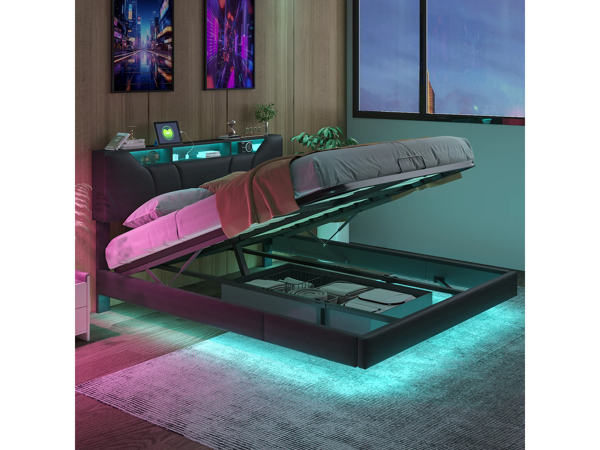 Lit double, 160 x 200 cm, lit de rangement hydraulique, lit fonctionnel avec grand espace de rangement, lit tapissé, tête de lit de rangement, tête de lit réglable
