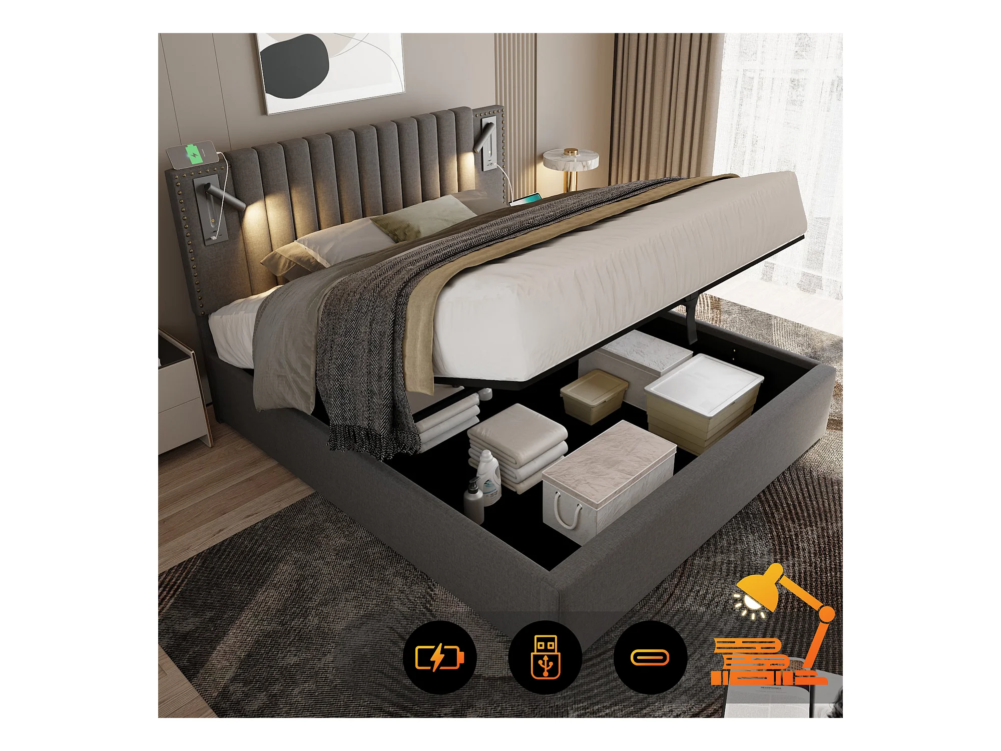 Lit coffre 160x200cm en tissu de cotton - avec lampes de lecture et Ports de charge USB - avec sommier à lattes - Gris