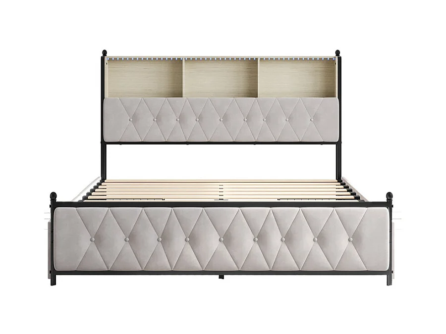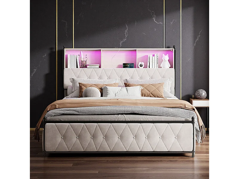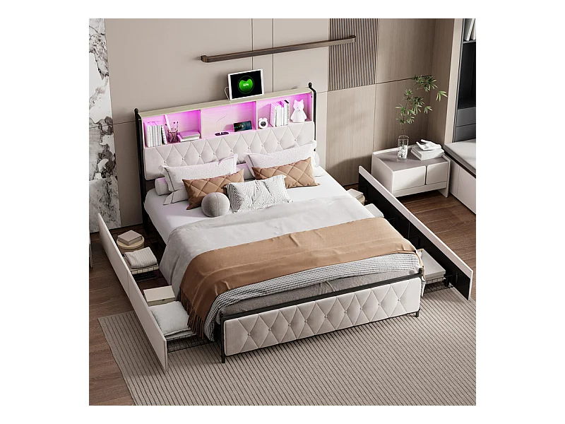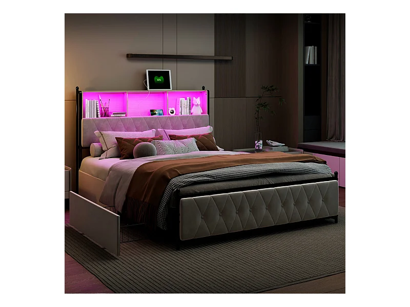 Lit Double 160x200 avec Rangement - Grand Lit Velours Béige 4 Tiroirs de Stockage et Tête de Lit LED - Structure Métal 300kg