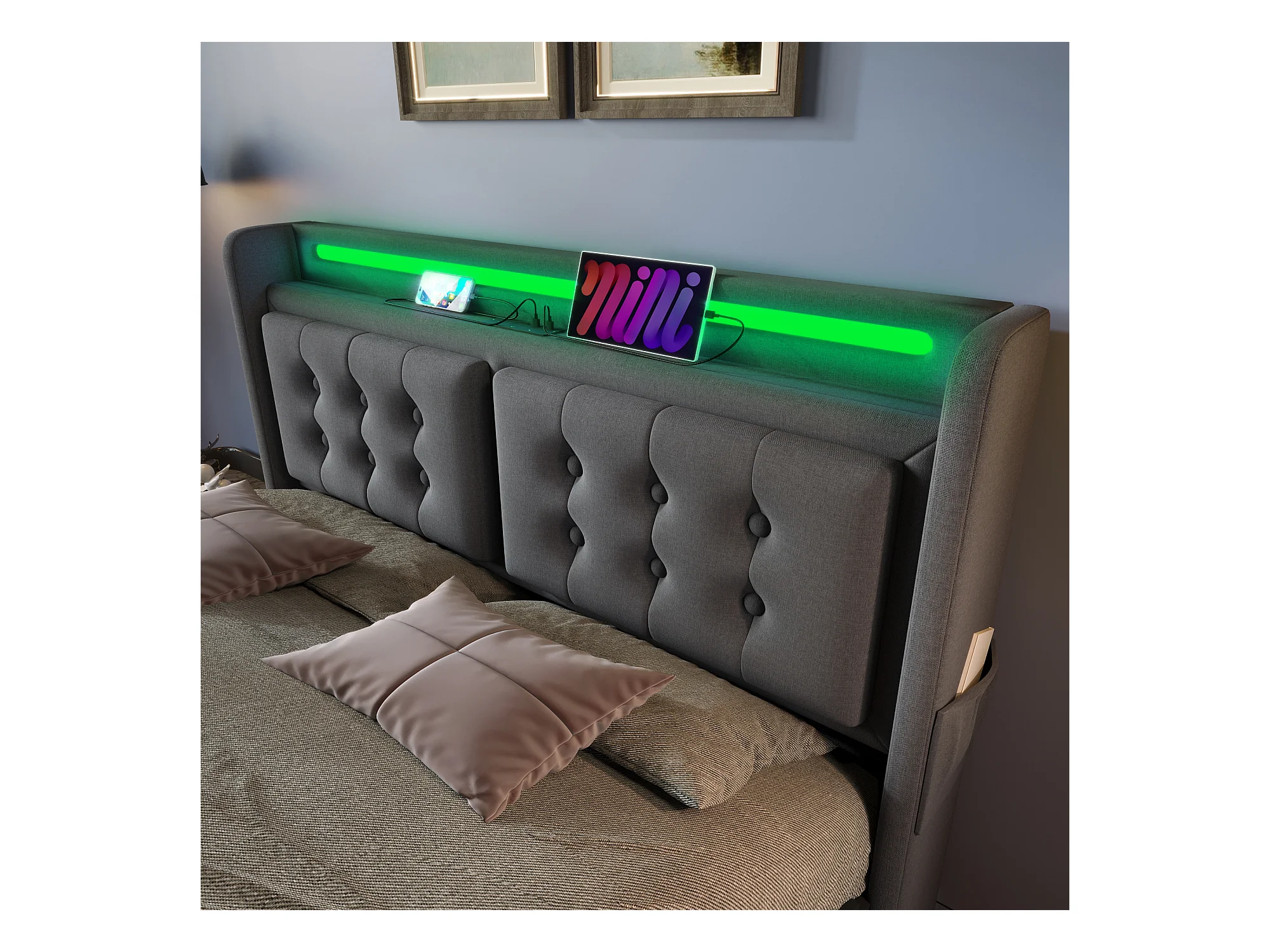 Lit double 160x200 avec tête de lit LED et port USB-C, lit hydraulique avec sommier en bois et cadre métallique, capacité 300 kg, gris, coton (sans matelas)