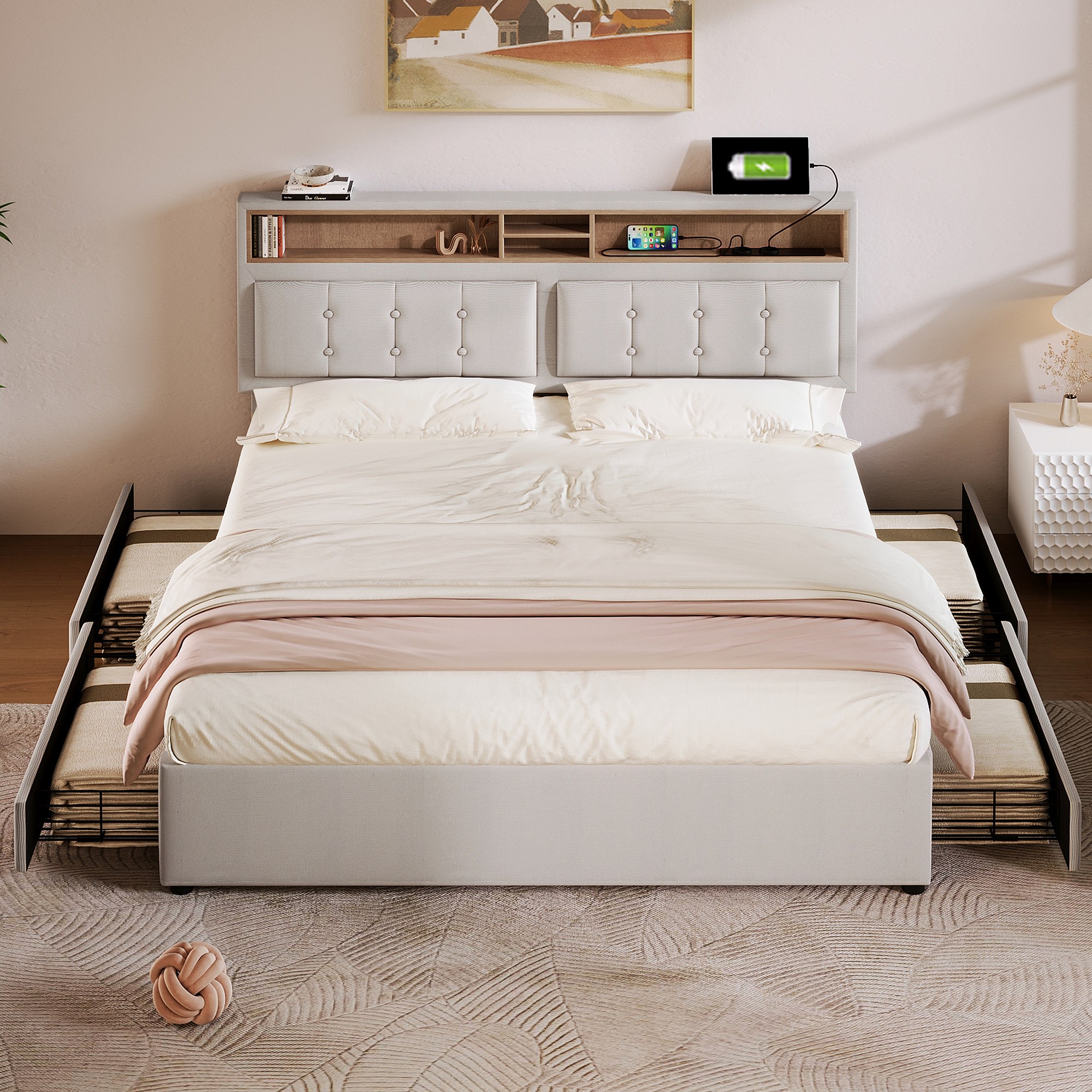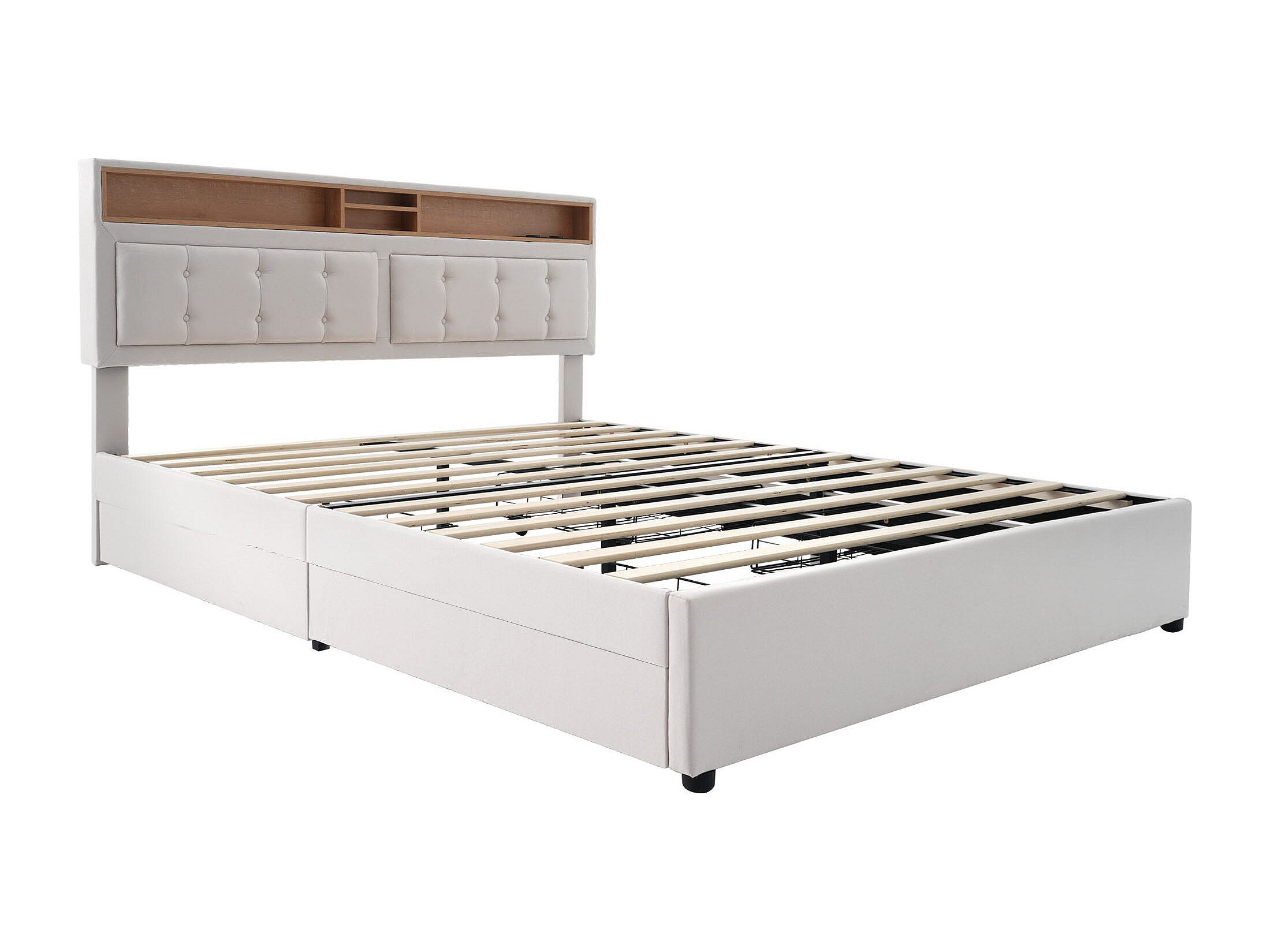 Lit double 160x200 cm avec 4 tiroirs et prise USB-C, tête de lit réglable en hauteur, en lin beige