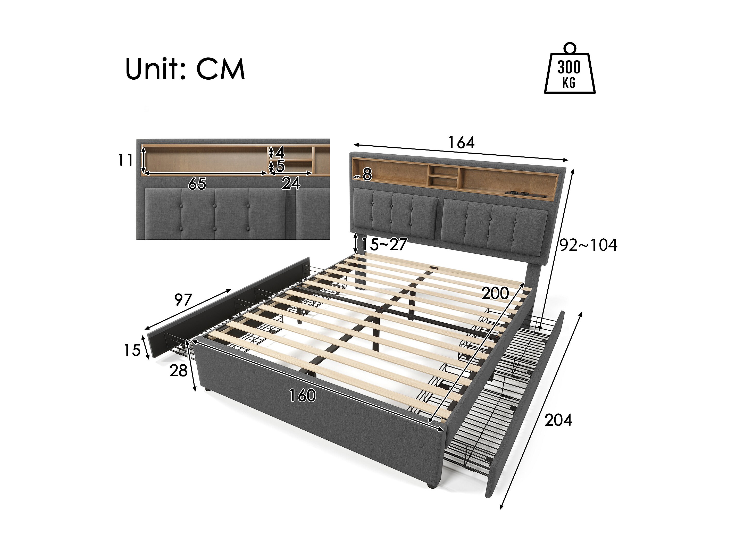 Lit double 160x200 cm avec 4 tiroirs et prise USB, tête de lit réglable en hauteur, en lin gris