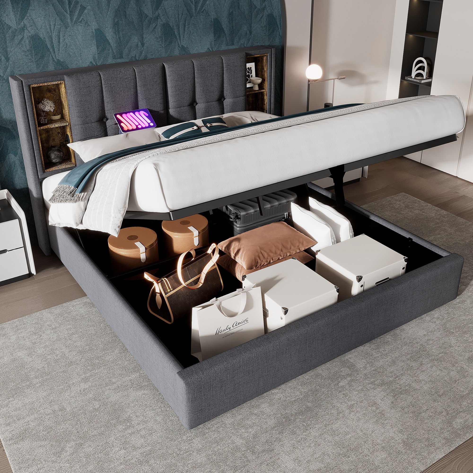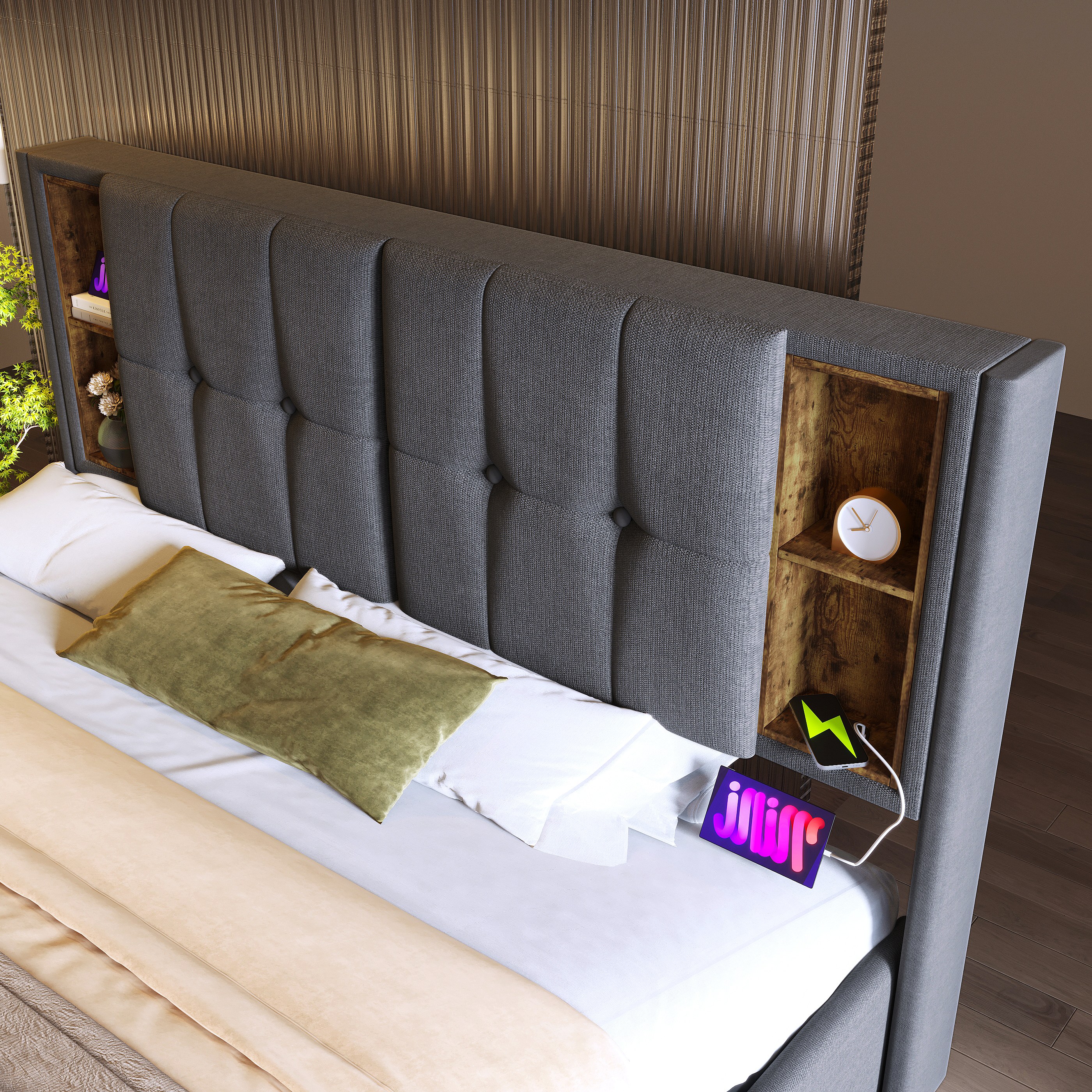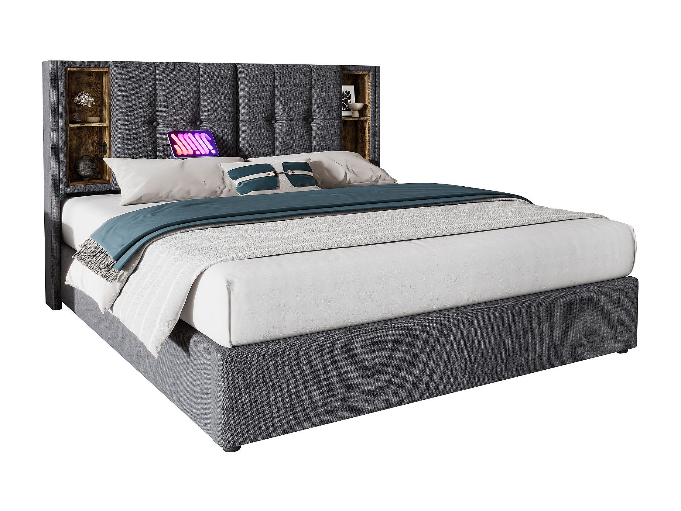 Lit double 160x200 cm avec charge sans fil et ports USB, cadre de lit en coton gris avec rangement