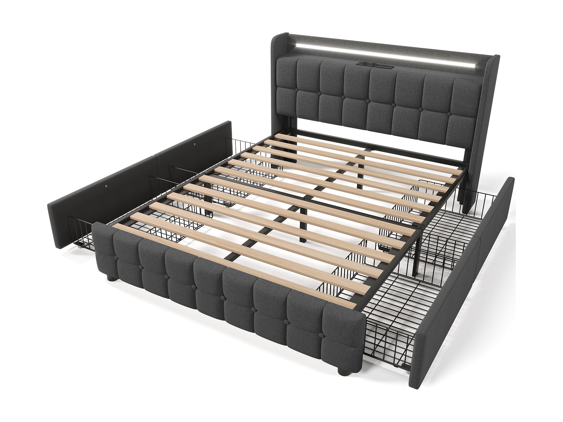 Lit double 160x200 cm avec éclairage LED, prises USB et 4 tiroirs de rangement, gris