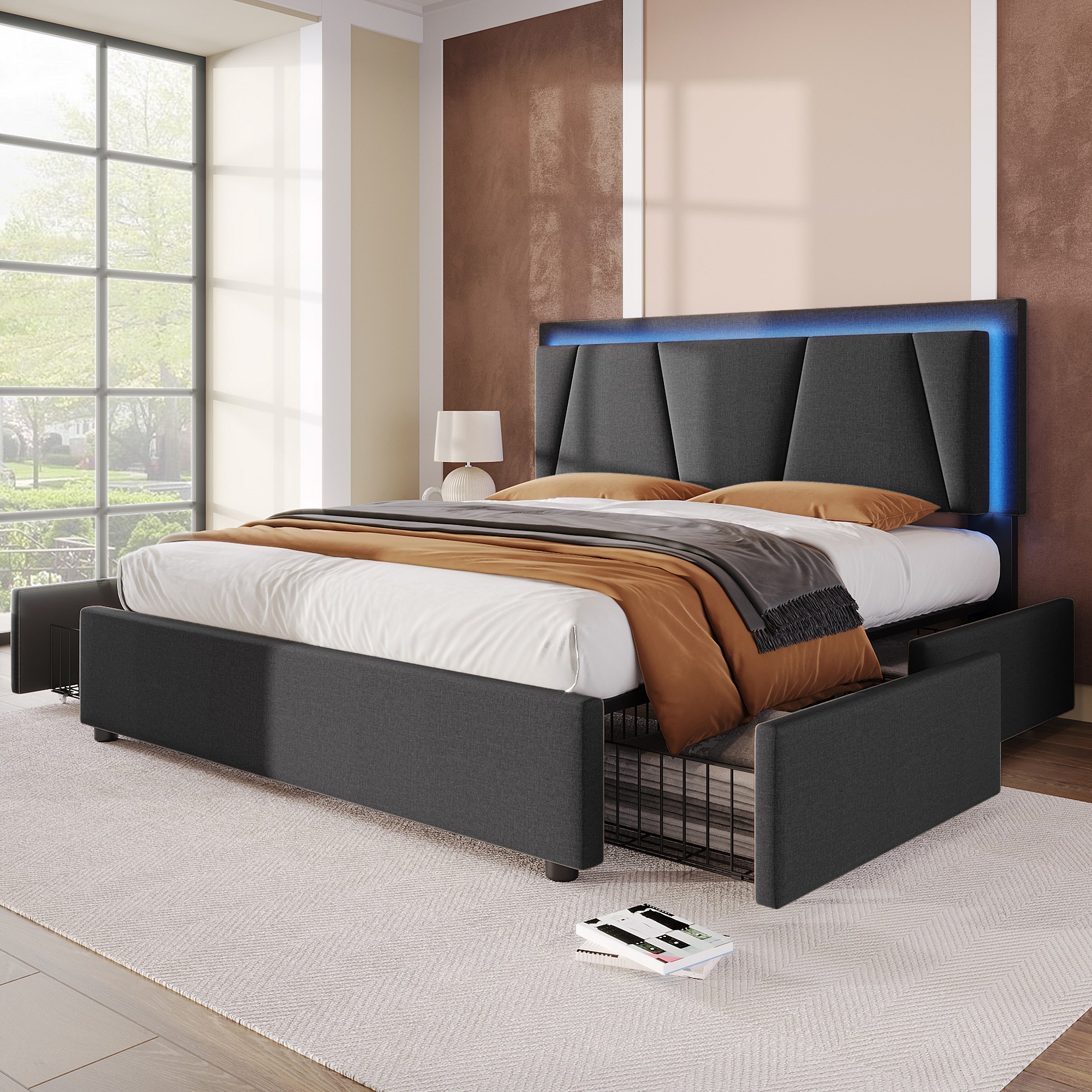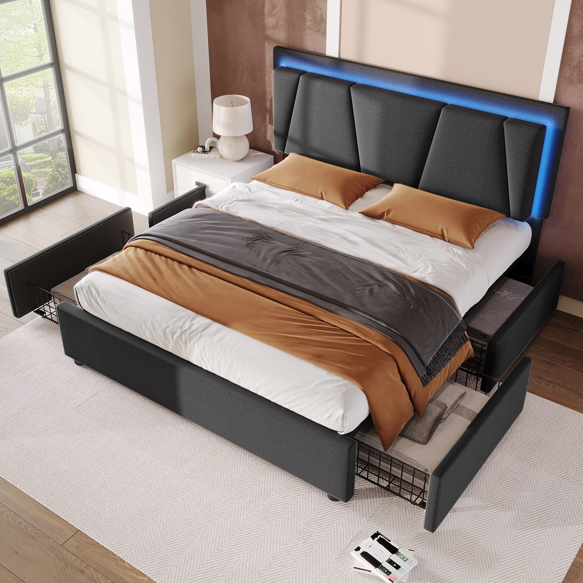Lit double 160x200 cm avec éclairage LED, tête de lit réglable et 4 tiroirs de rangement, gris