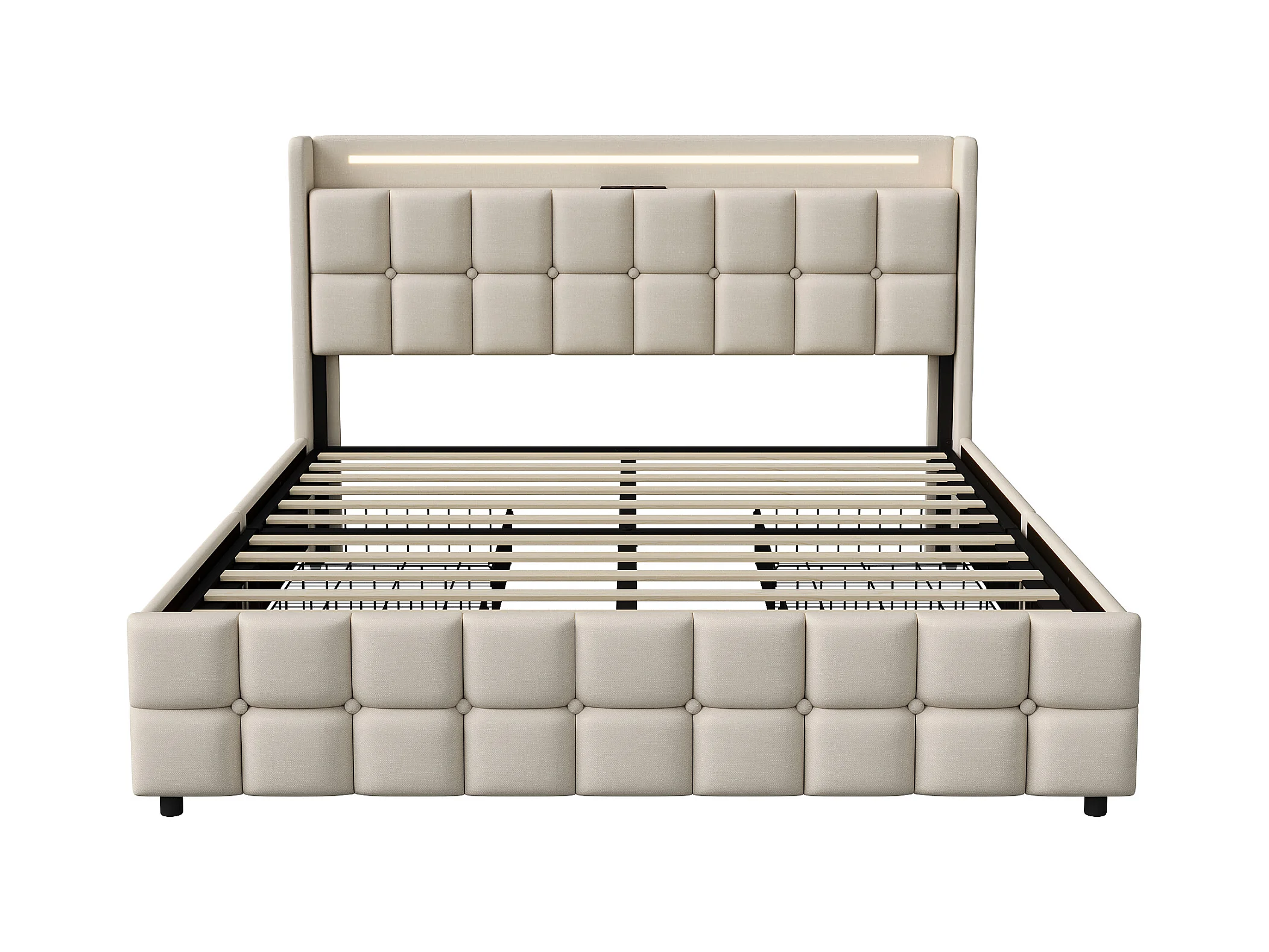 Lit Double 160x200 Cm Avec LED, 4 Tiroirs, Port USB, Tête Rembourrée, Tissu Beige, Style Moderne.