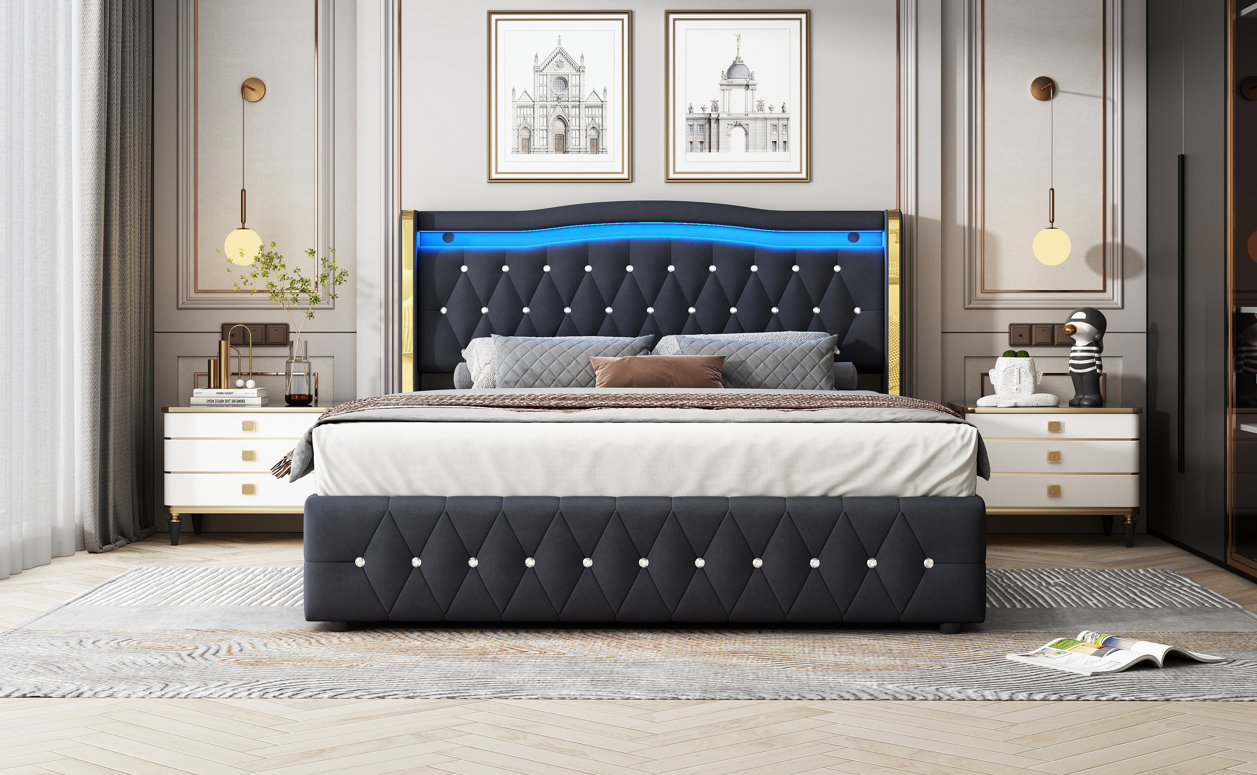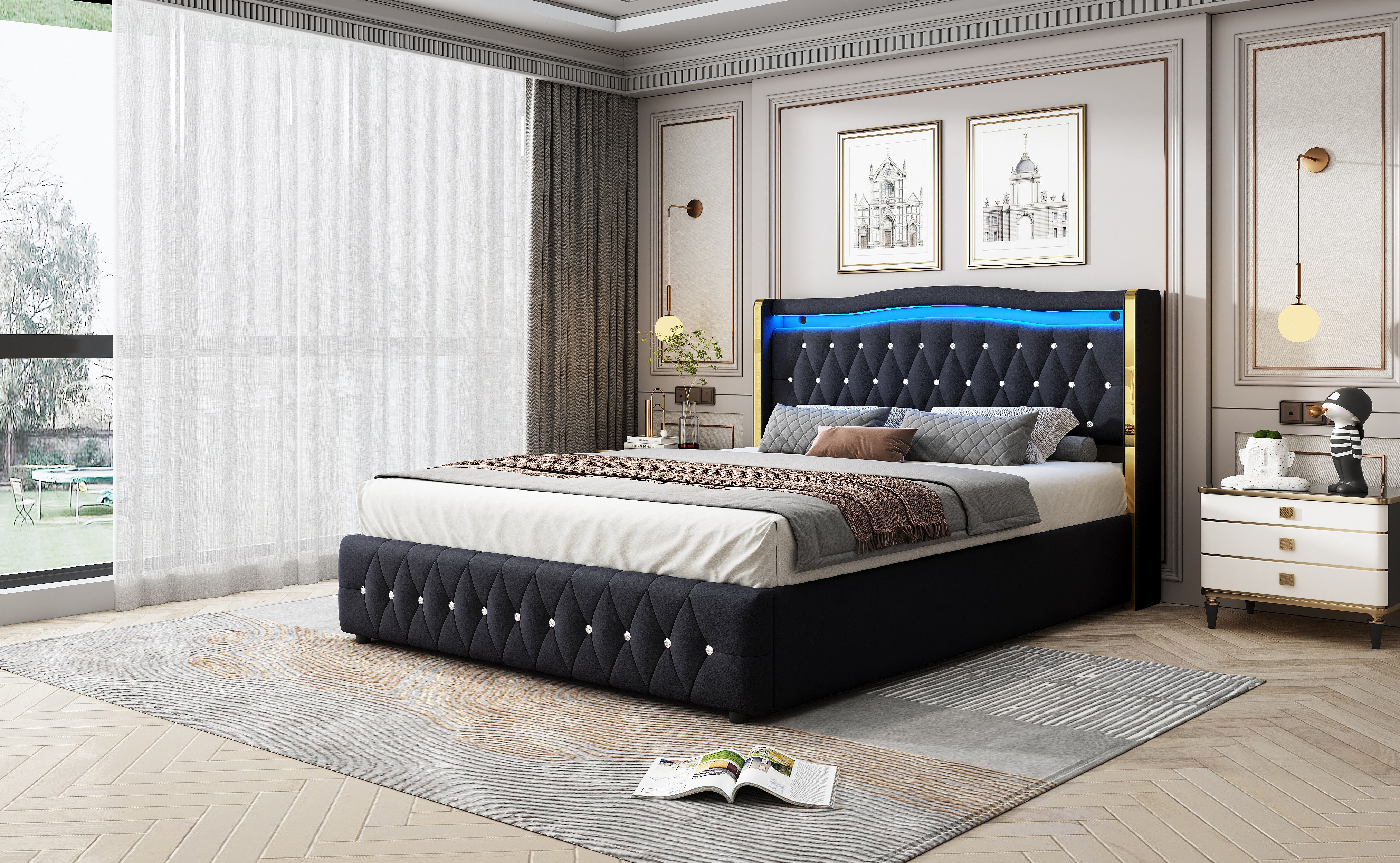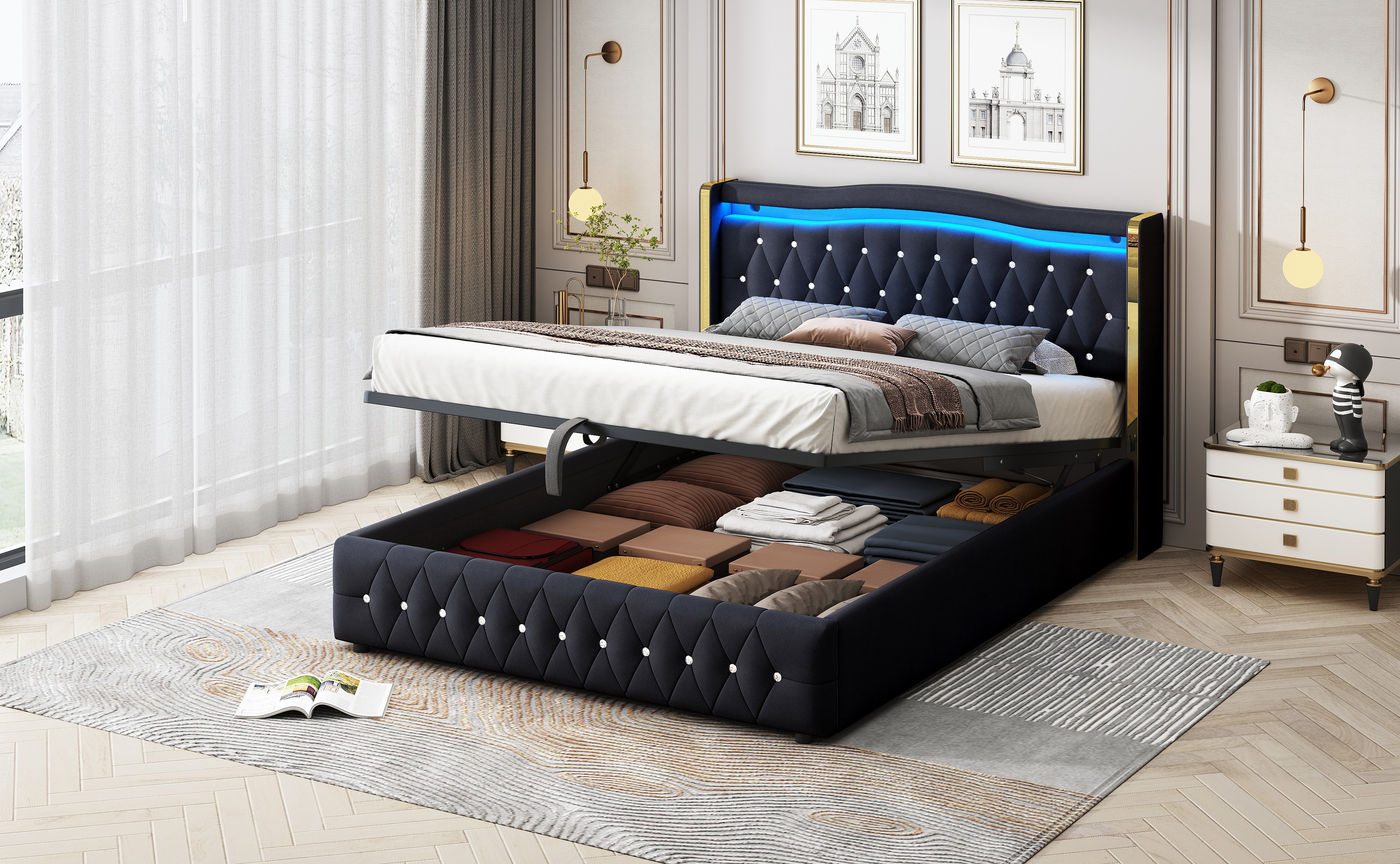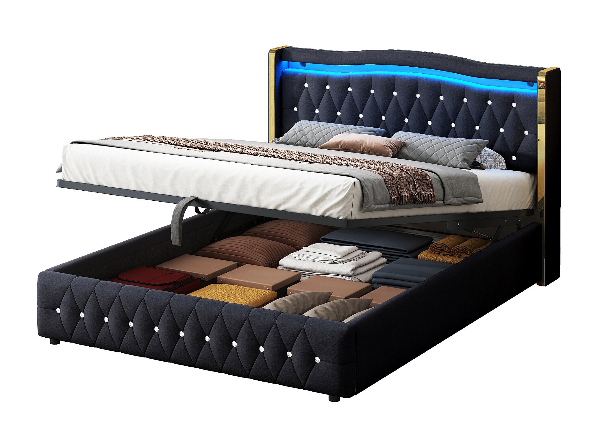 Lit double 160×200 cm avec pieds larges, éclairage LED changeant de couleur et rangement hydraulique