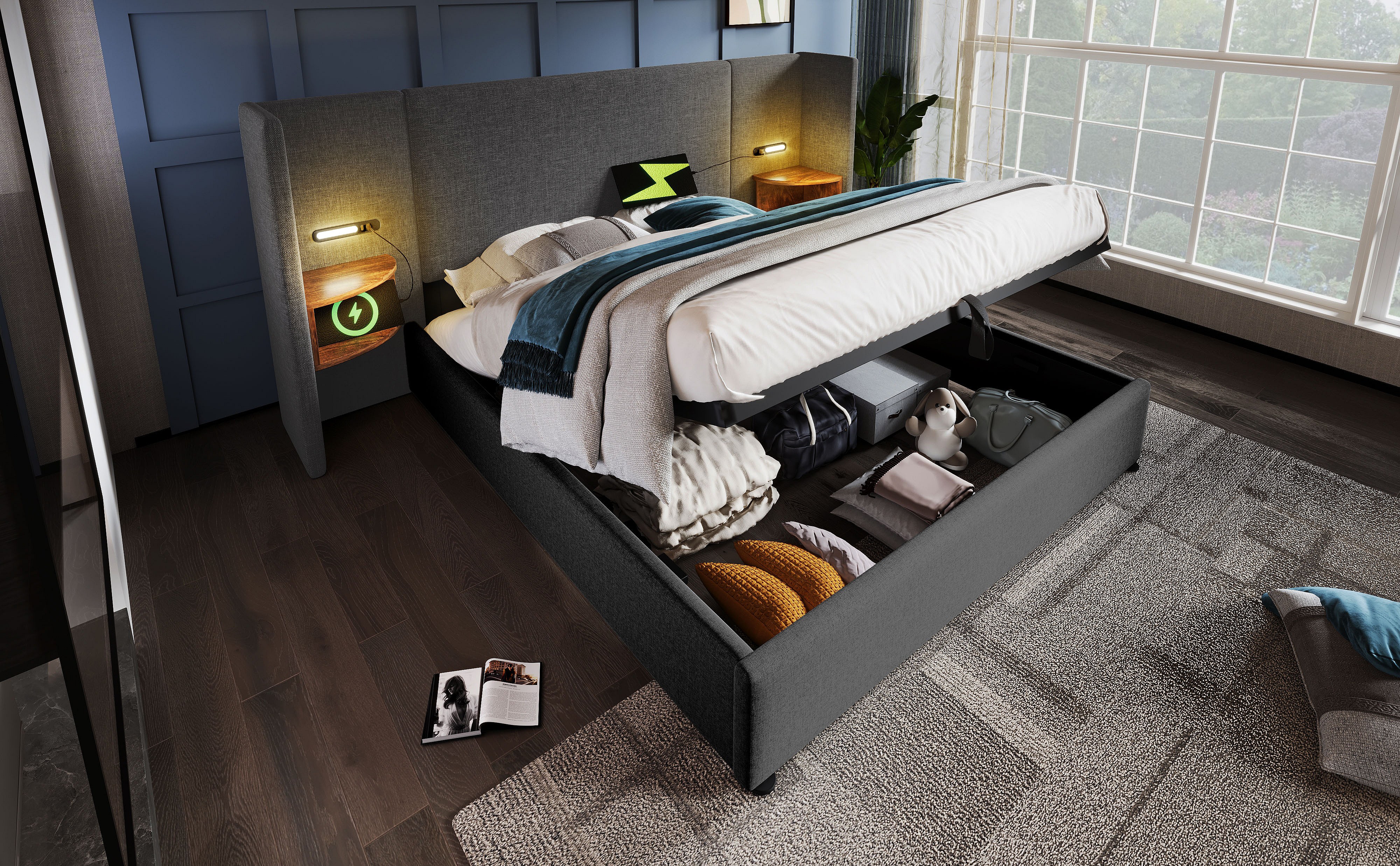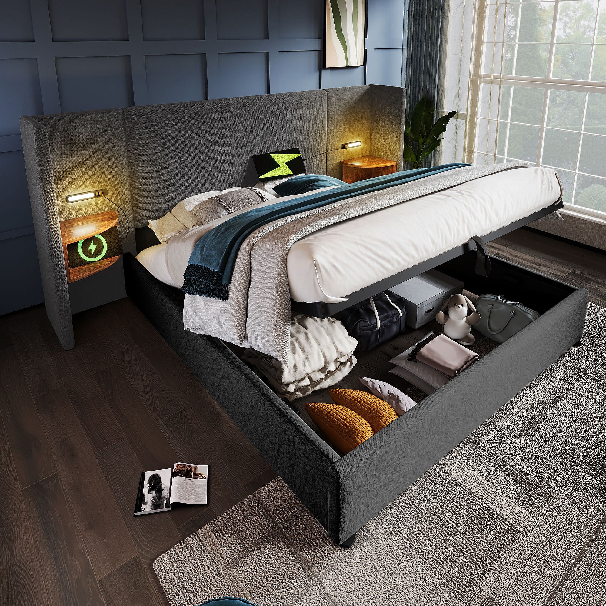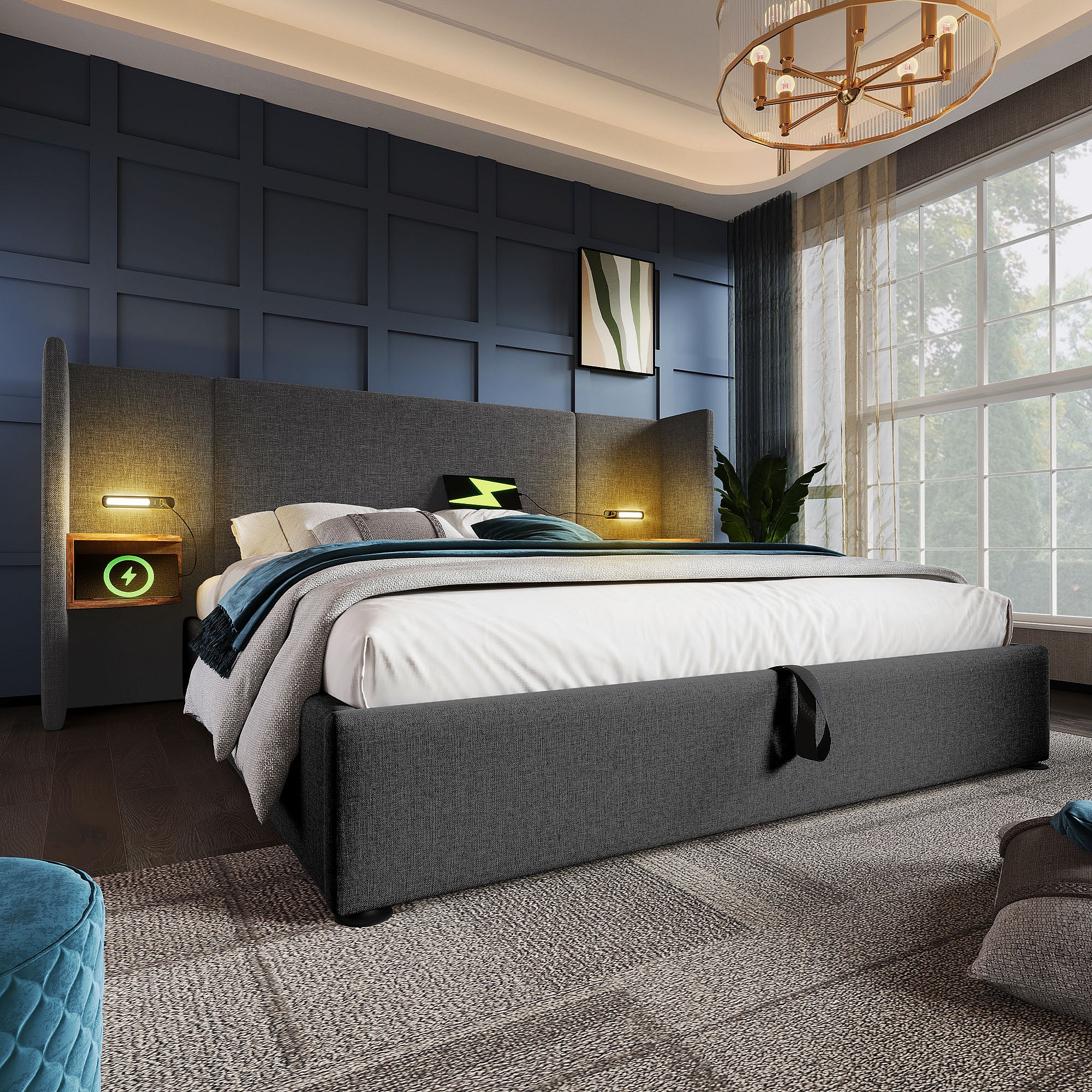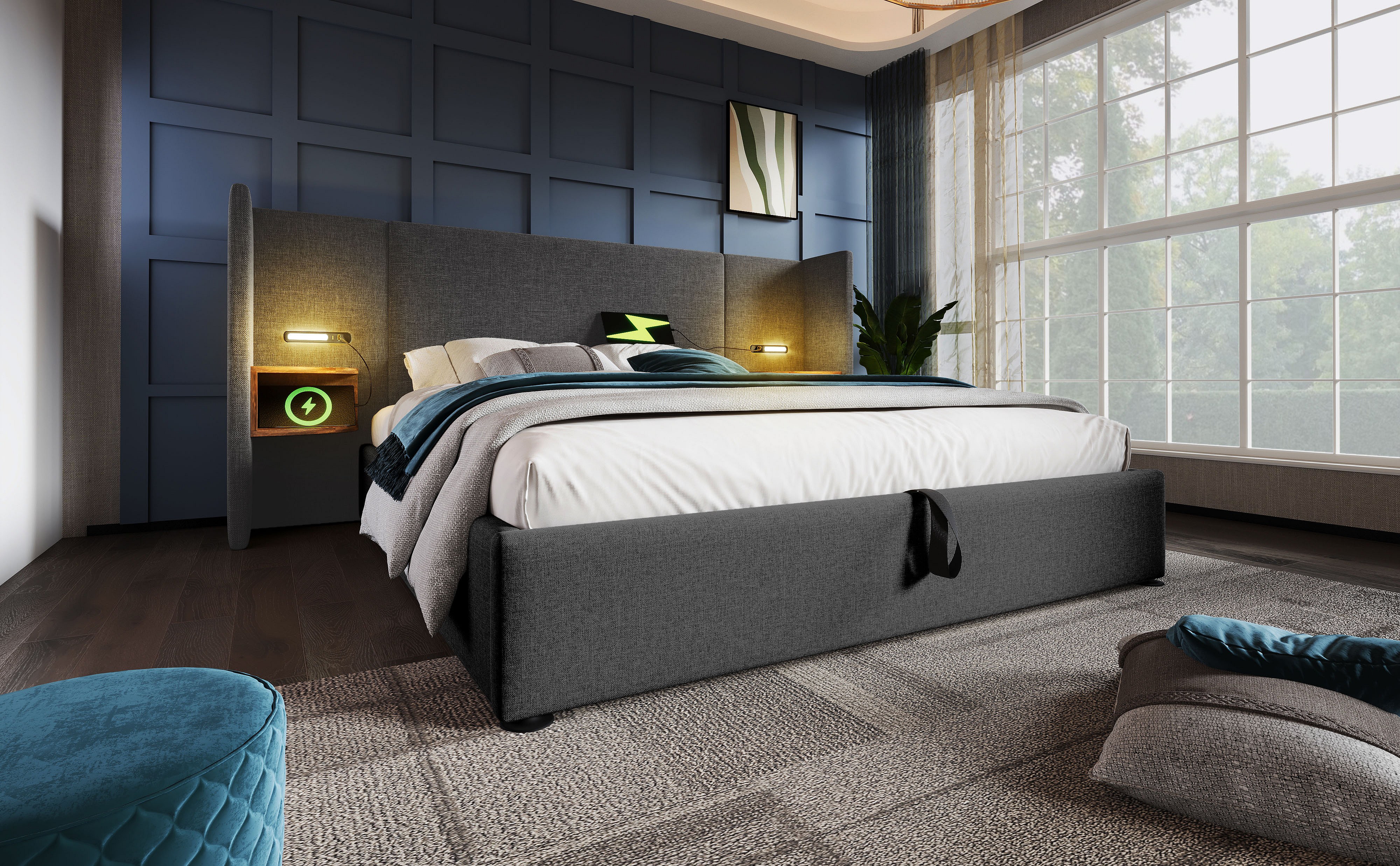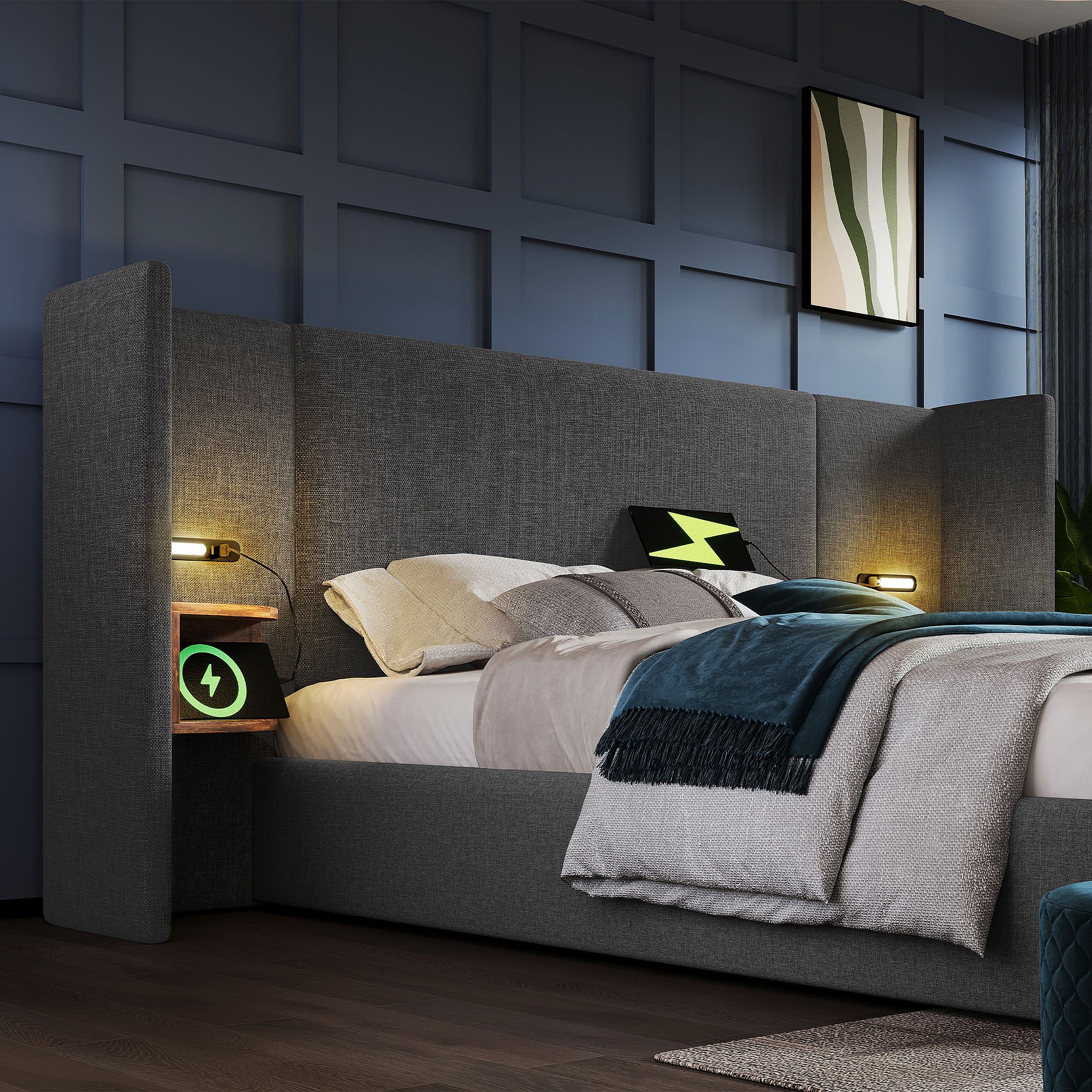 Lit double 160×200 cm avec table de nuit, lampe de lecture et chargeur USB Type-C, cadre en bois massif et métal, gris, lin