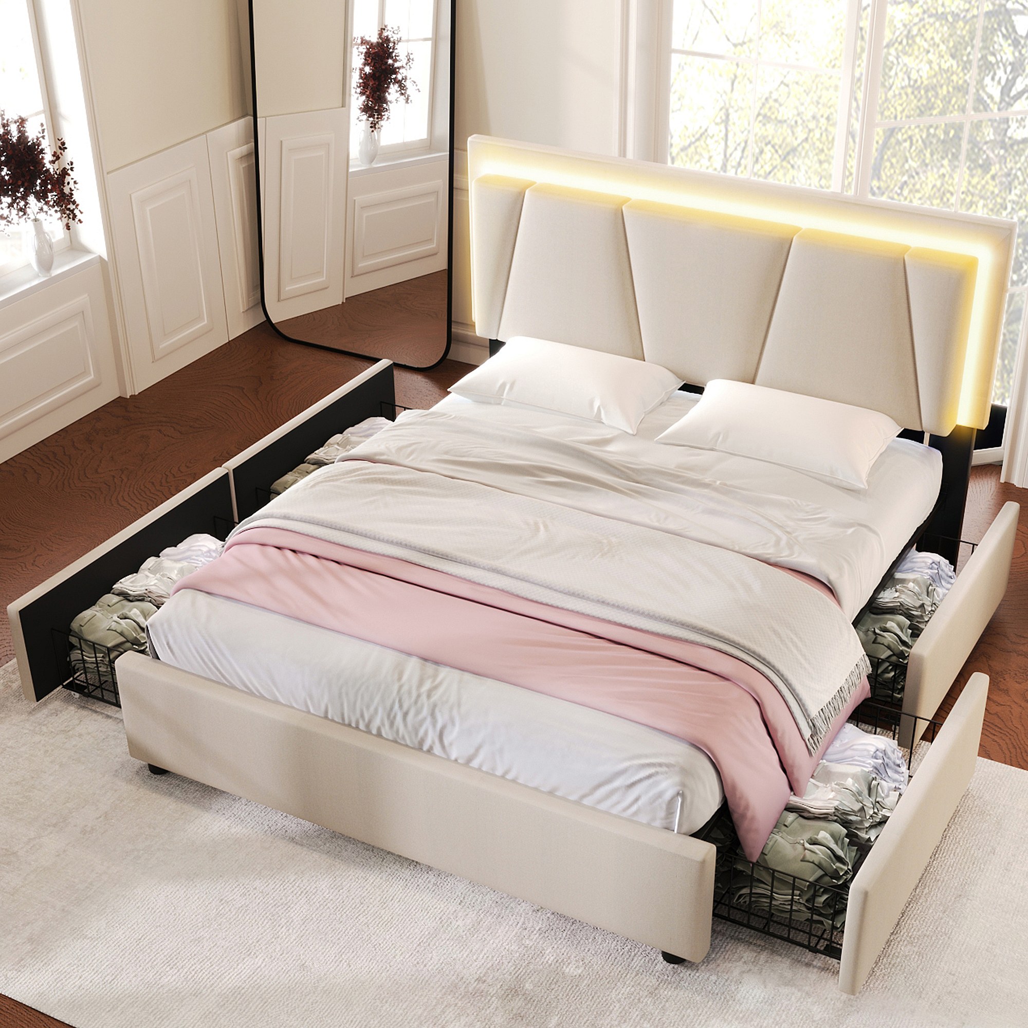 Lit double 160x200 cm en beige avec éclairage LED et 4 tiroirs, tête de lit réglable