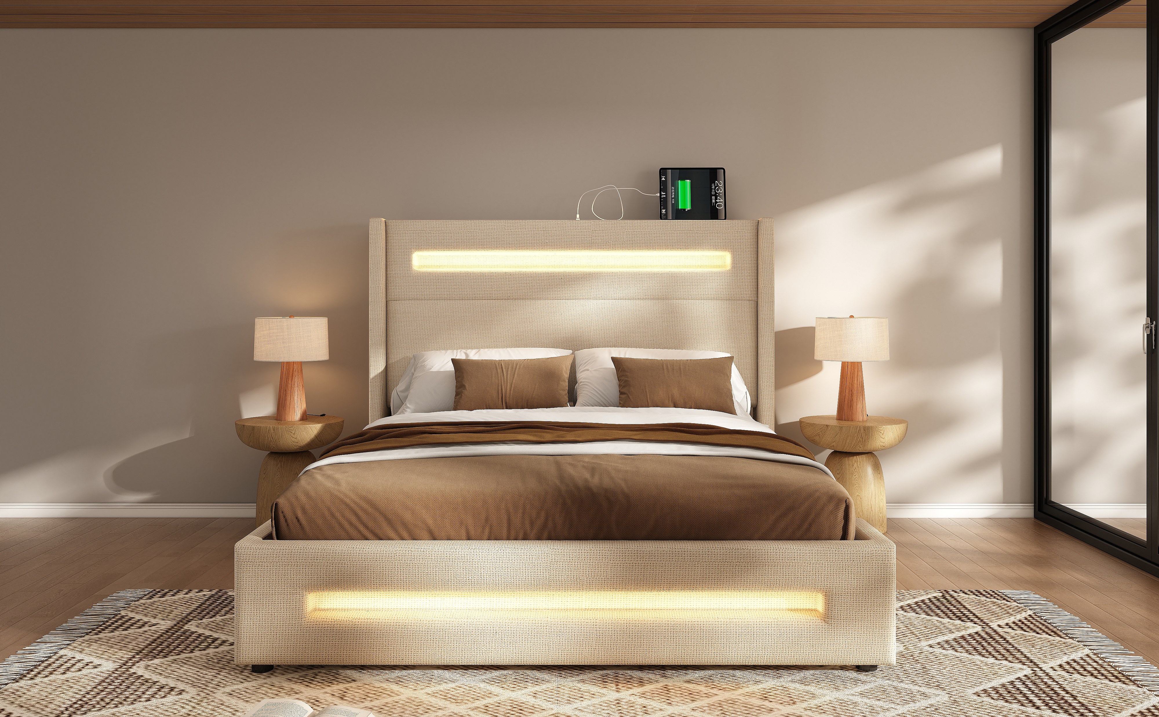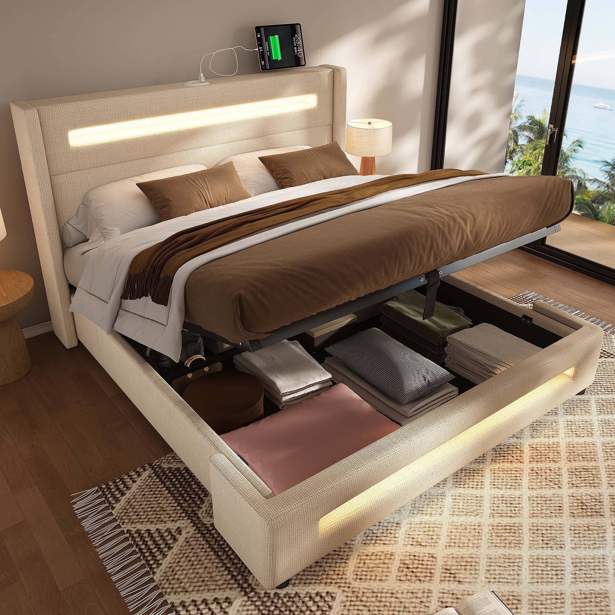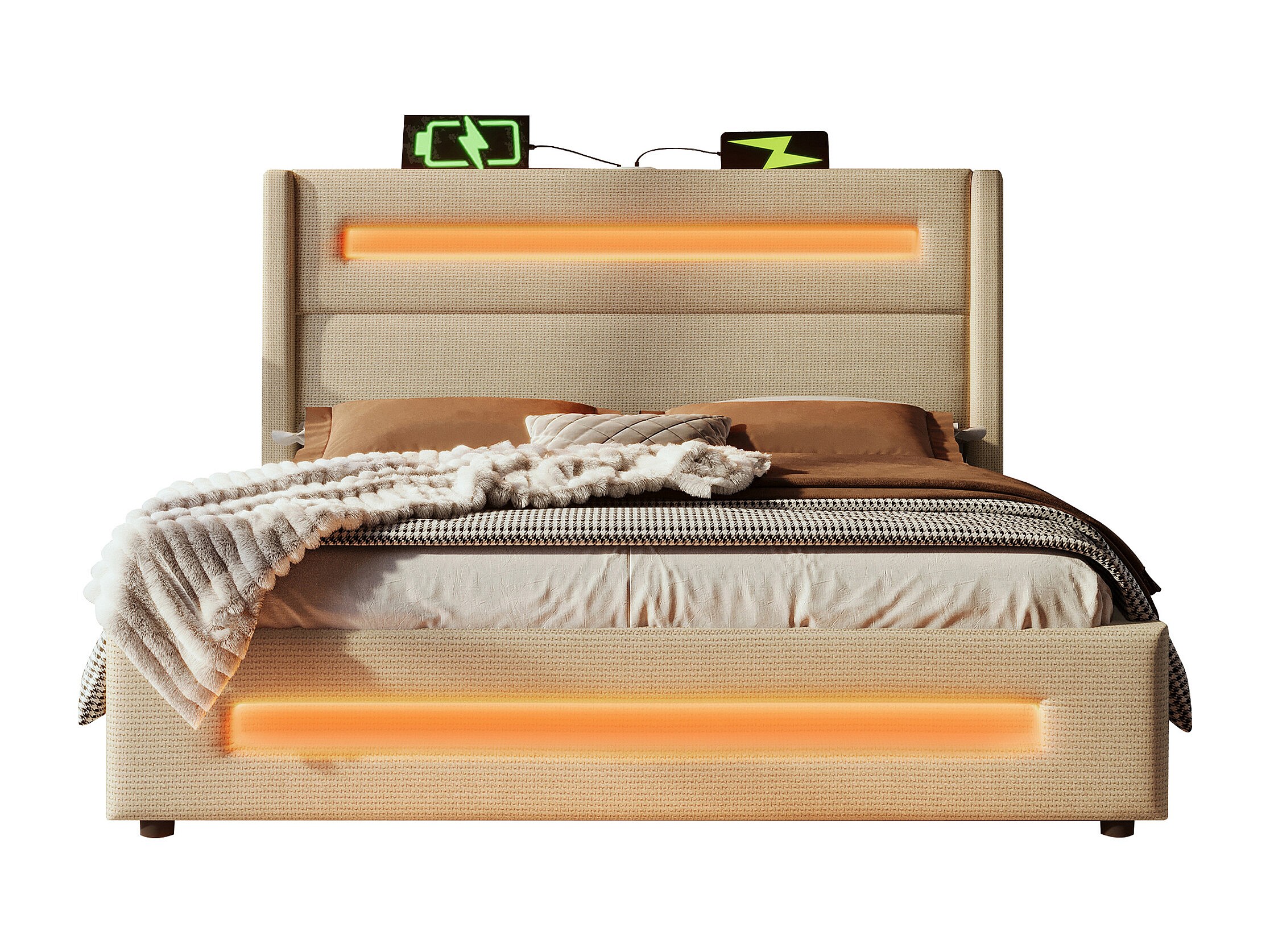 Lit double 160x200 cm en lin beige avec LED, rangement hydraulique et ports USB