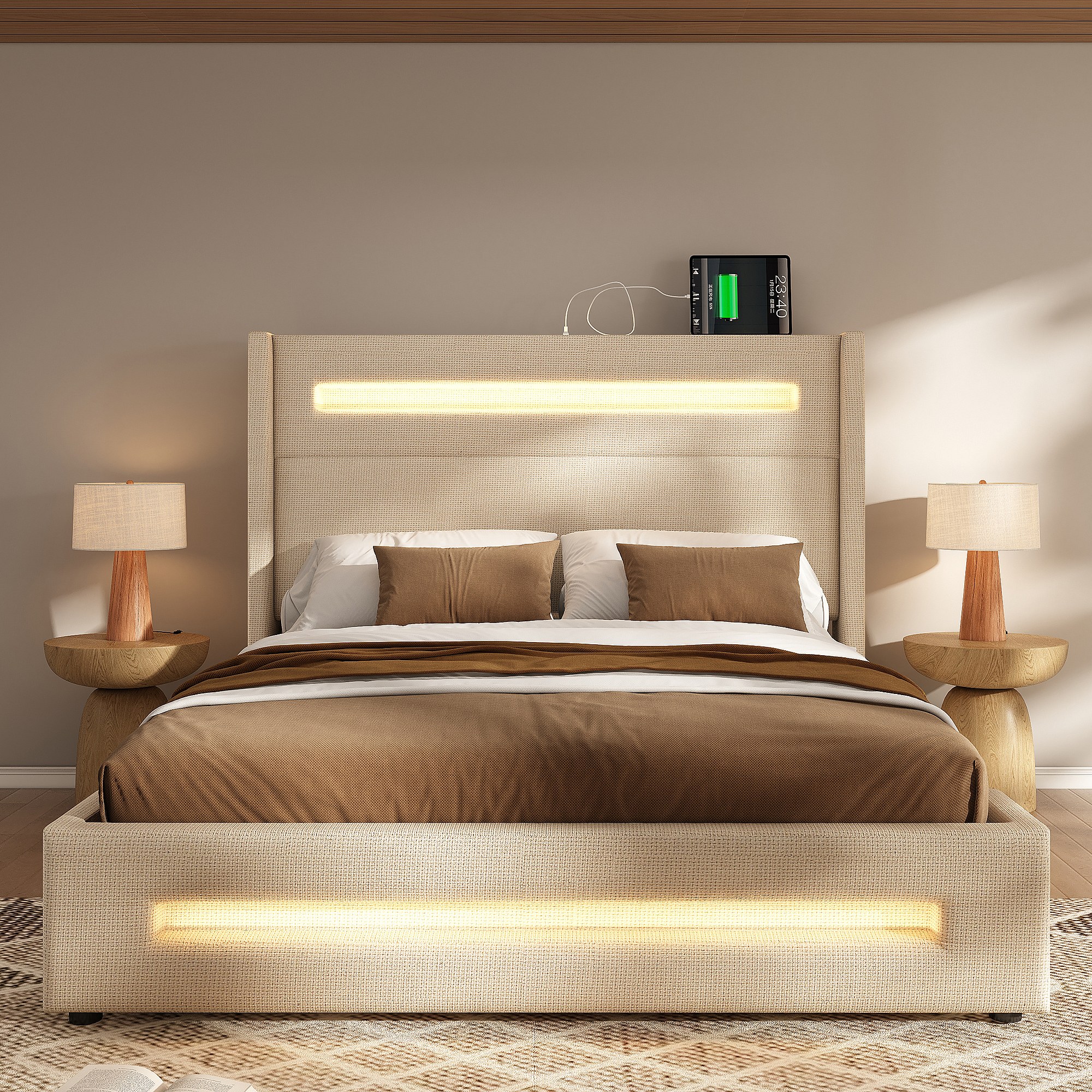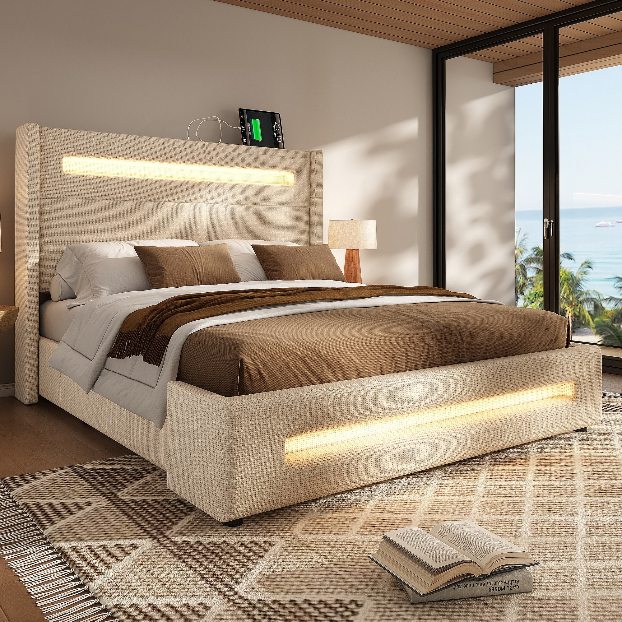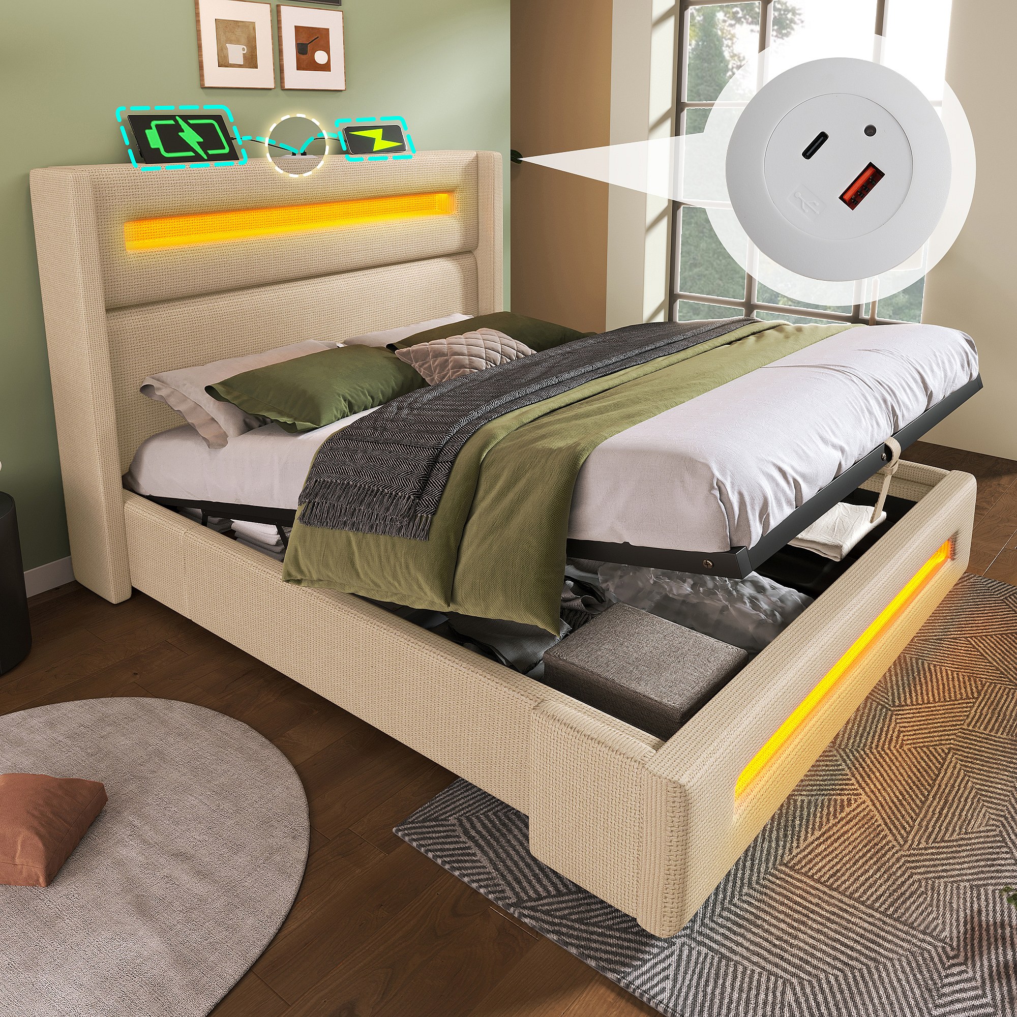 Lit double 160x200 cm en lin beige avec LED, rangement hydraulique et ports USB