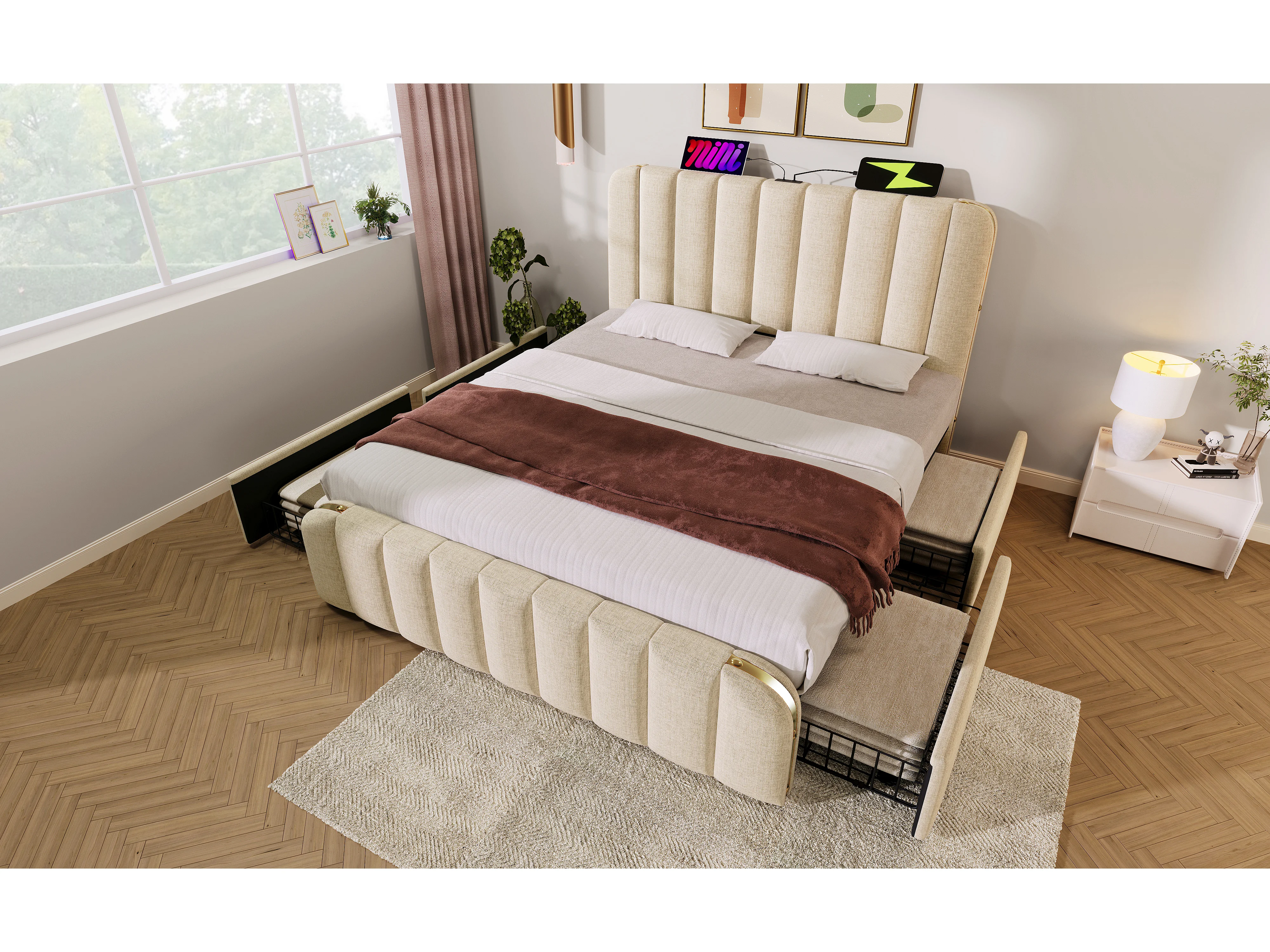Lit double 160×200 cm en lin beige avec tête de lit rembourrée, 4 tiroirs et ports USB intégrés