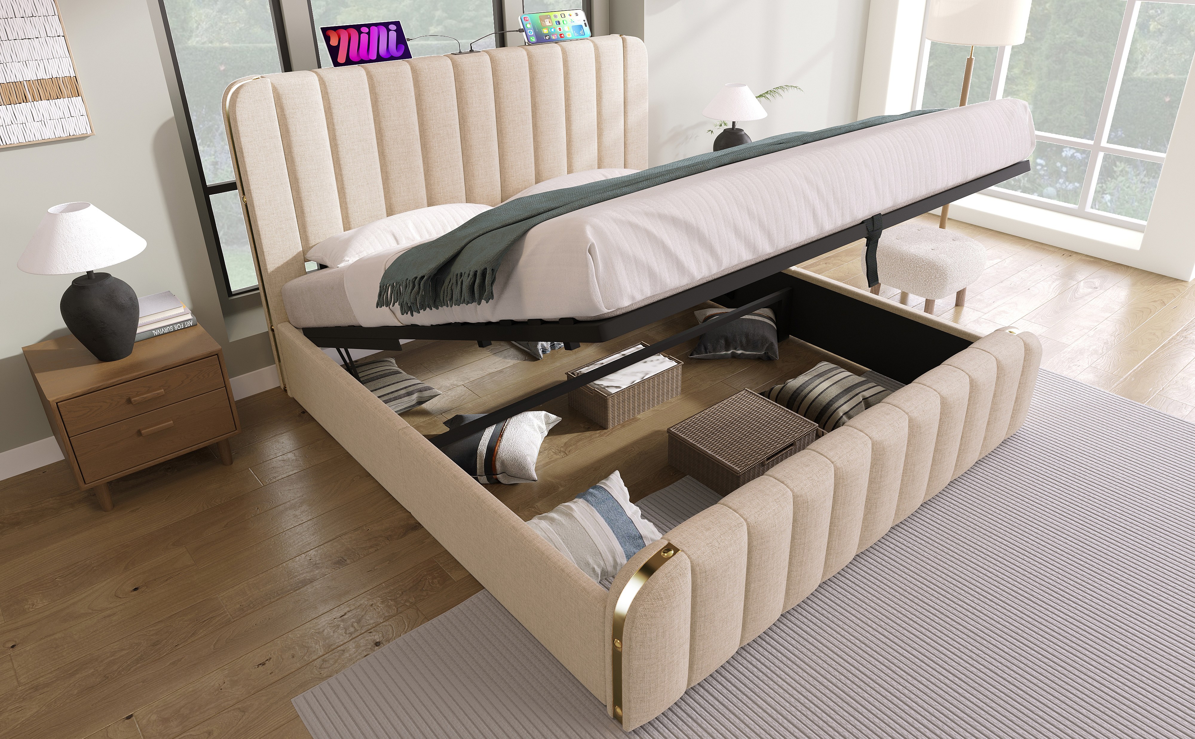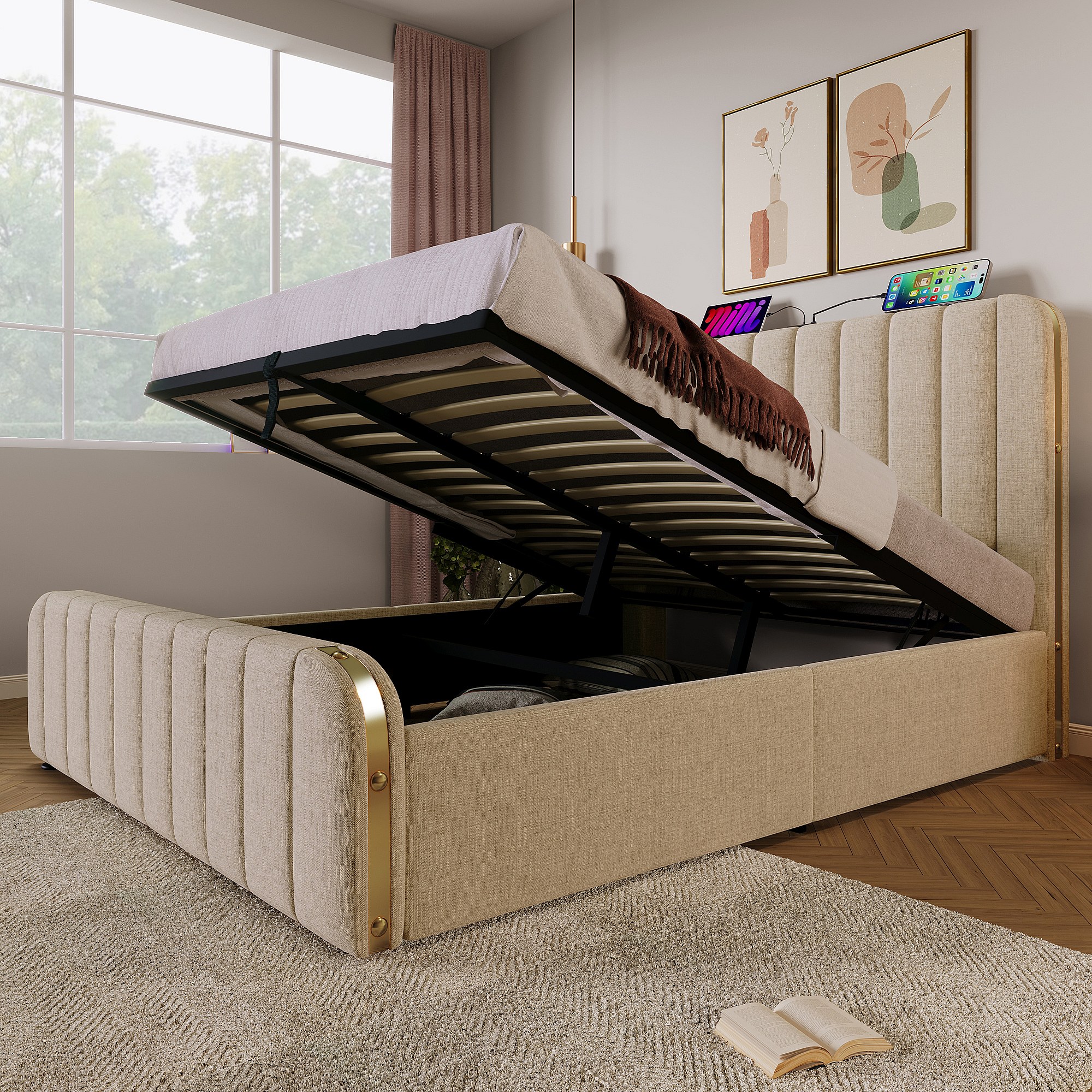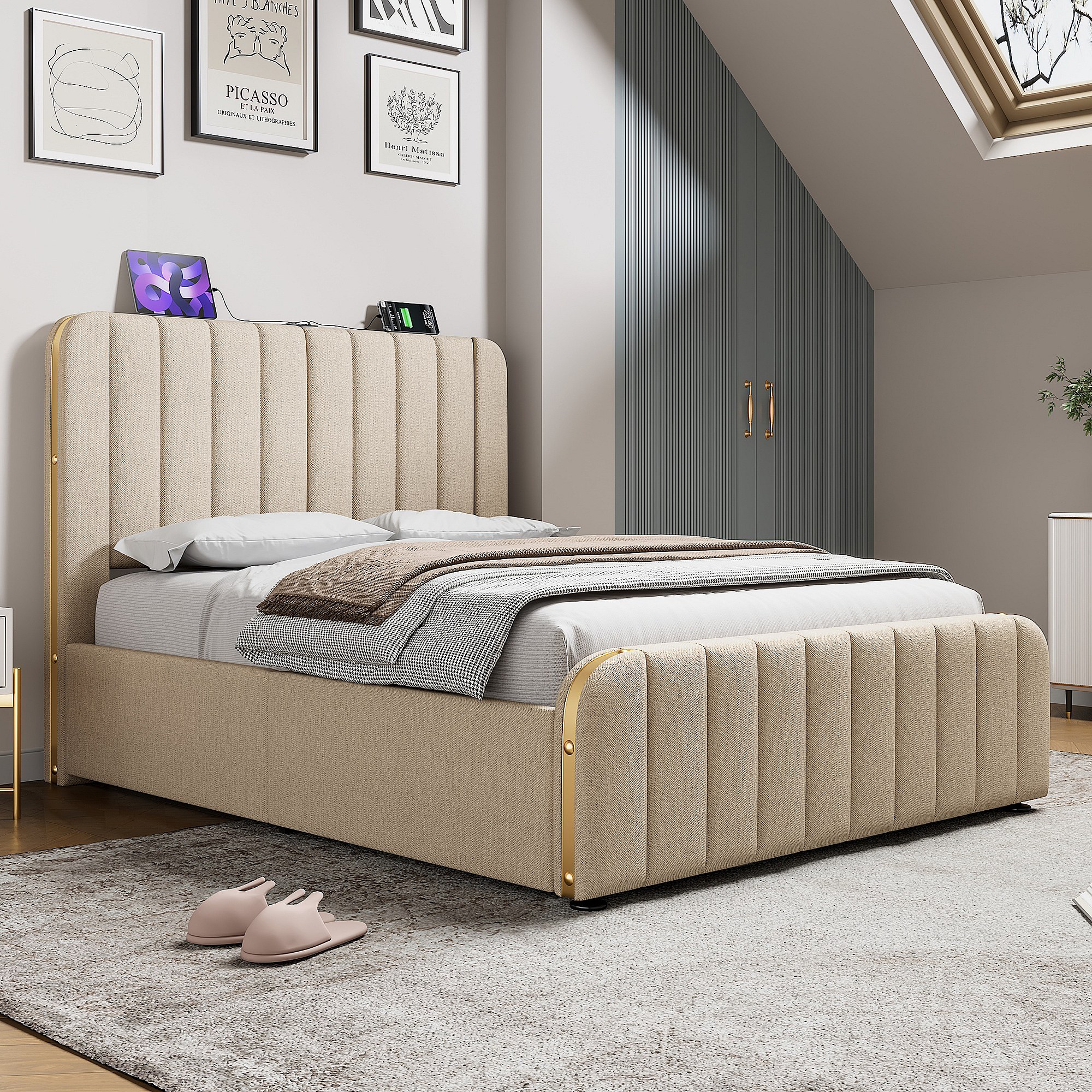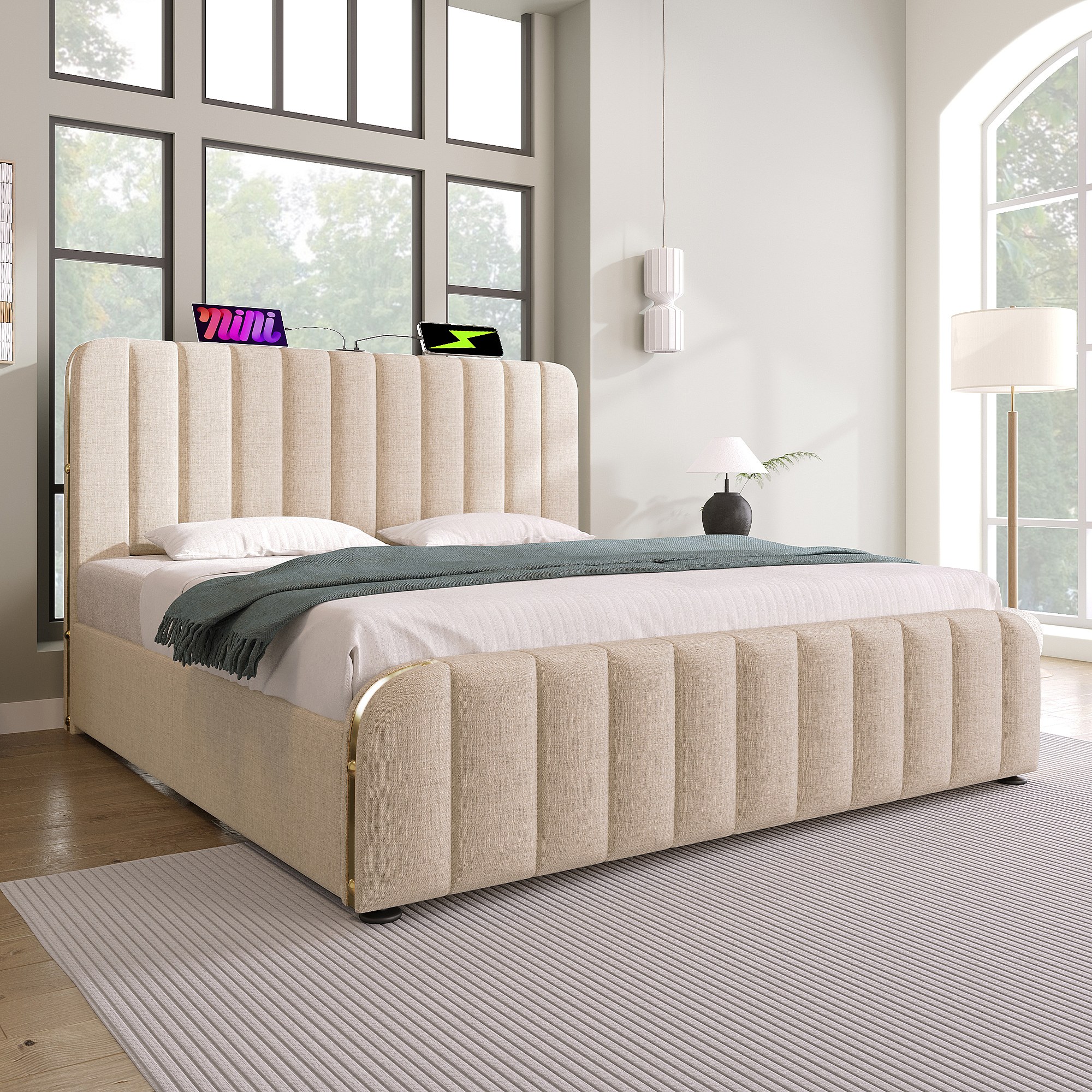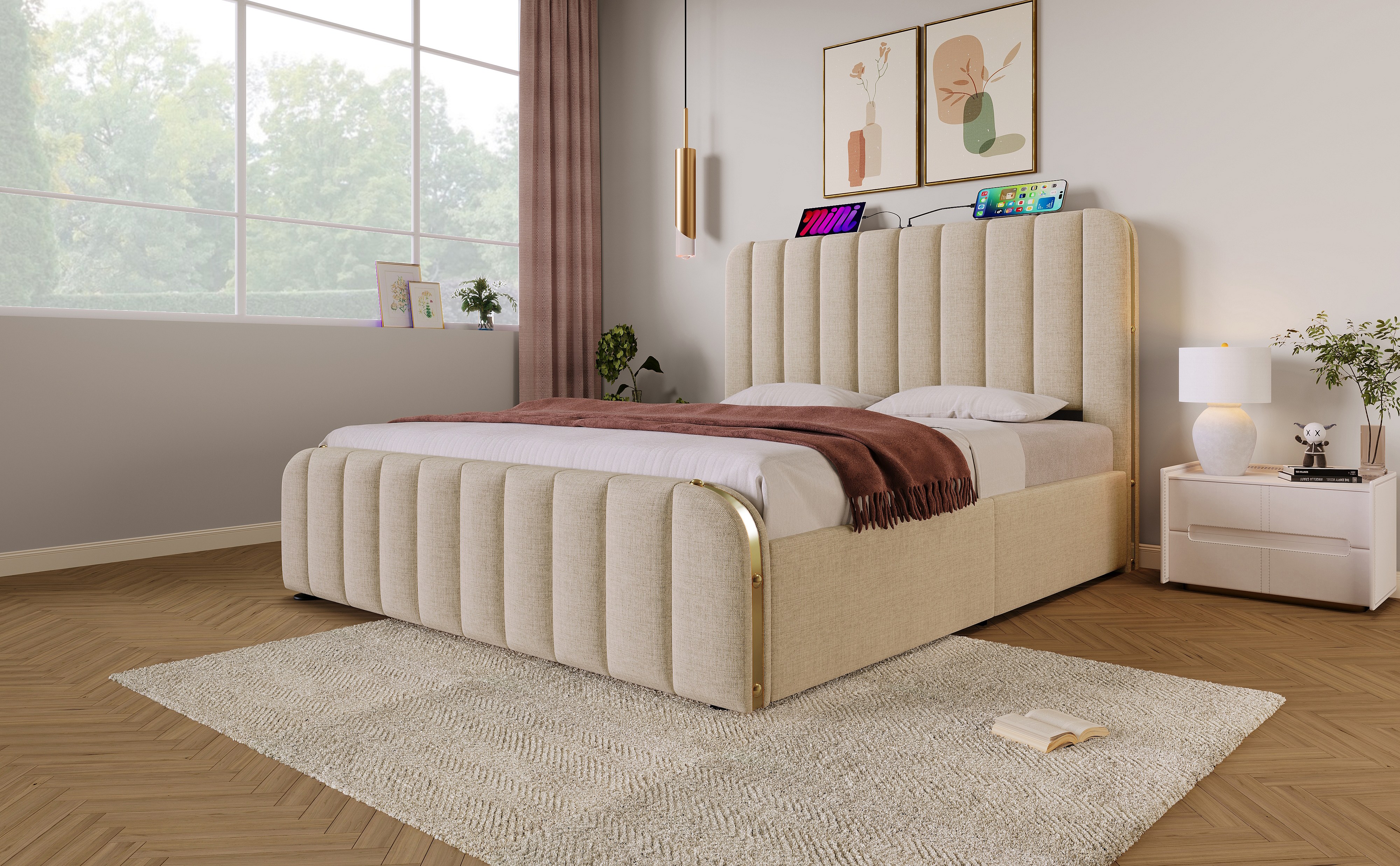 Lit double 160×200 cm en lin beige avec tête de lit rembourrée et ports USB intégrés