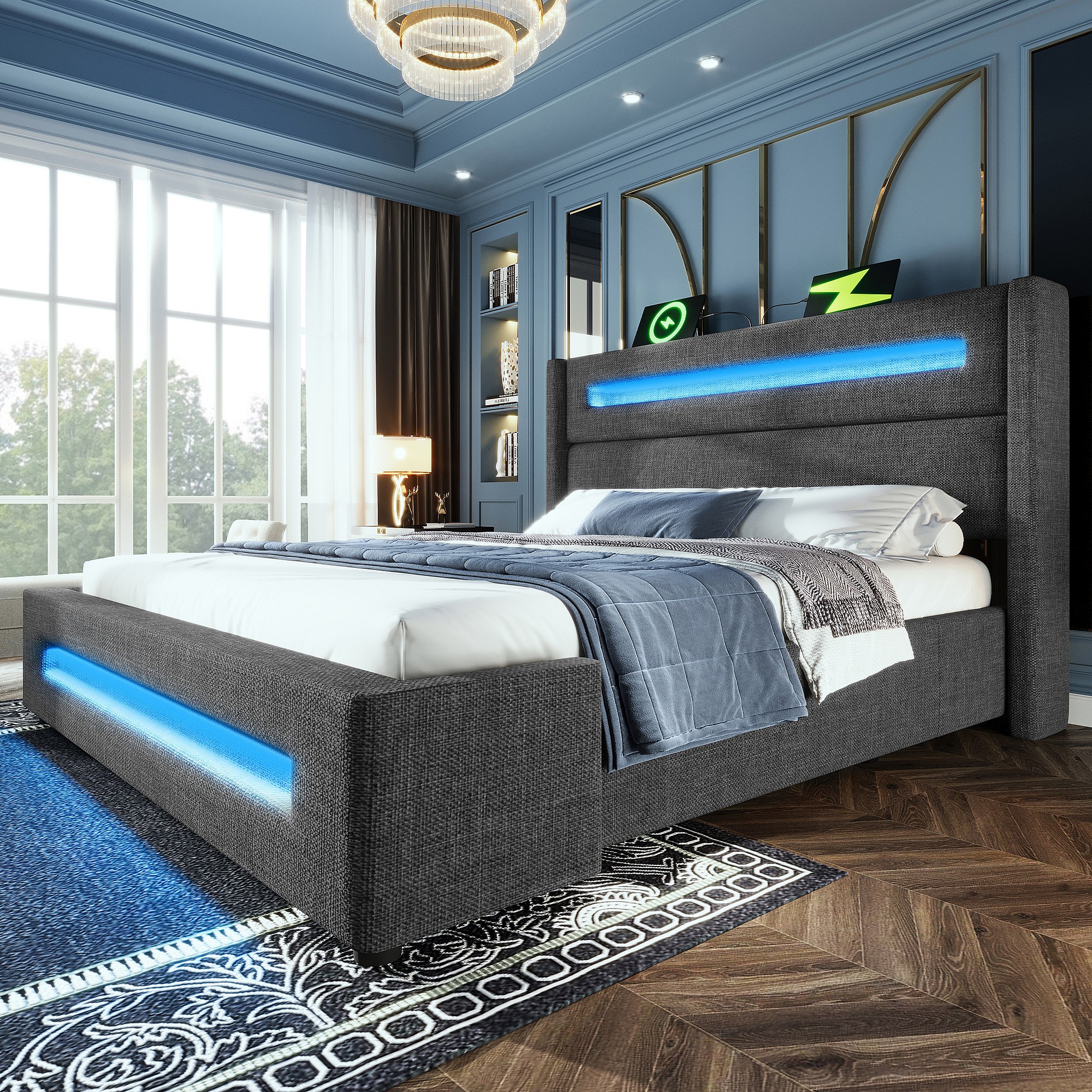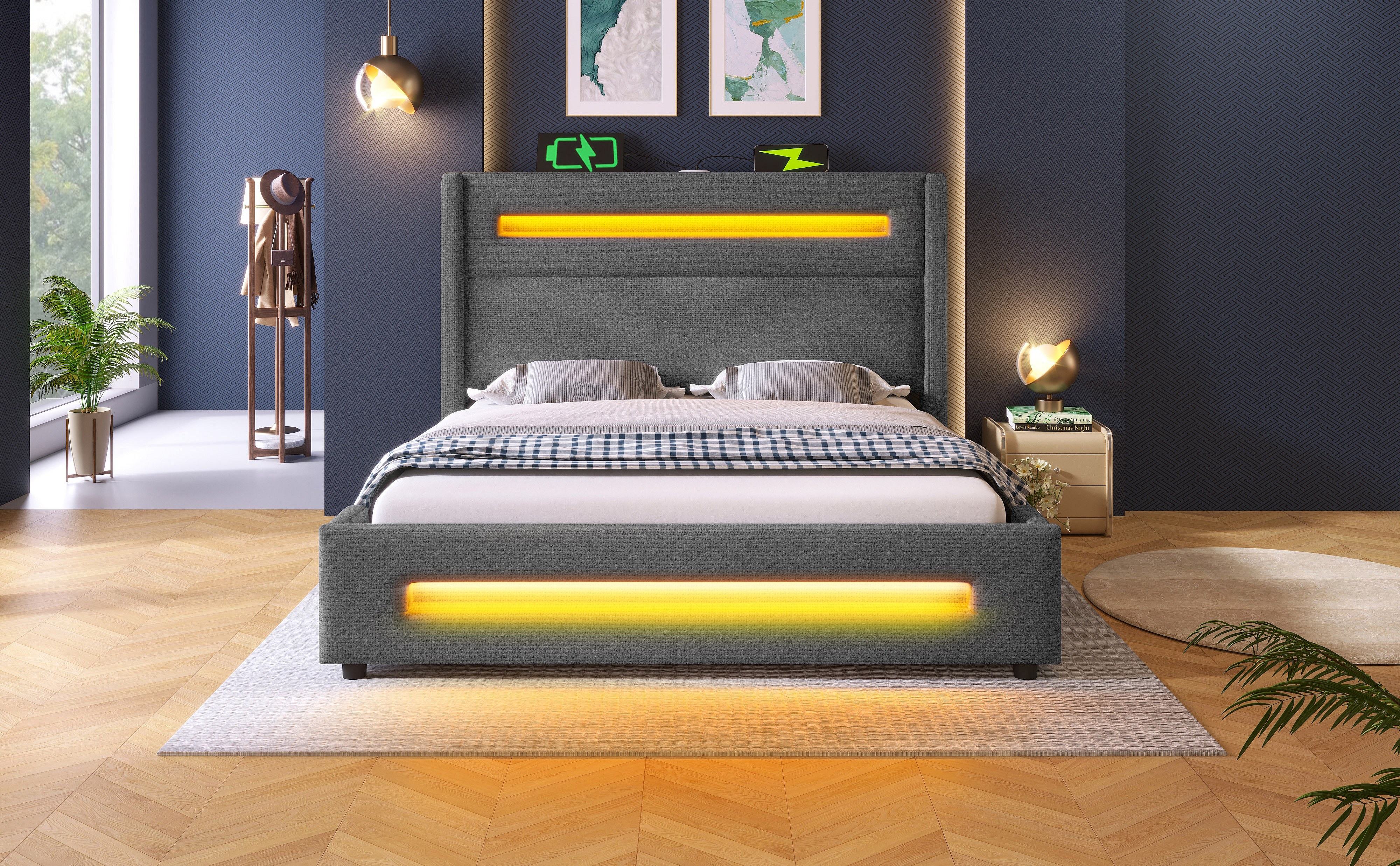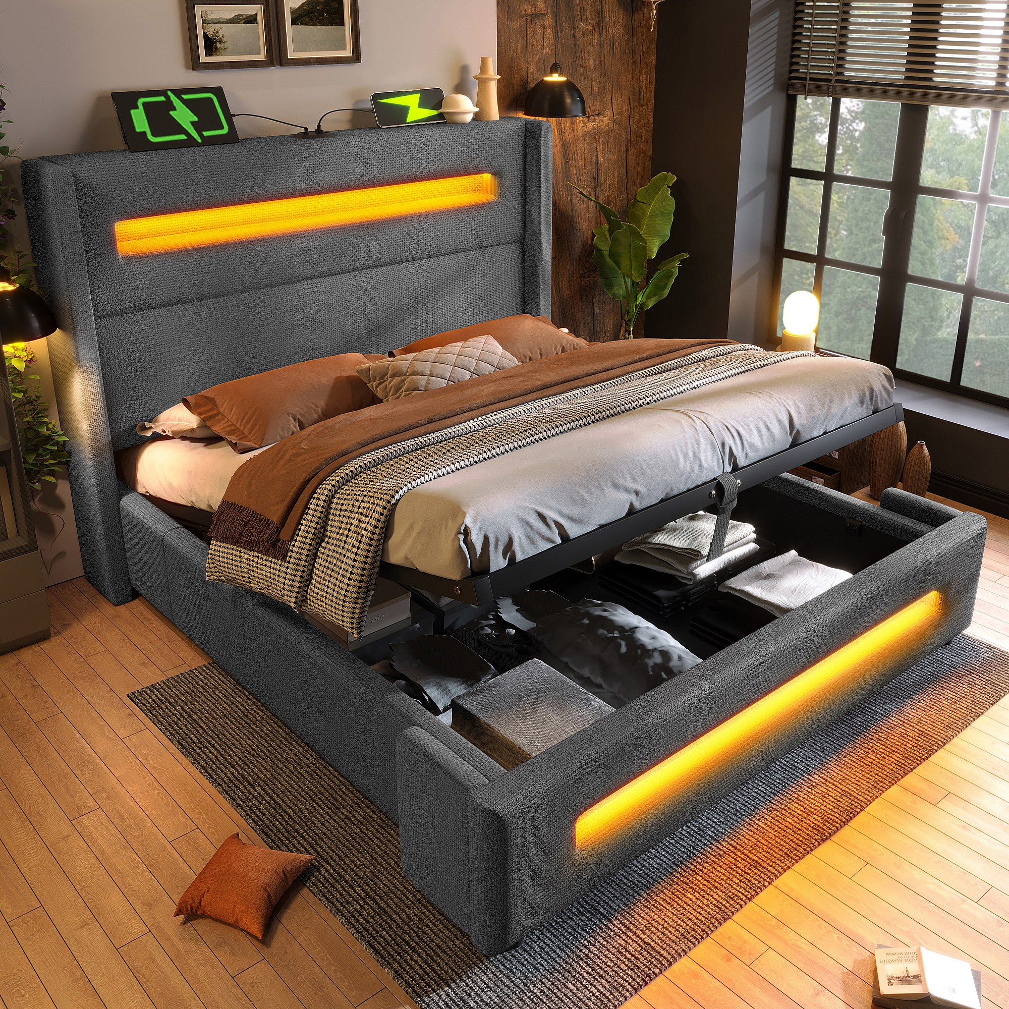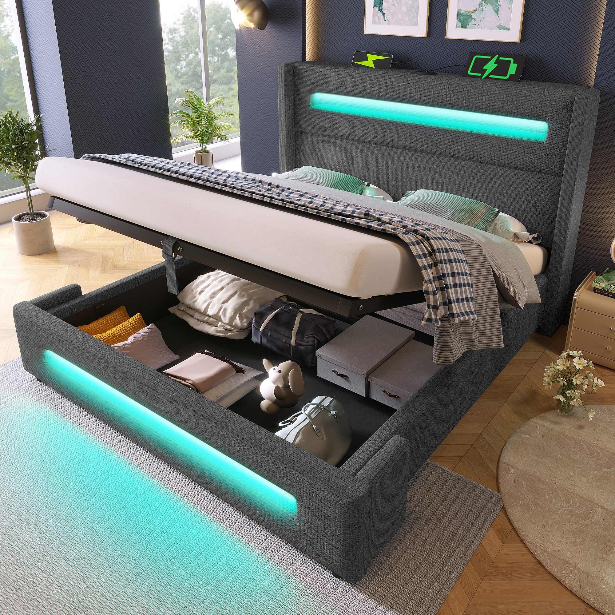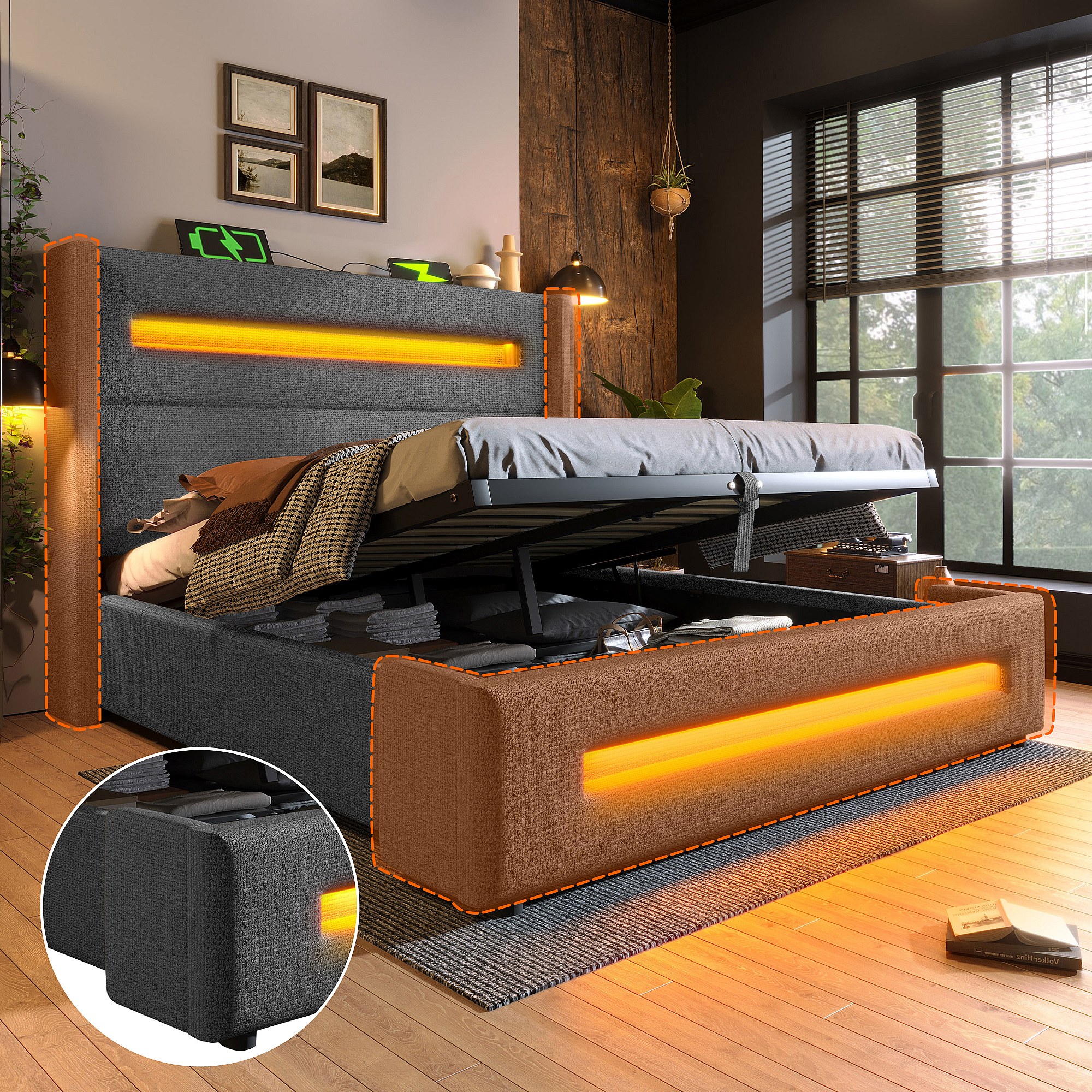Lit double 160x200 cm en lin gris avec LED, lit de rangement hydraulique et ports USB