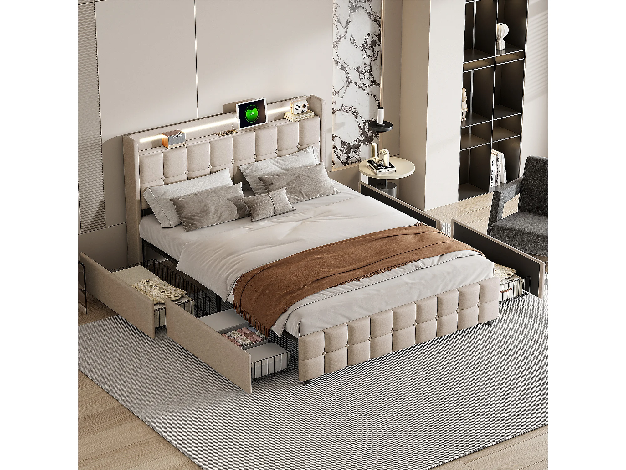Cadre de lit capitonné 160*200cm, 4 tiroirs avec recharge USB, chevet avec LED, lin,gris