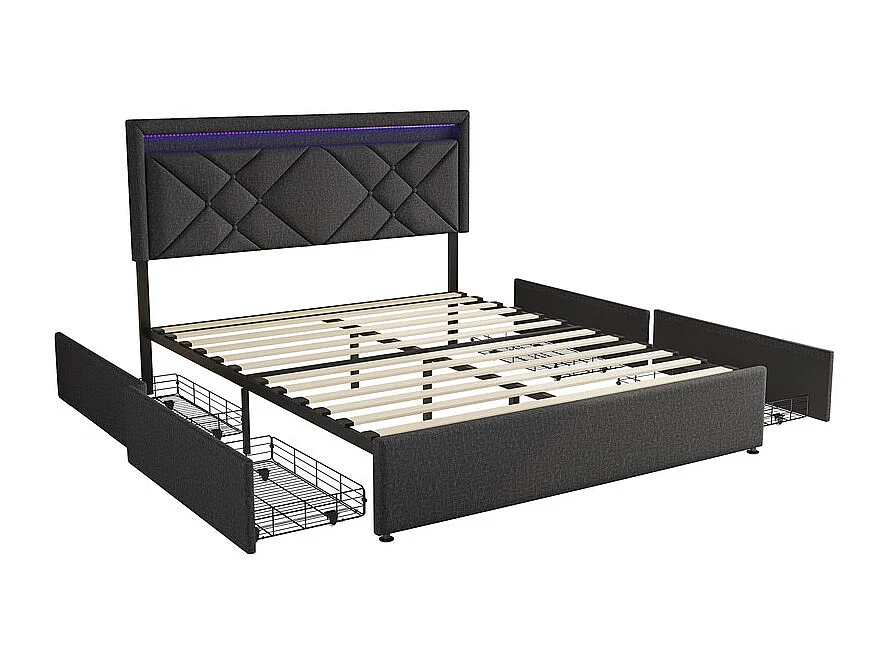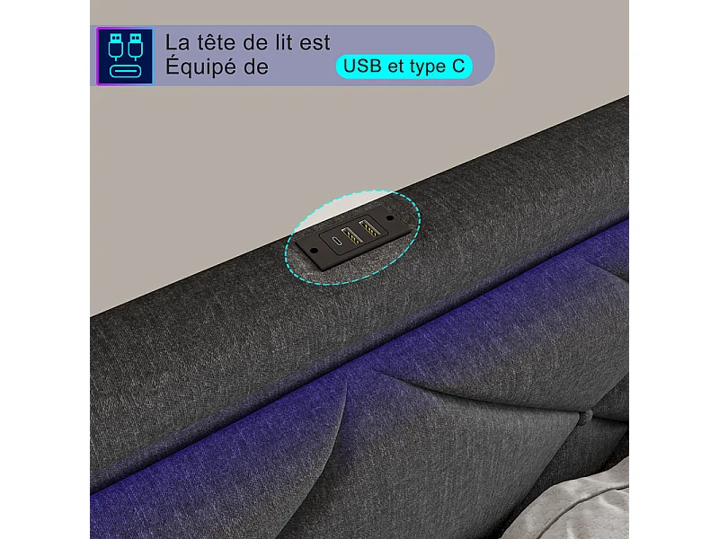 Lit Double 160x200, Grand Lit avec Tiroirs et Rangements, LED RGB APP, Ports USB/Type-C, Tissu Lin Gris Foncé, Lit Couple Moderne