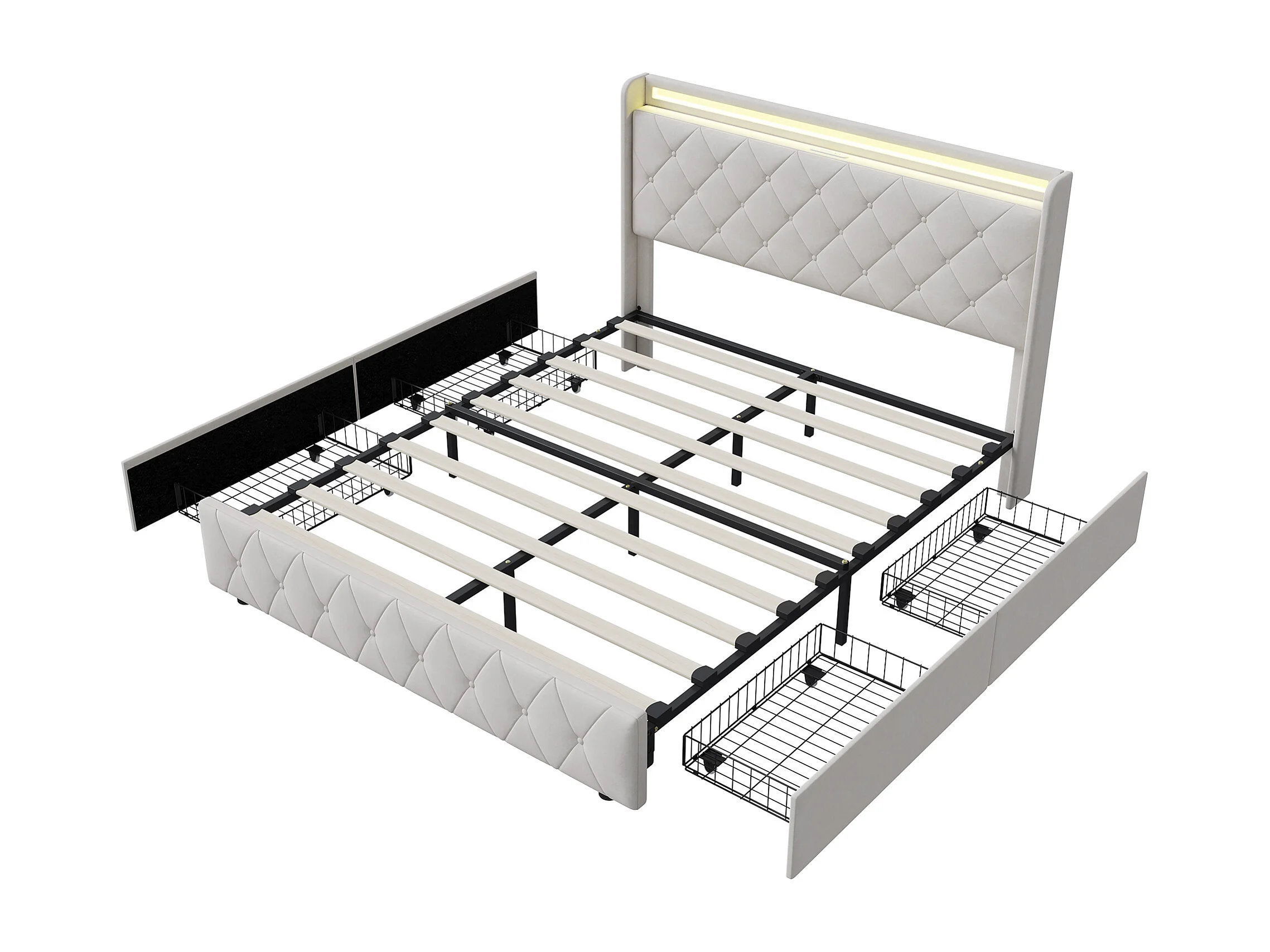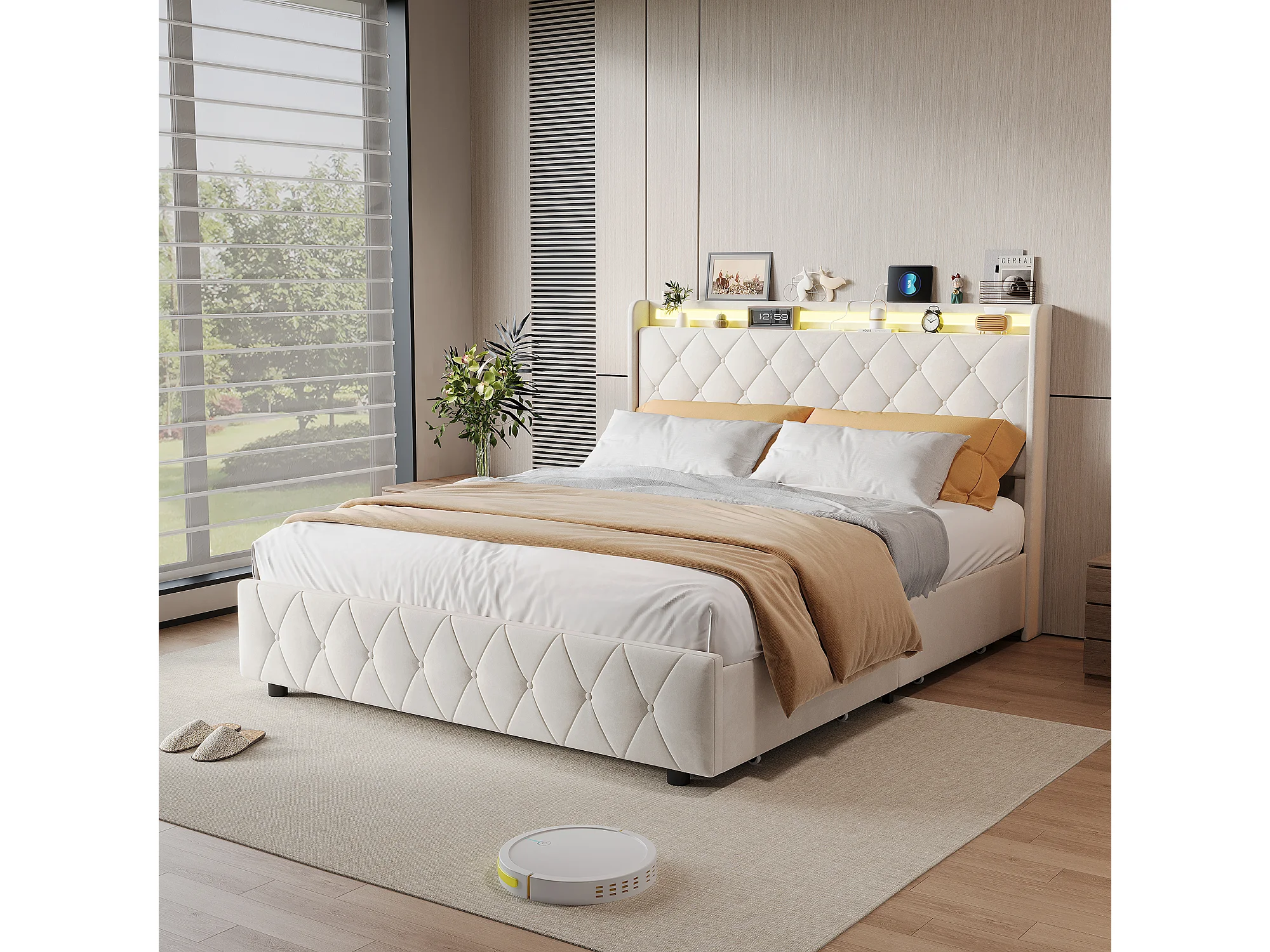 Lit double 160x200cm avec 4 tiroirs - LED et ports USB - tête de lit avec rangement - velours - beige