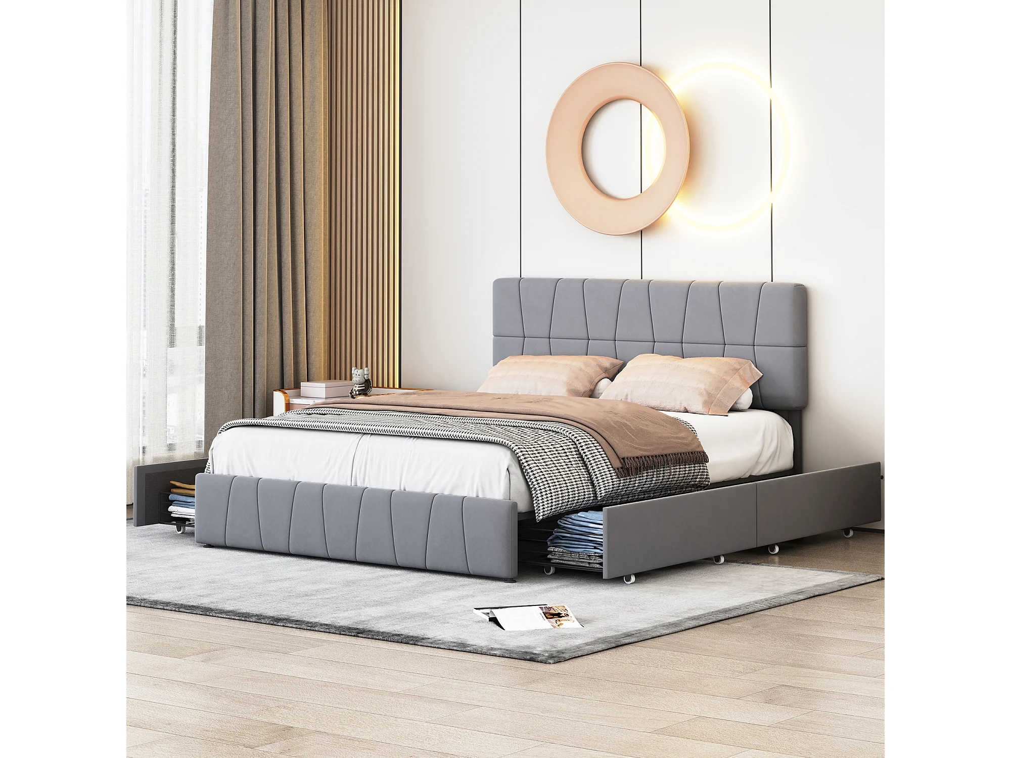 Lit double 160x200cm - avec rangement 4 tiroirs, lit avec sommier à lattes et cadre en métal - tête de lit réglable en hauteur - velours - gris