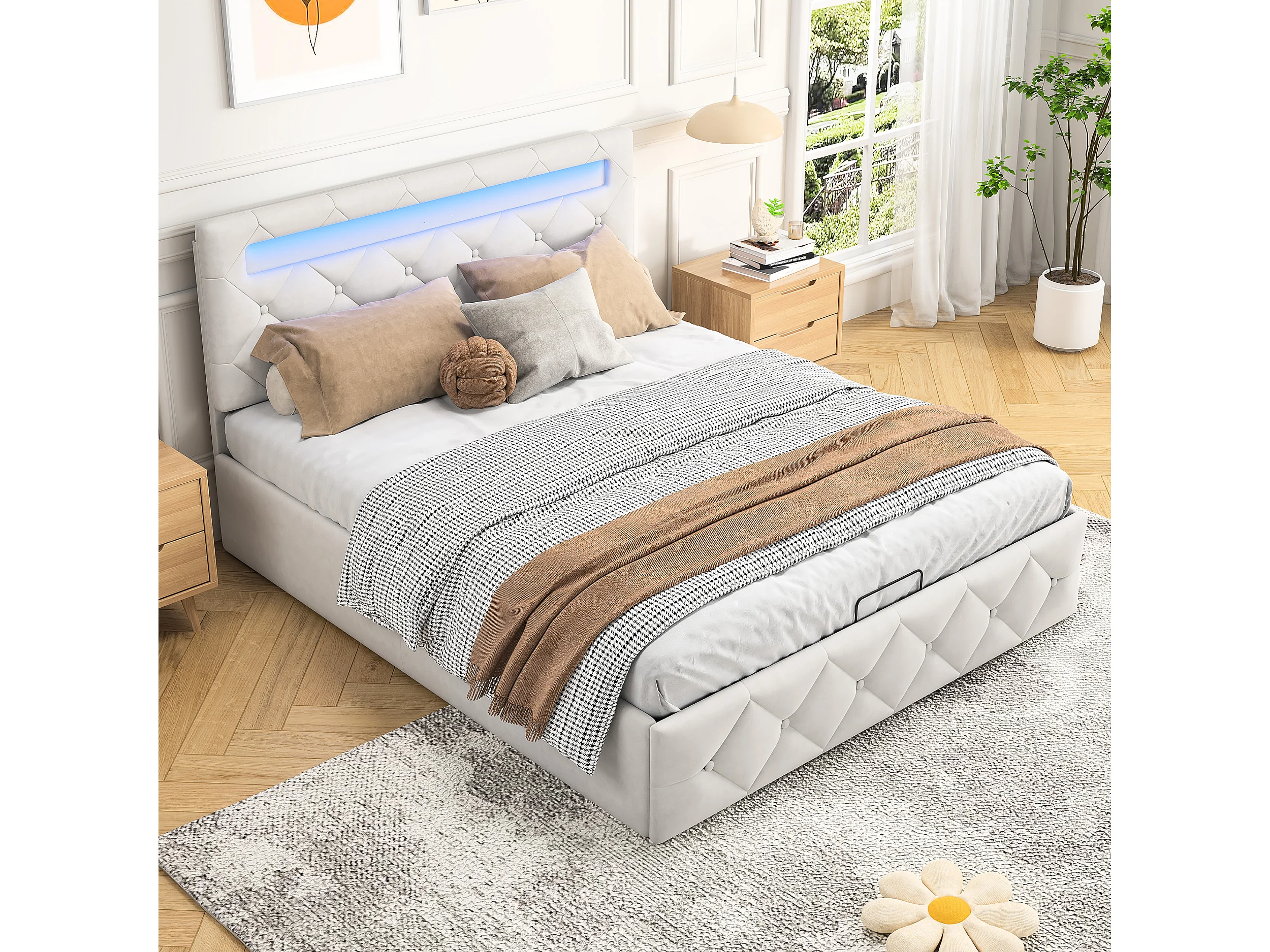 Lit double 160x200cm - avec rangement hydraulique et sommier à lattes - tête de lit avec bandeau LED - velours - beige
