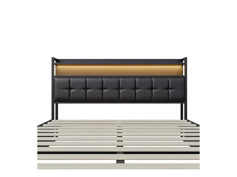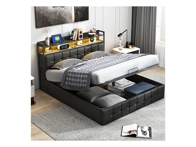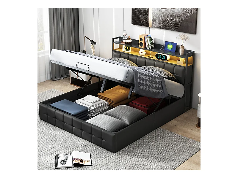 Lit Double 160x200cm Gris Tissu Lin Coffre Hydraulique LED RGB App et Télécommande Prise USB/Type-C Écologique Grand Modèle
