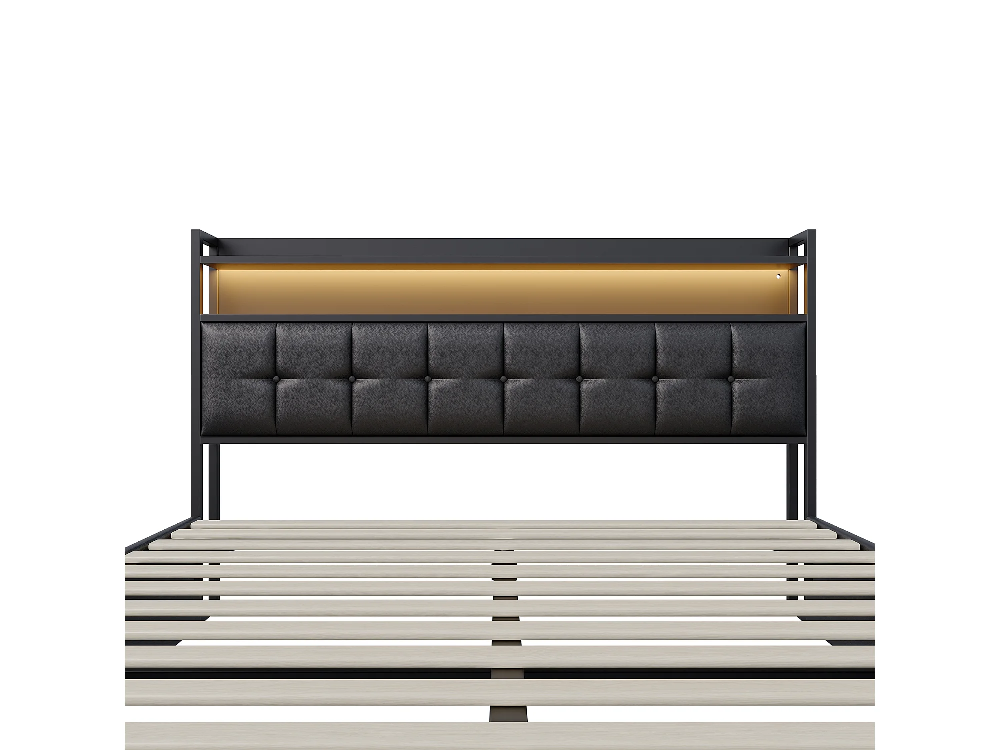 Lit Coffre Adulte 140×190cm En Simili Cuir - Avec Éclairage RGB + Ports USB/Type-C + Coffre Hydraulique - Sommier À Lattes - Noir