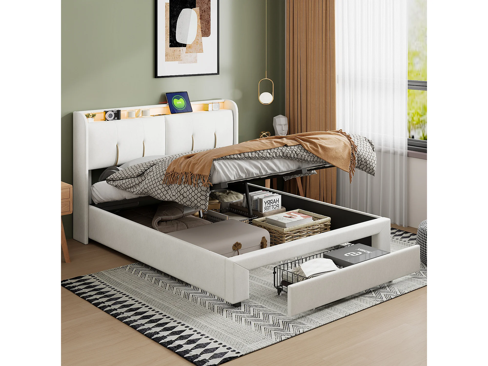 Lit double 160x200cm - Tête de lit avec LED et ports USB - Coffre de rangement hydraulique et 1 tiroir - Velours - Beige