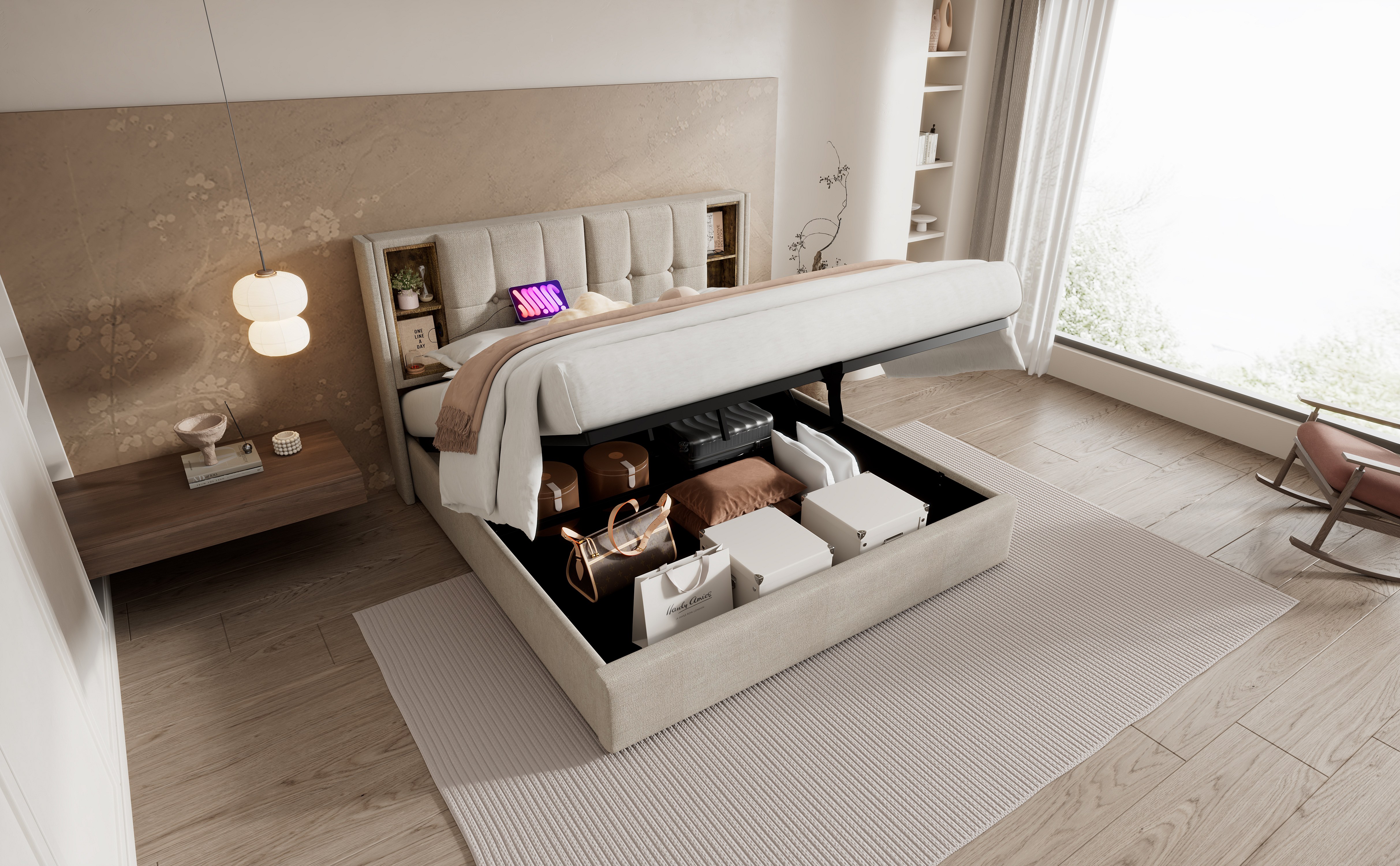 Lit double 180x200 cm avec charge sans fil et ports USB, cadre de lit en lin naturel avec rangement