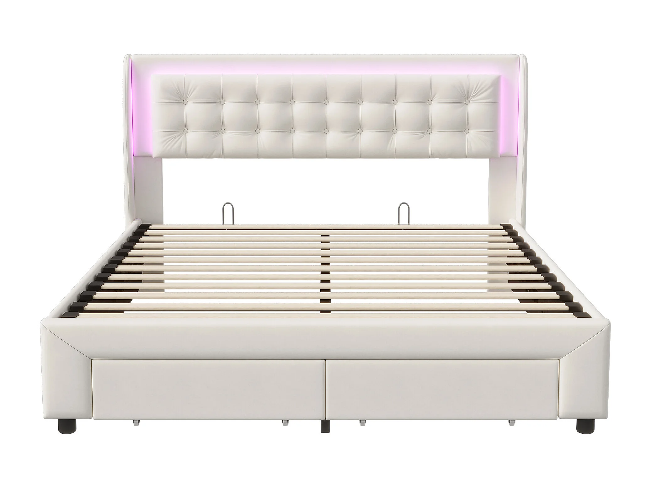 Lit double 180x200 cm avec éclairage LED - avec espace de rangement hydraulique et 2 tiroirs - Velours - Beige