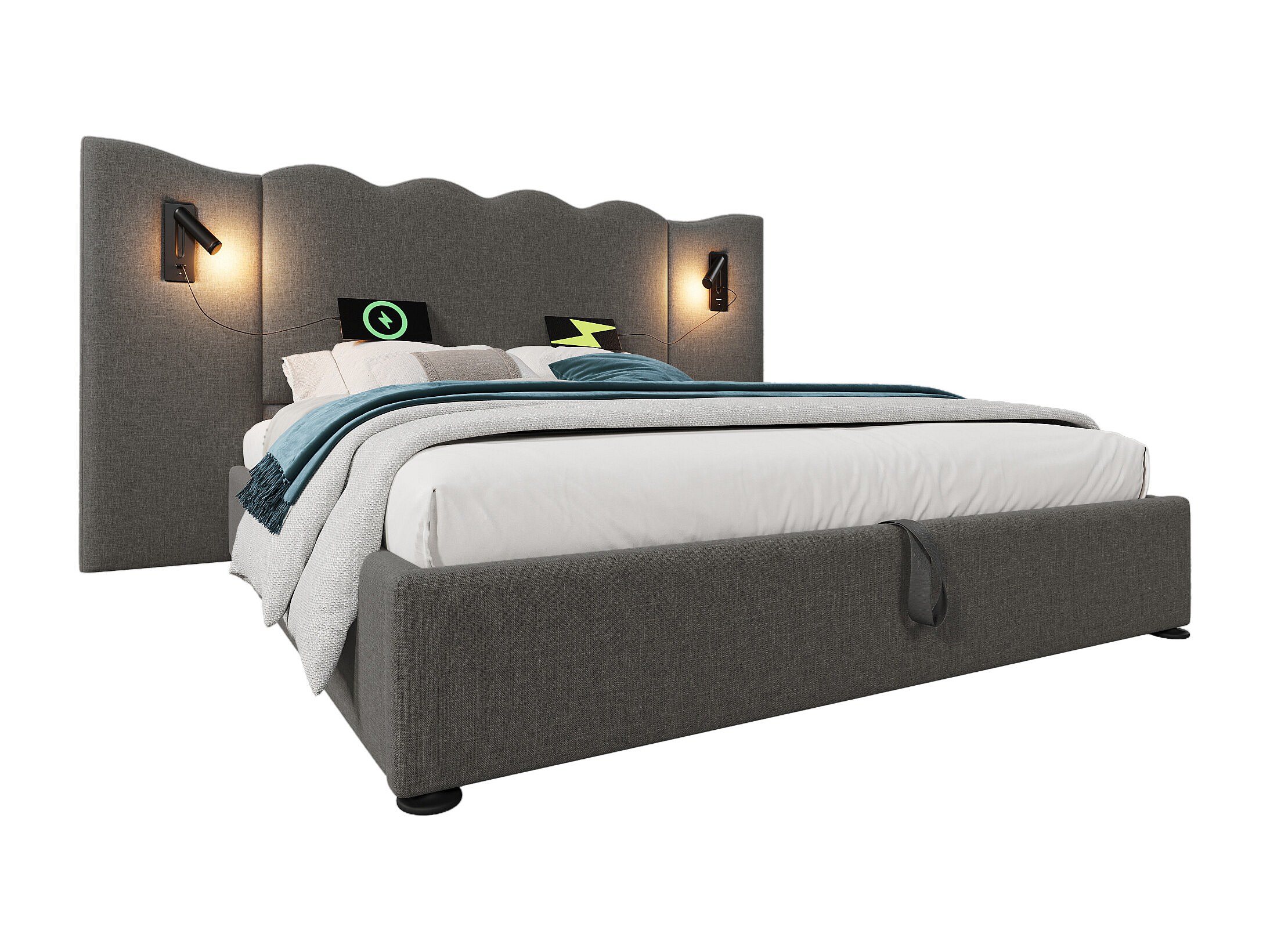 Lit double 180×200 cm avec lampe de lecture et chargeur USB Type-C, lit de rangement en bois massif et métal, gris, lin