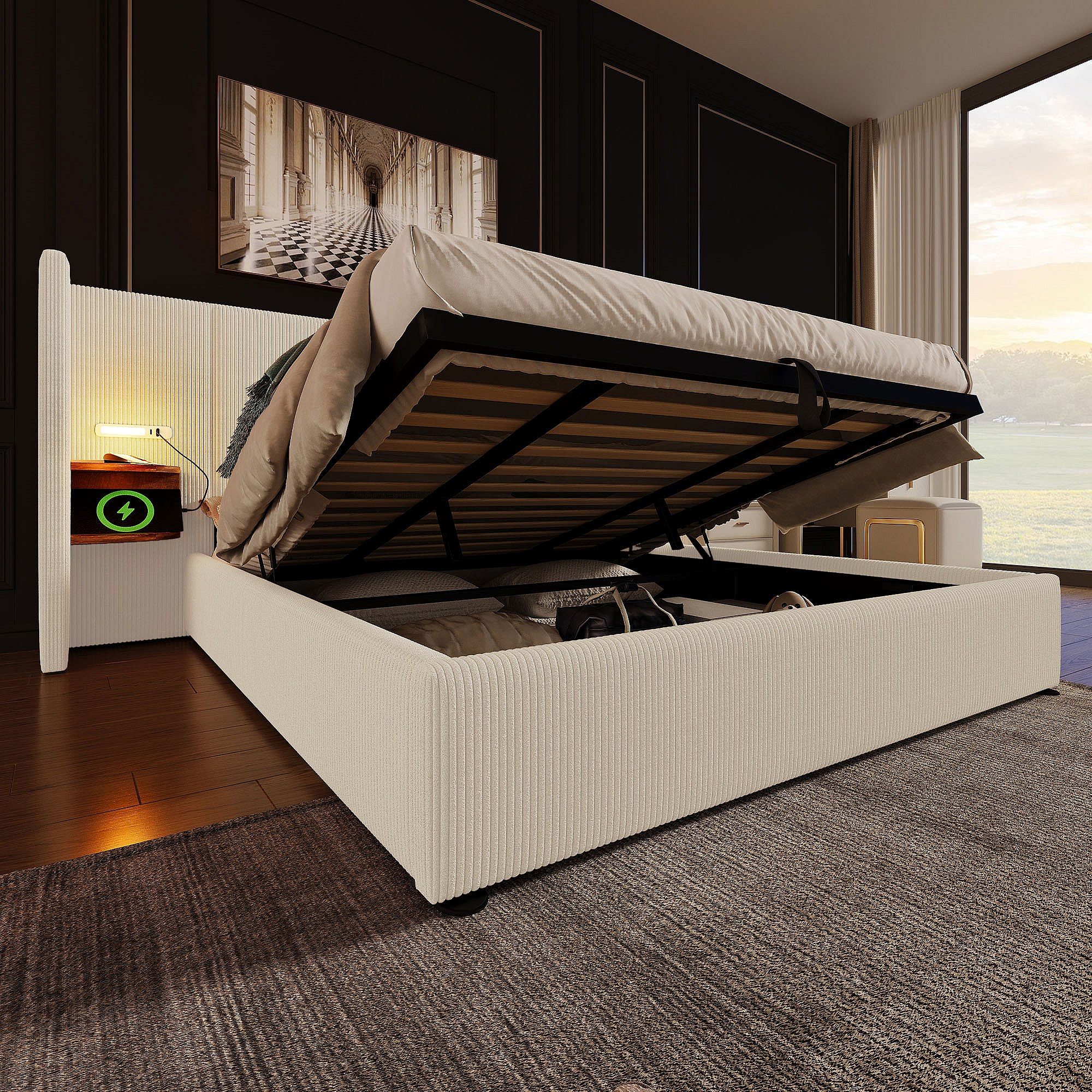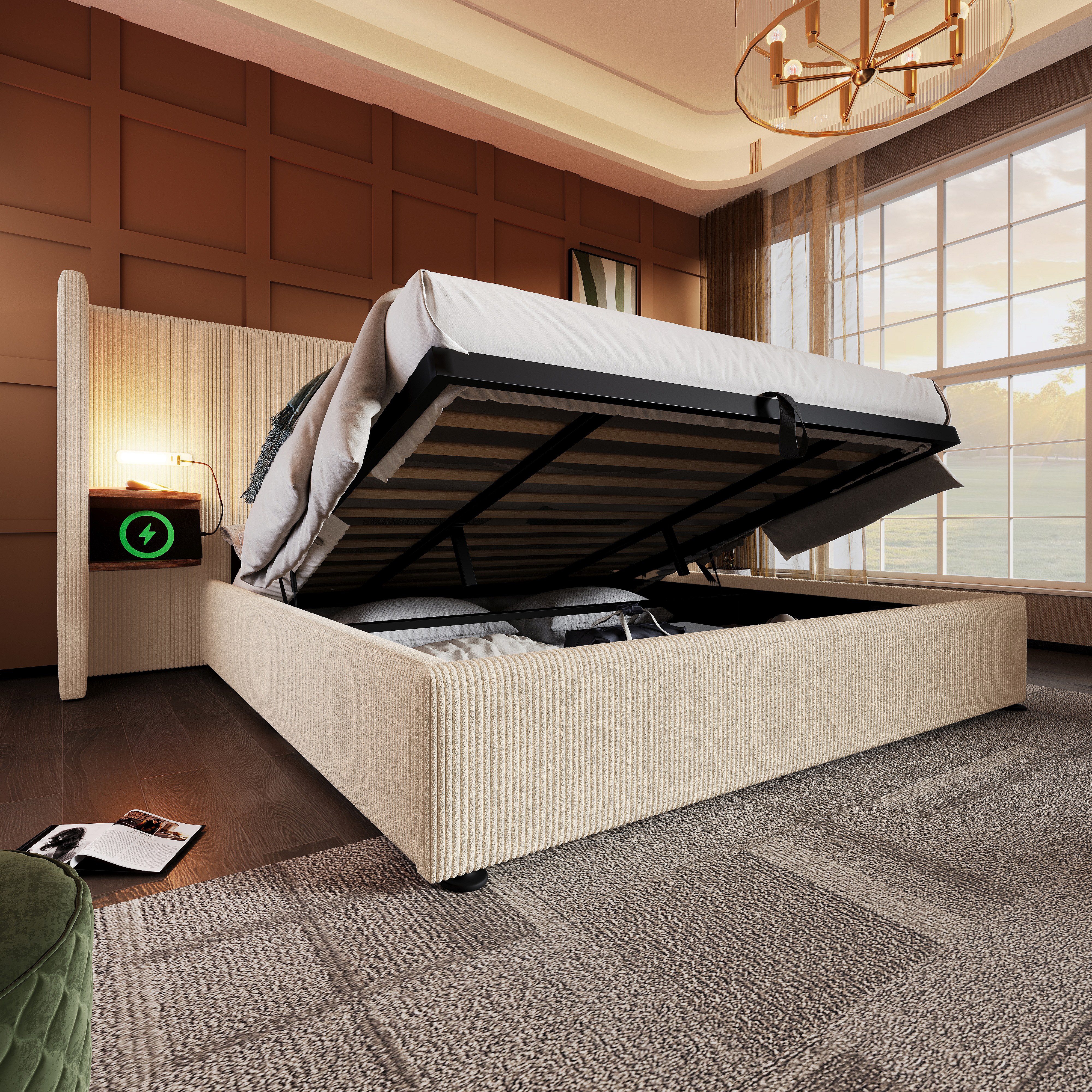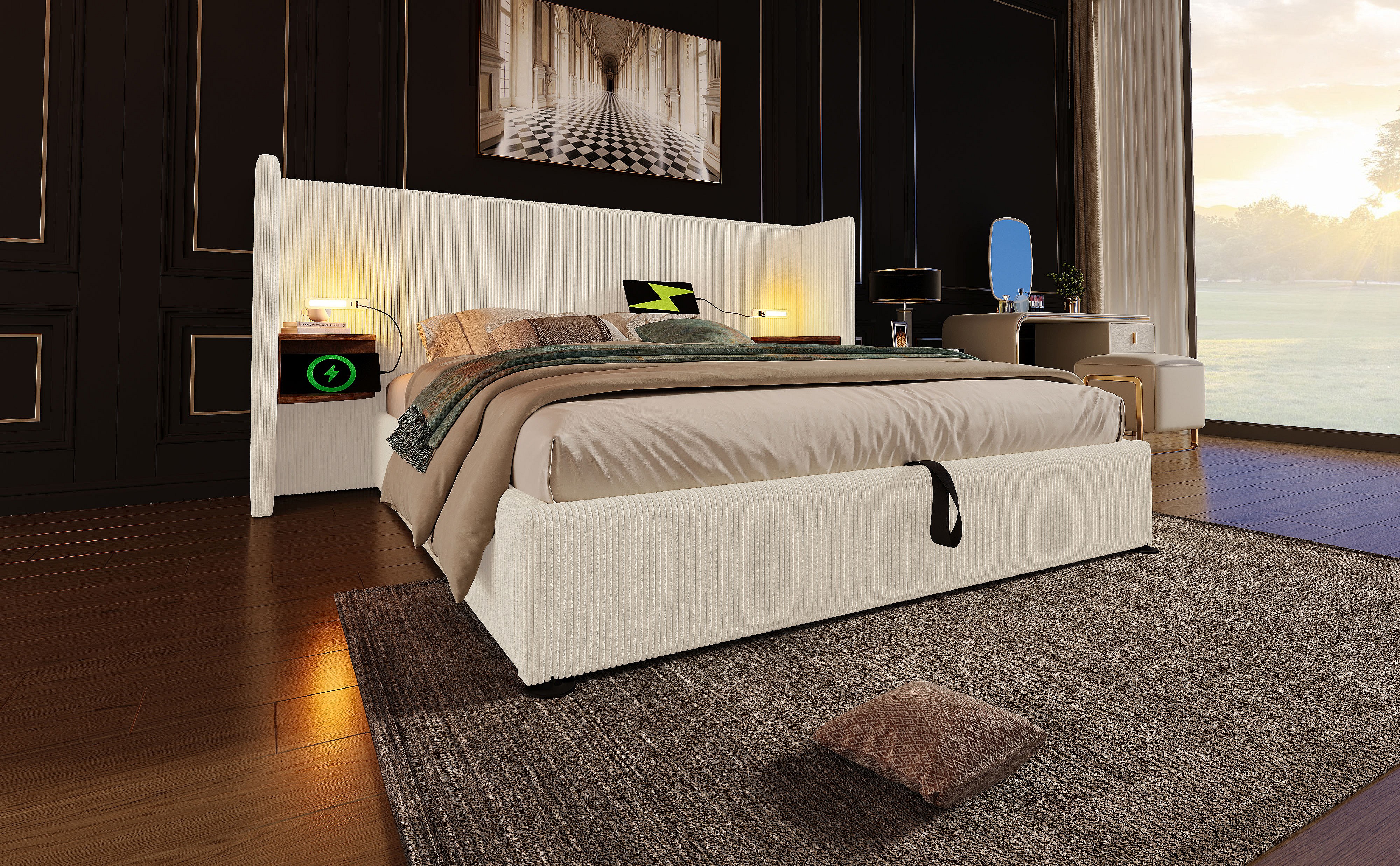 Lit double 180×200 cm avec tête de lit multifonctionnelle, lampe de lecture et ports USB Type-C, beige