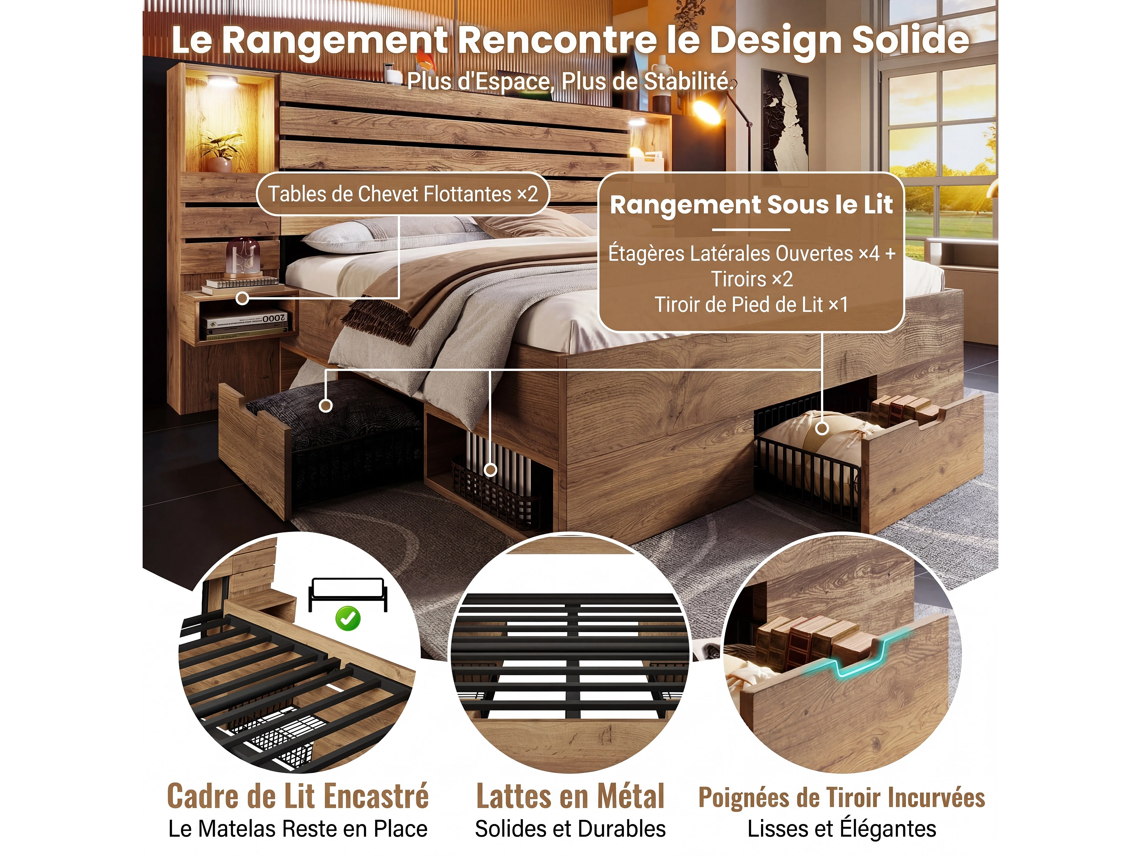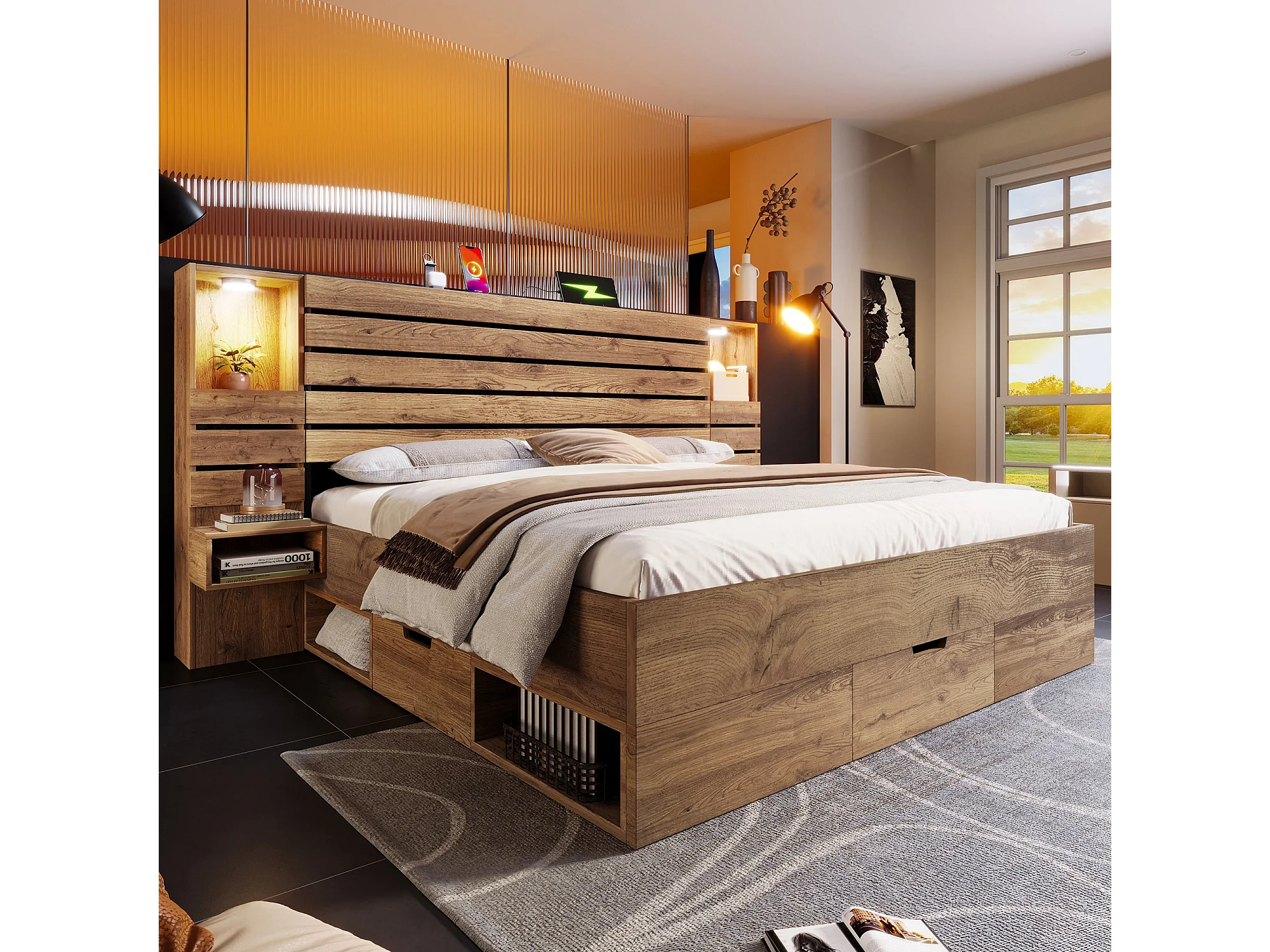 Lit double 180x200 cm bois chêne, LED, USB-C, niche lumineuse, tables de chevet, tiroirs (sans matelas)