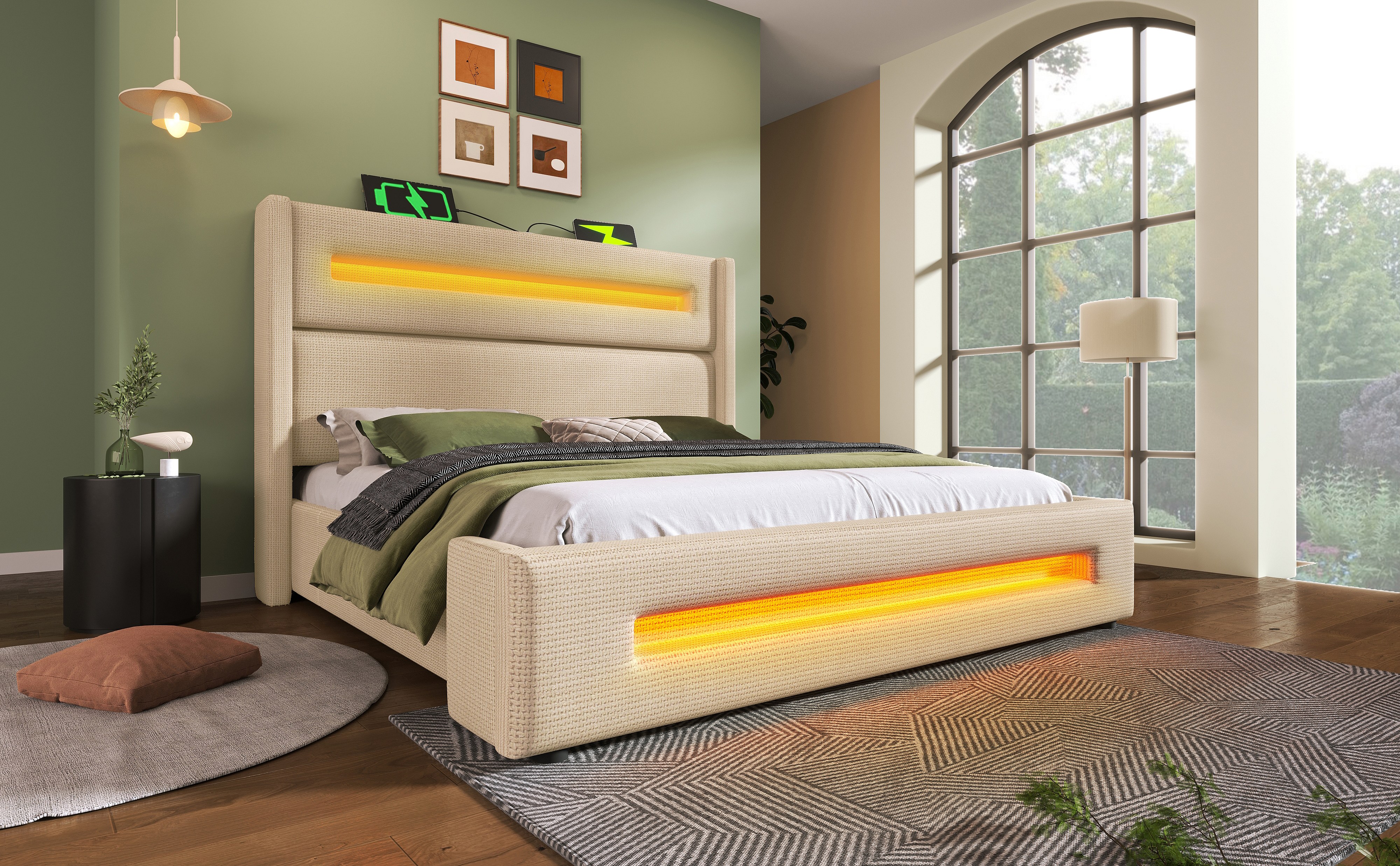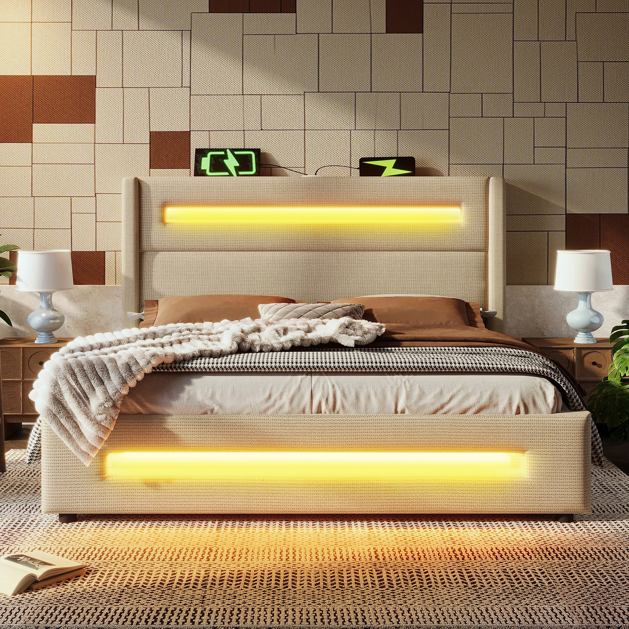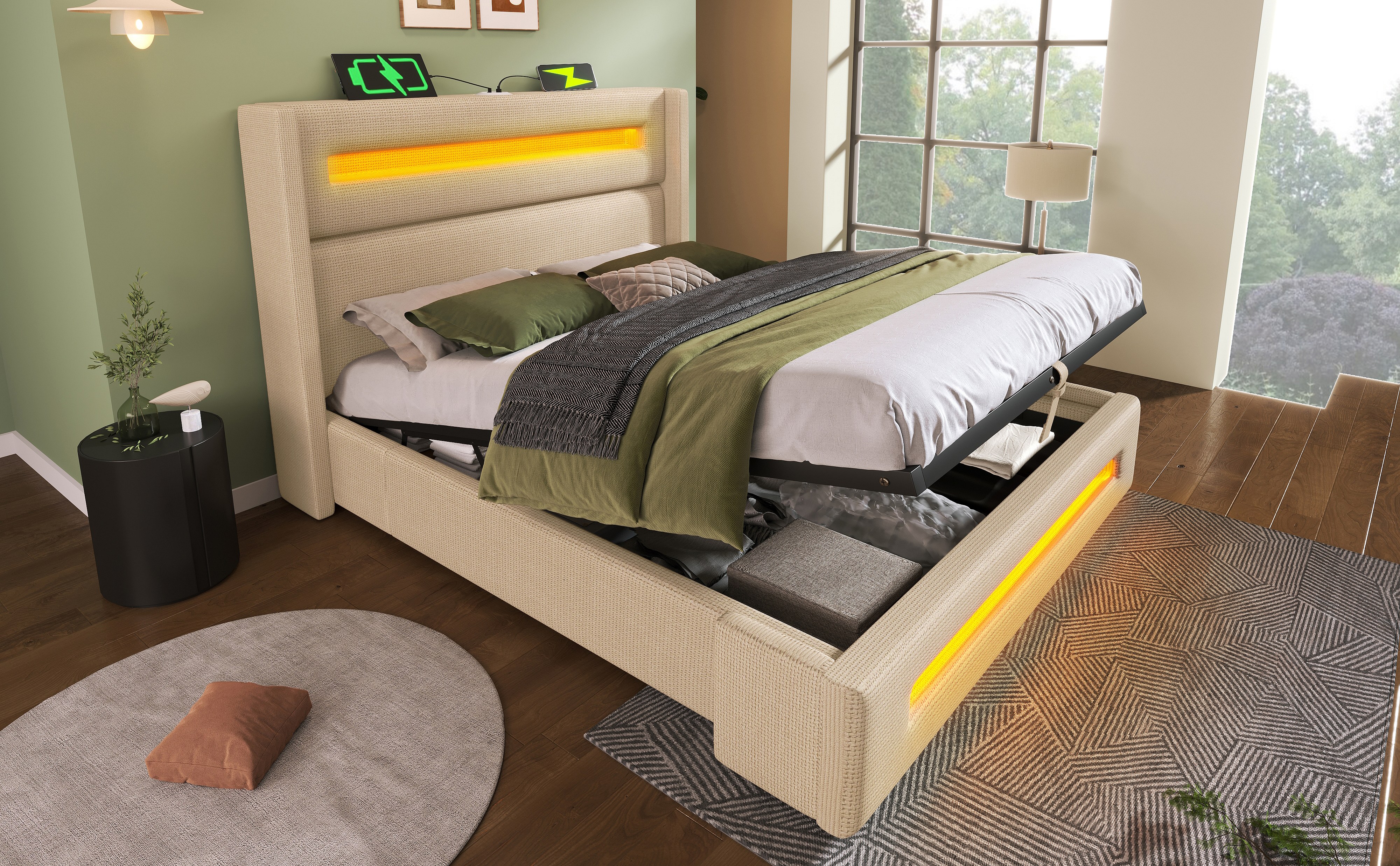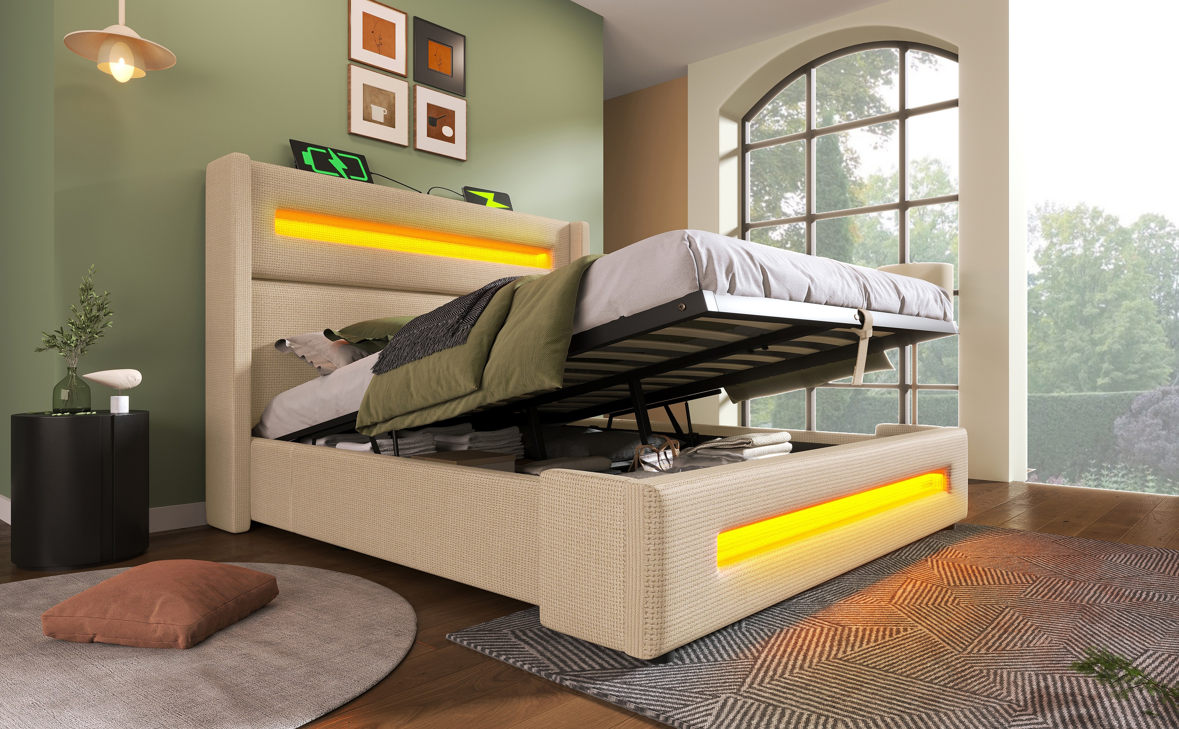 Lit double 180x200 cm en beige, lit pour adolescents avec LED, espace de rangement hydraulique et ports USB