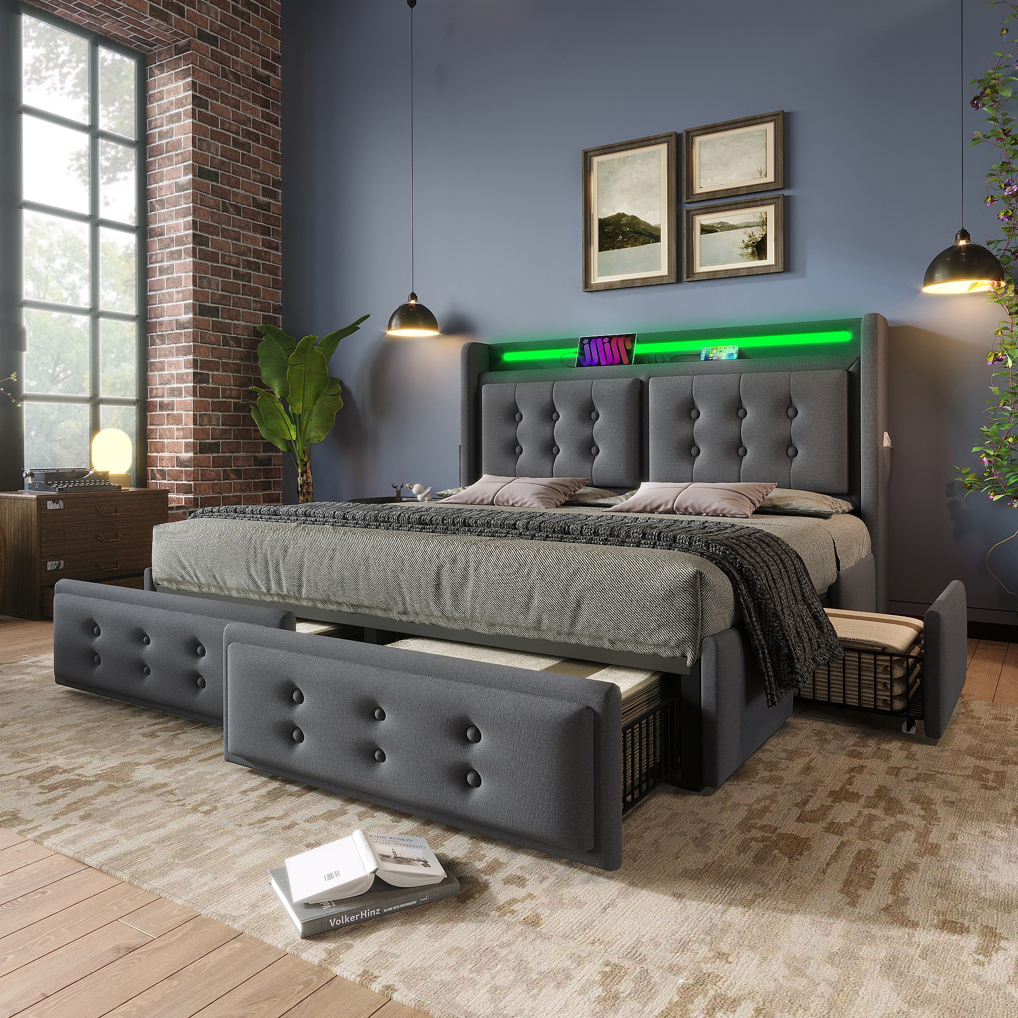 Lit double 180x200 cm en gris avec tête de lit LED et 4 tiroirs de rangement