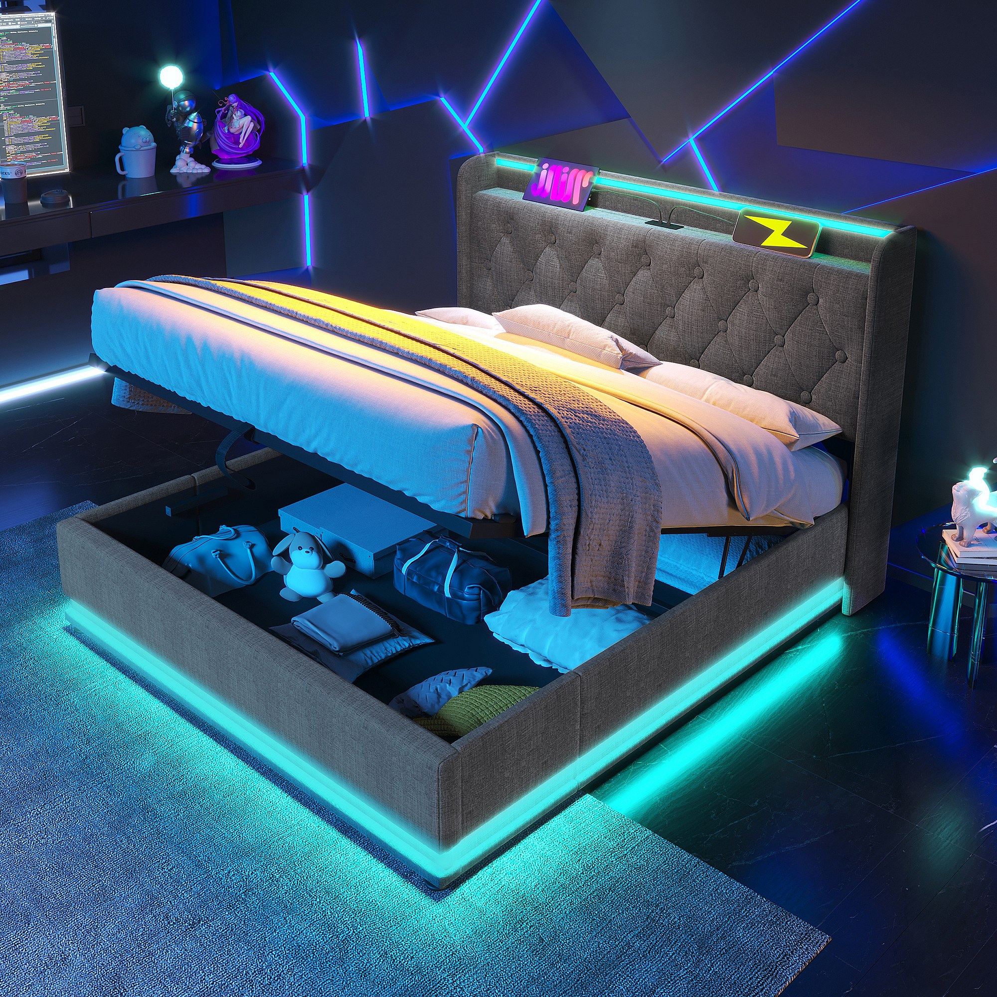 Lit double 180×200 cm en lin gris avec éclairage LED 360°, tête de lit rembourrée et port USB