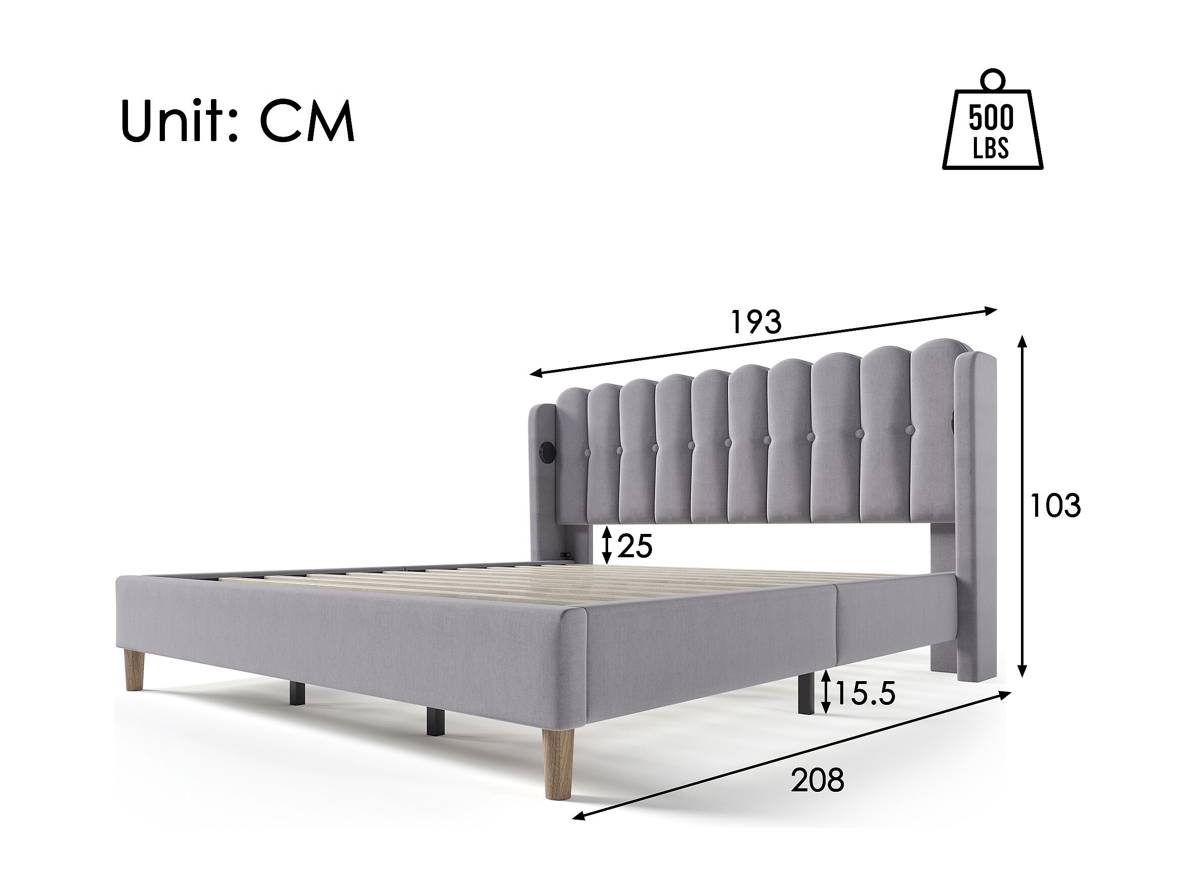 Lit double 180x200 cm en lin gris avec fonction de chargement USB Type C et sommier