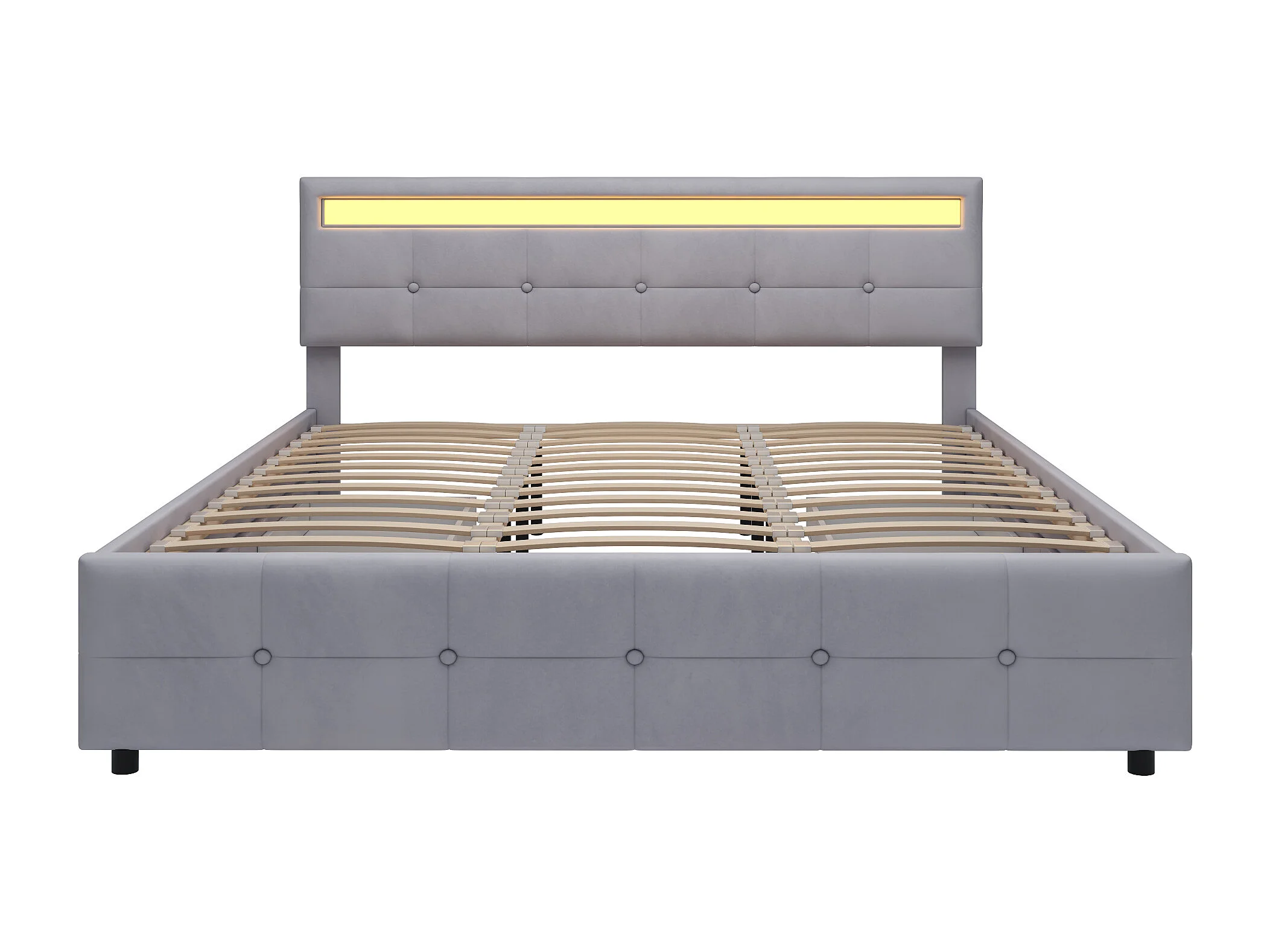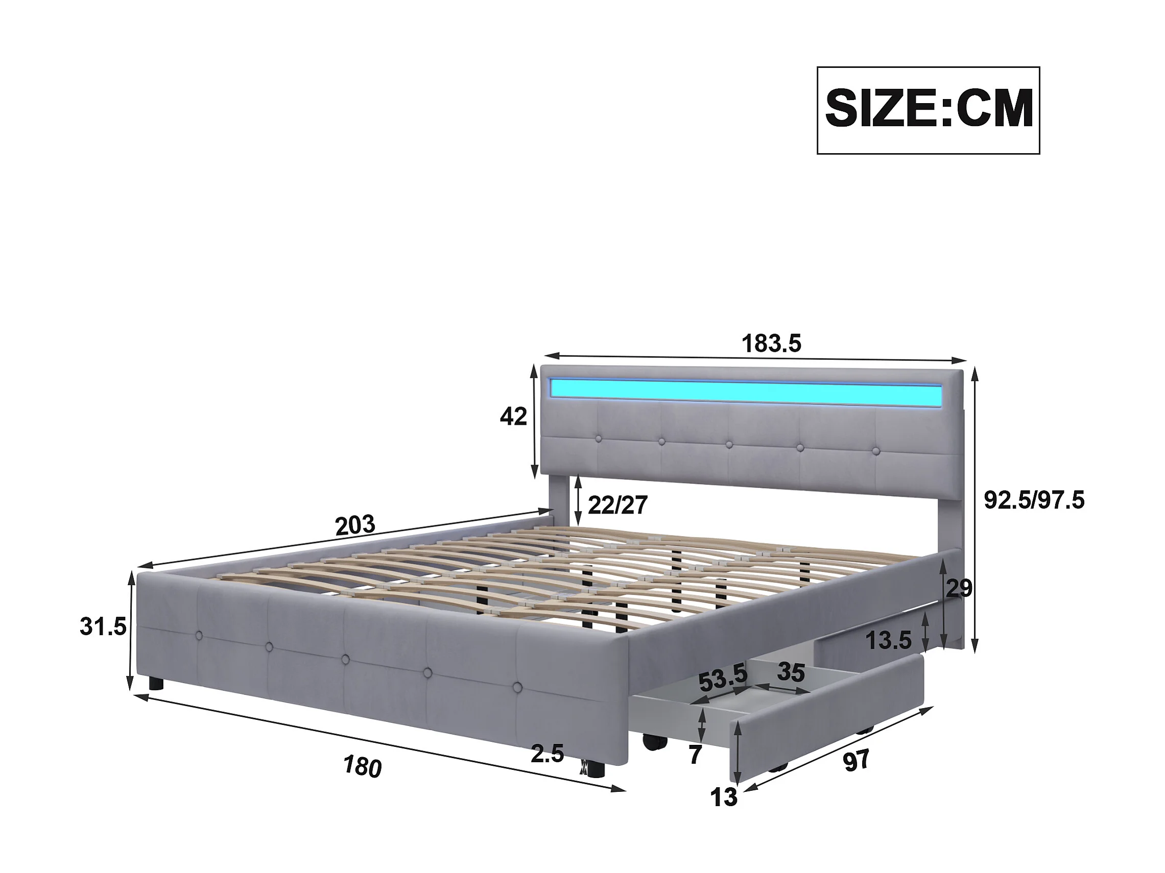 Lit adulte 180x200 cm - Lit avec 4 tiroirs et sommier à lattes - éclairage LED - velours gris