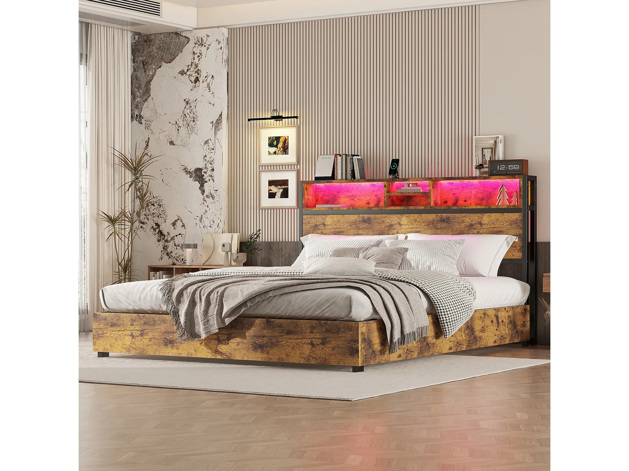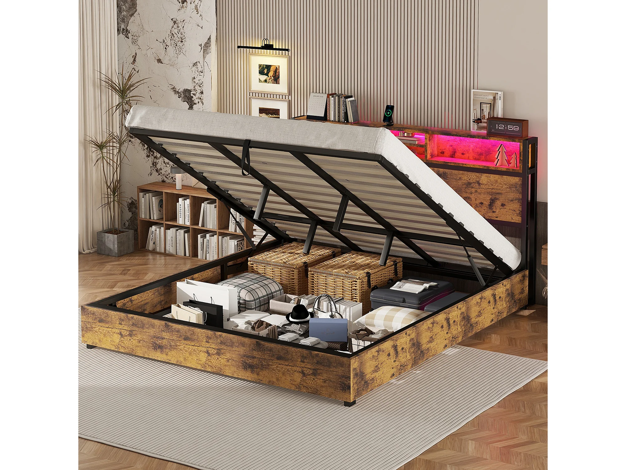 Lit double 180x200 cm, lit plat avec mécanisme hydraulique, LED multicolore, télécommande 24 touches, grand rangement, Marron