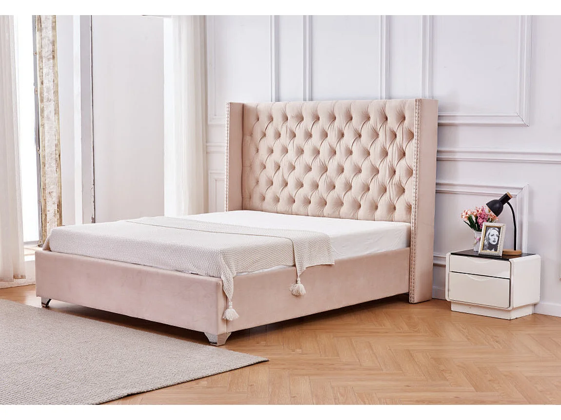 Lit double 180x200 cm velours nude tête capitonnée sommier inclus PRINCESSE