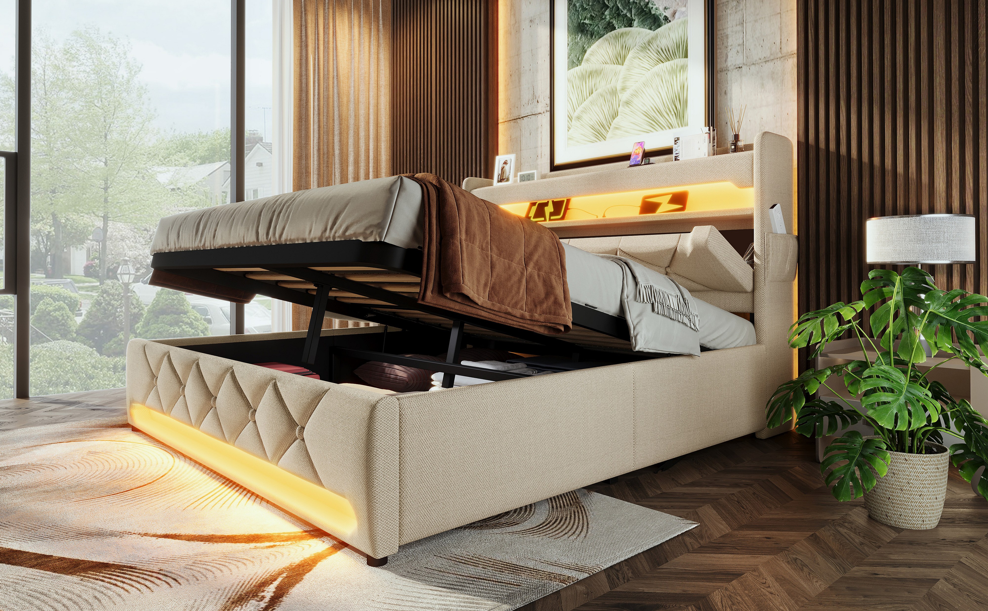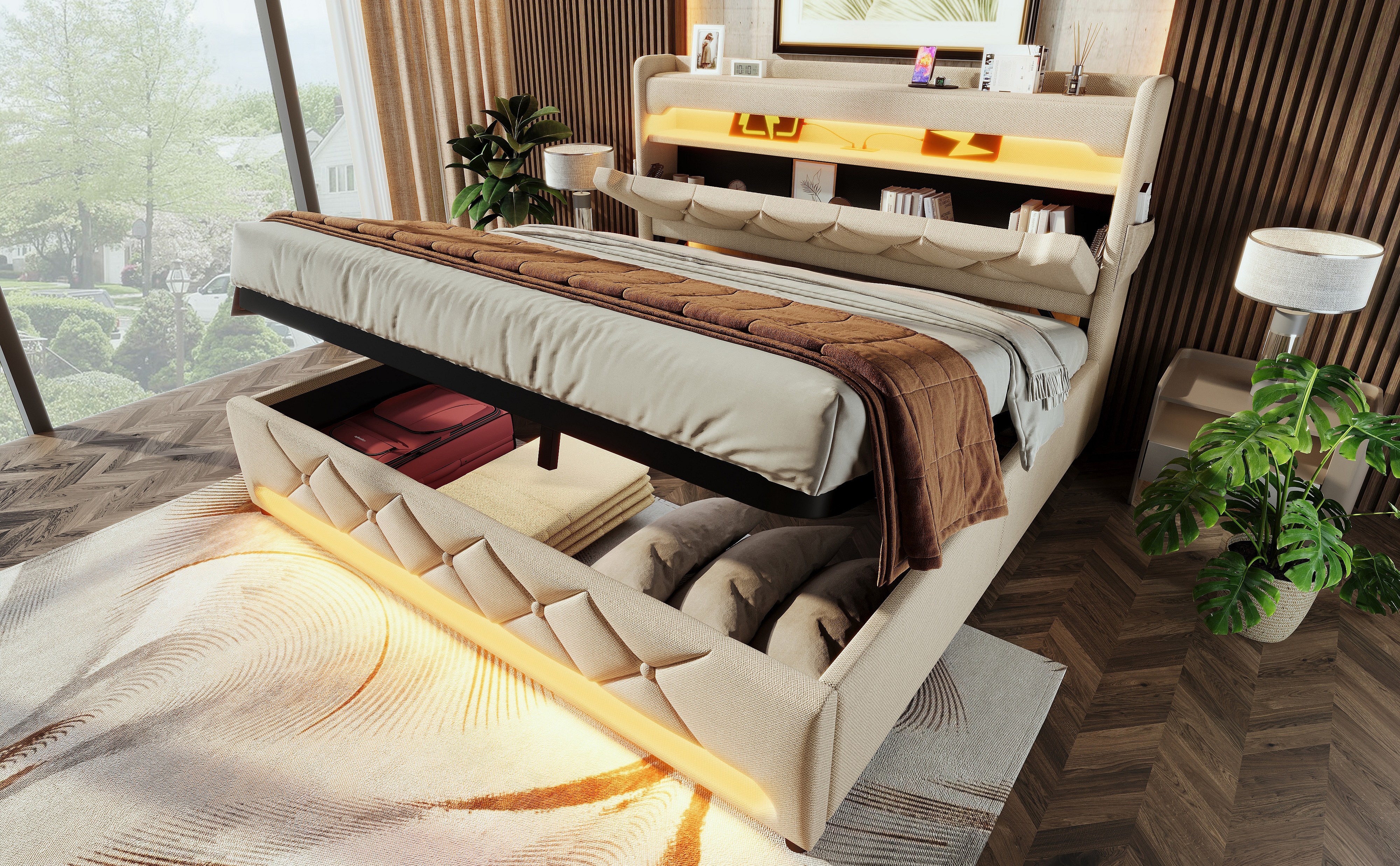 Lit double 180×200 cm, tête de lit avec rangement, ports USB et Type C, éclairage LED 360°