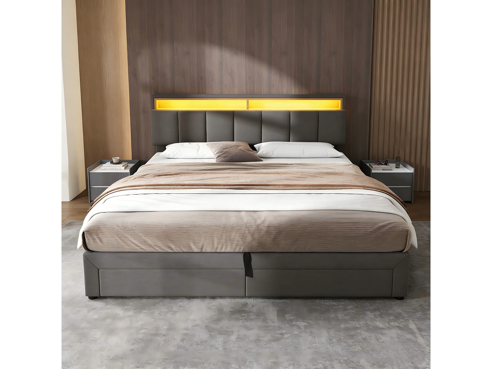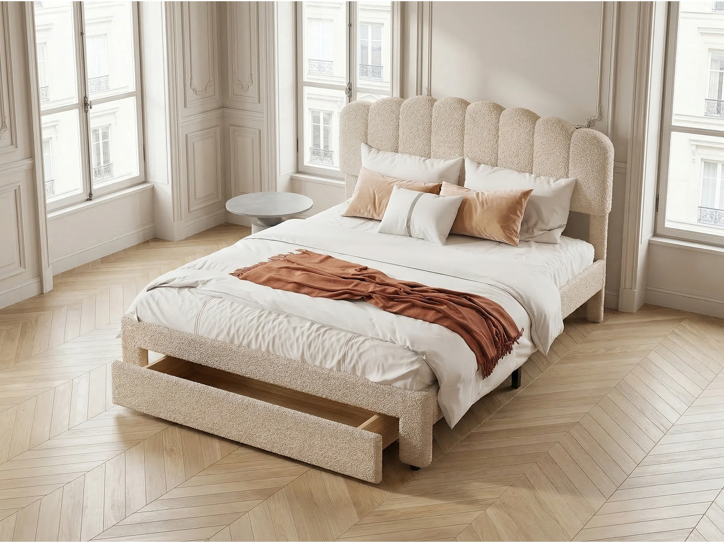 Lit rembourré avec tiroir de rangement, tête de lit ondulée, tissu teddy, USB, sommier à lattes, coloris crème