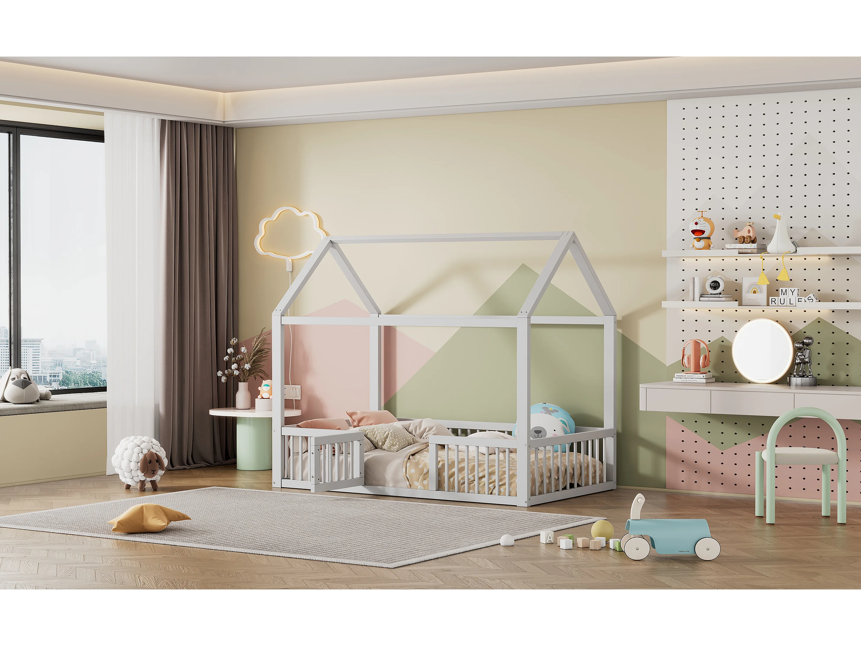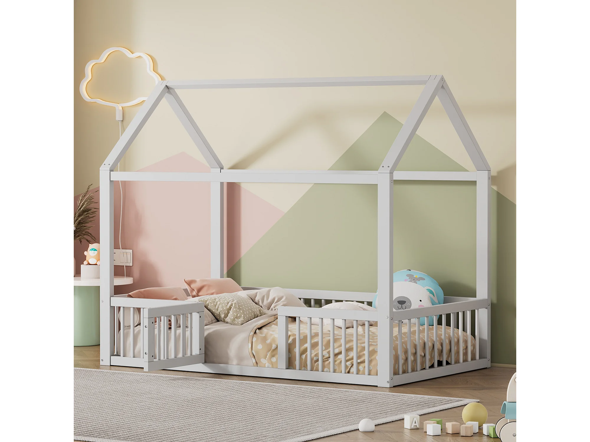 Lit double 90x200 cm en bois massif, lit simple type maison avec petite porte, fonctionnel et chaleureux, Blanc