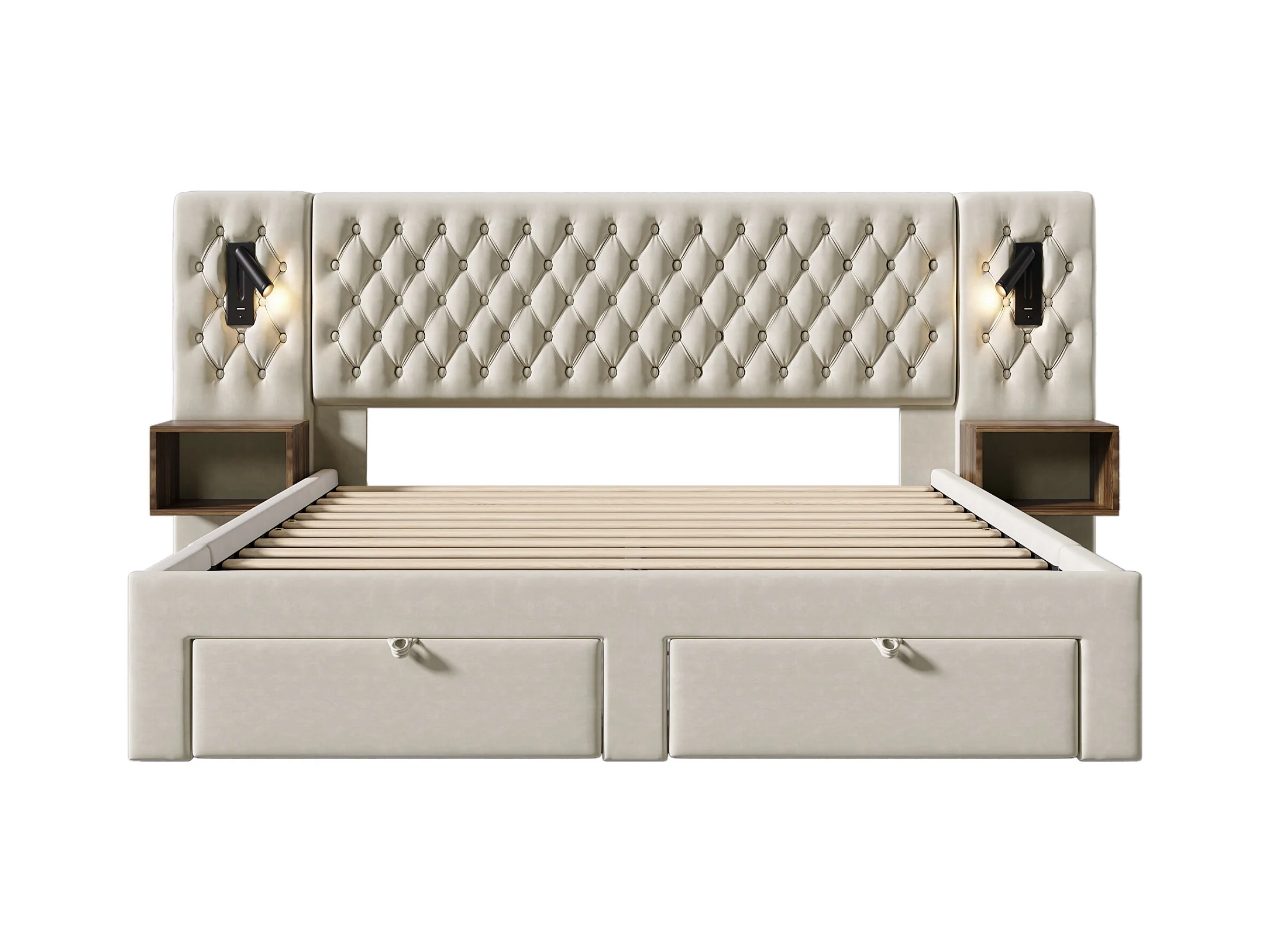 Lit double adulte 180x200cm en velours beige avec 2 tables de chevet, 4 tiroirs, USB et liseuse, sans matelas