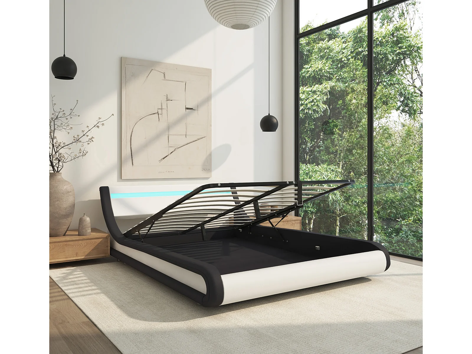 Lit double avec coffre 140x190cm en Blanc et Noir avec LED Parisina