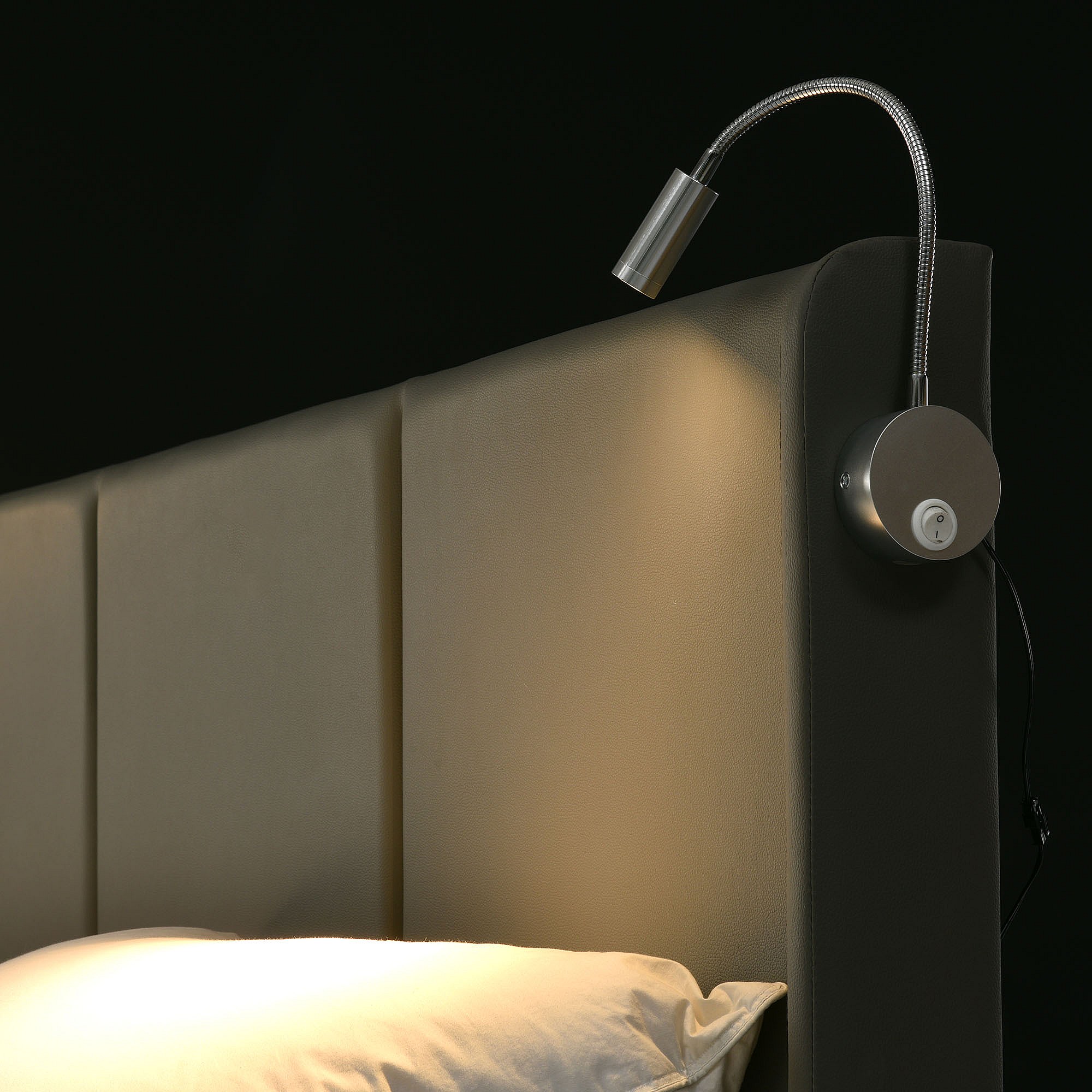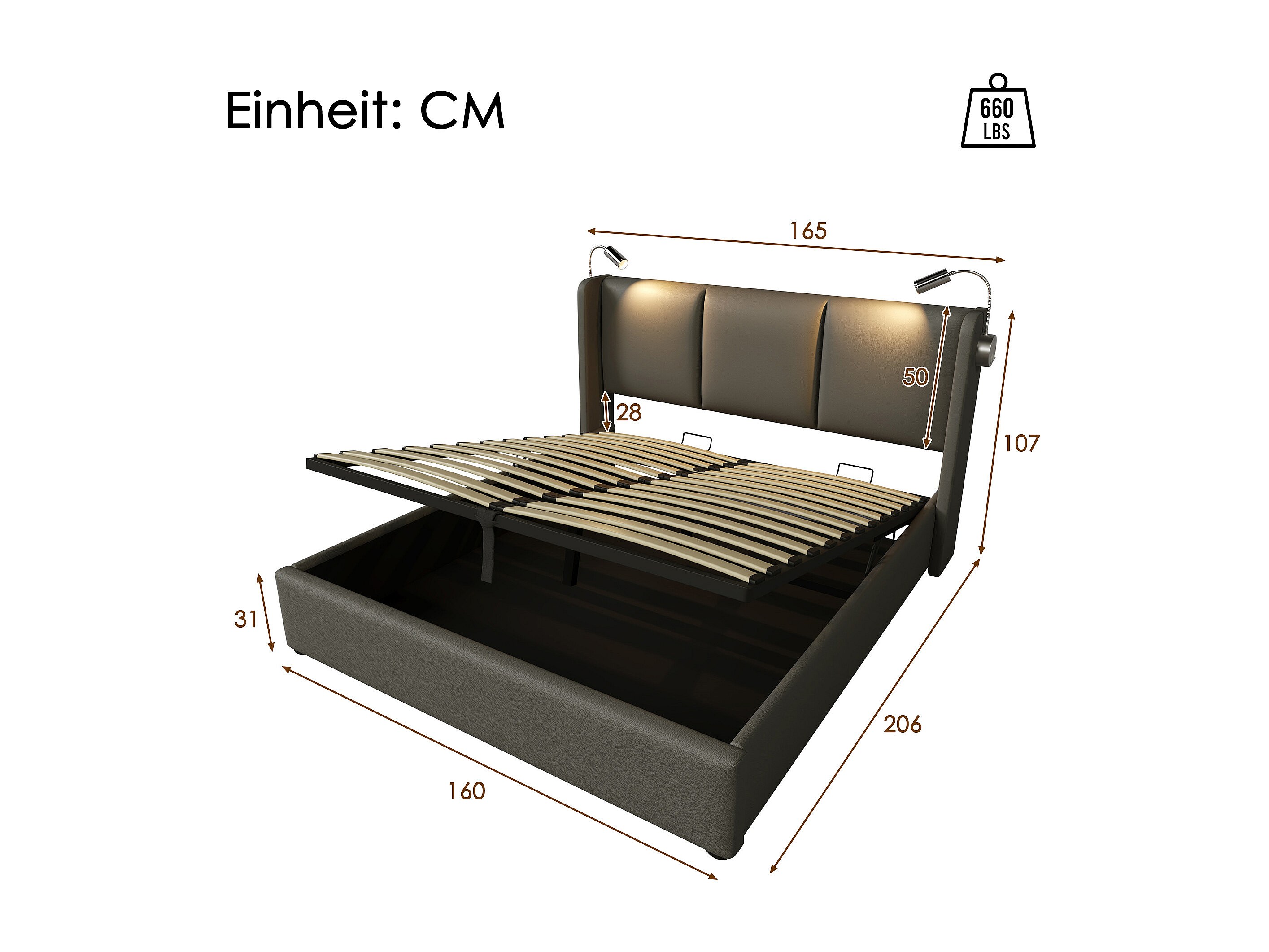 Lit double avec rangement, éclairage de lecture et fonction de charge, 160x200 cm, gris, cadre en PU