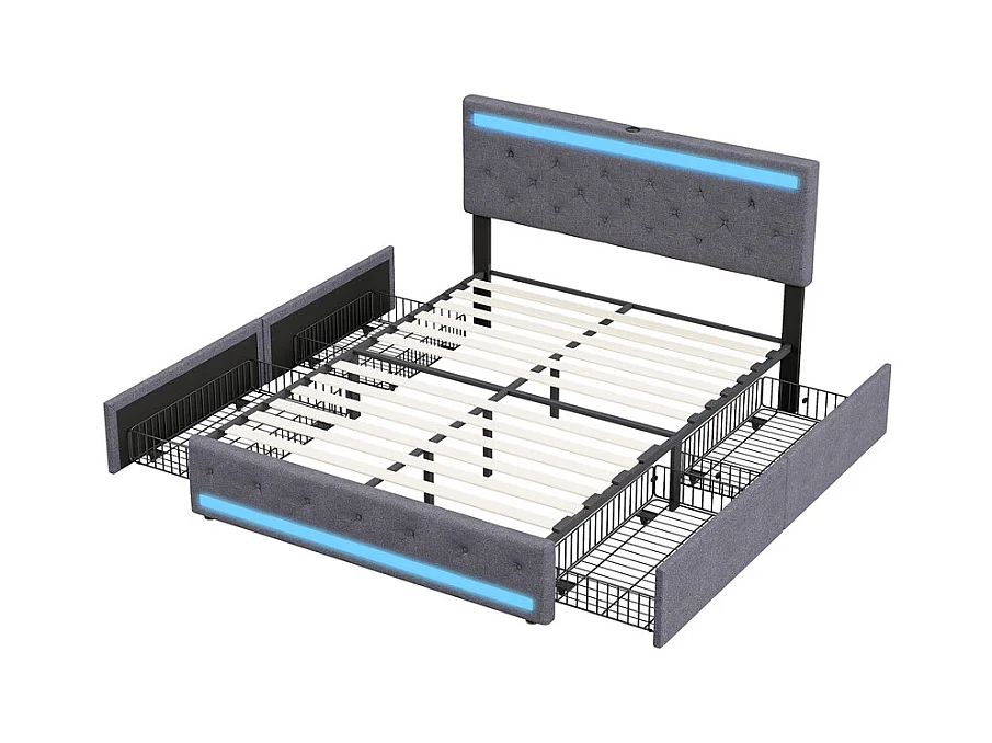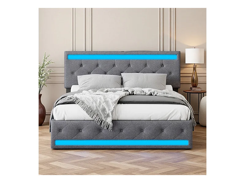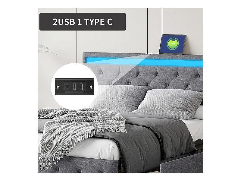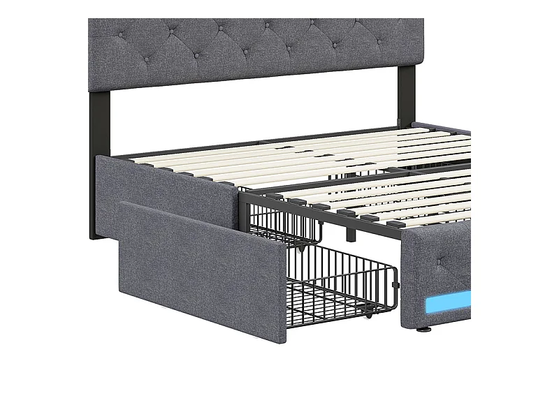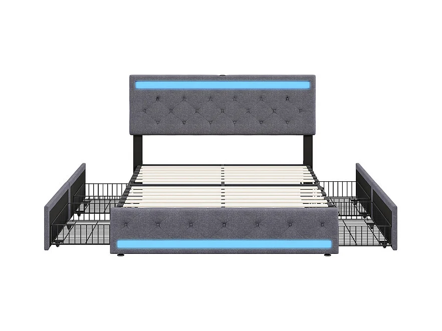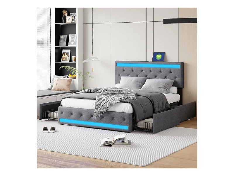 Lit double avec rangements, 180x200 cm, LED RGB intelligent, Tissu Lin, 4 grands tiroirs, Design moderne Gris foncé