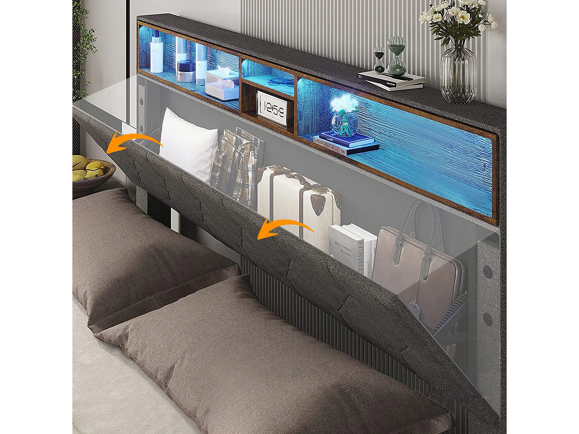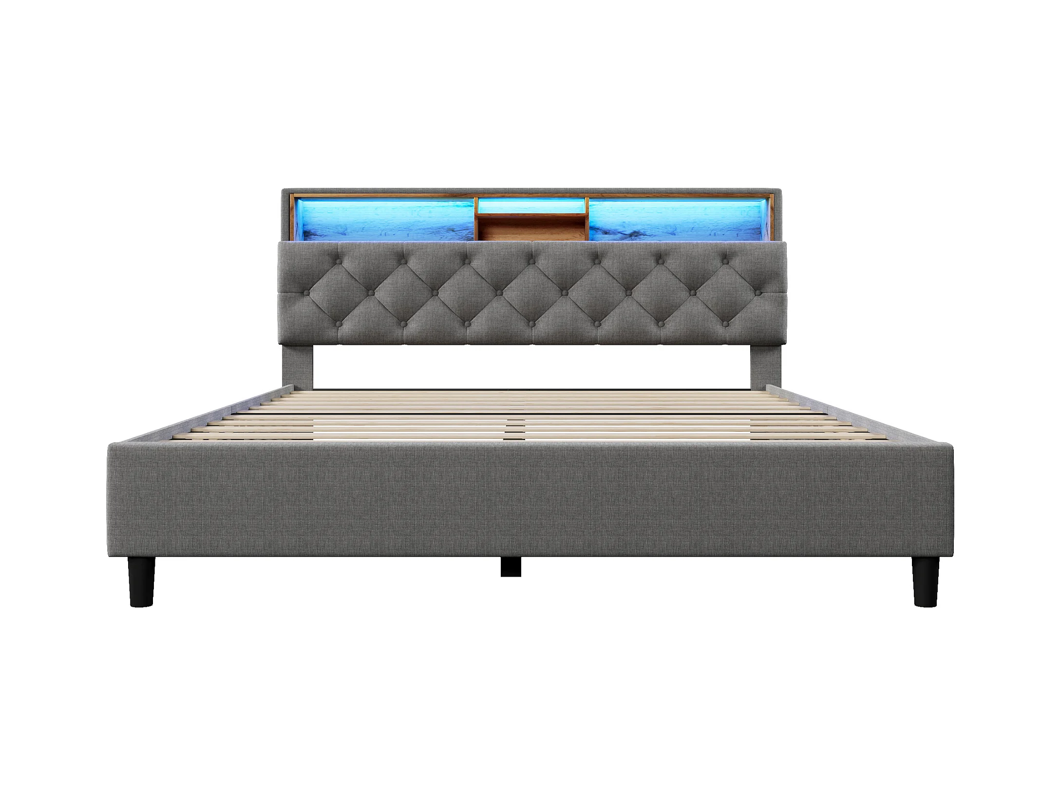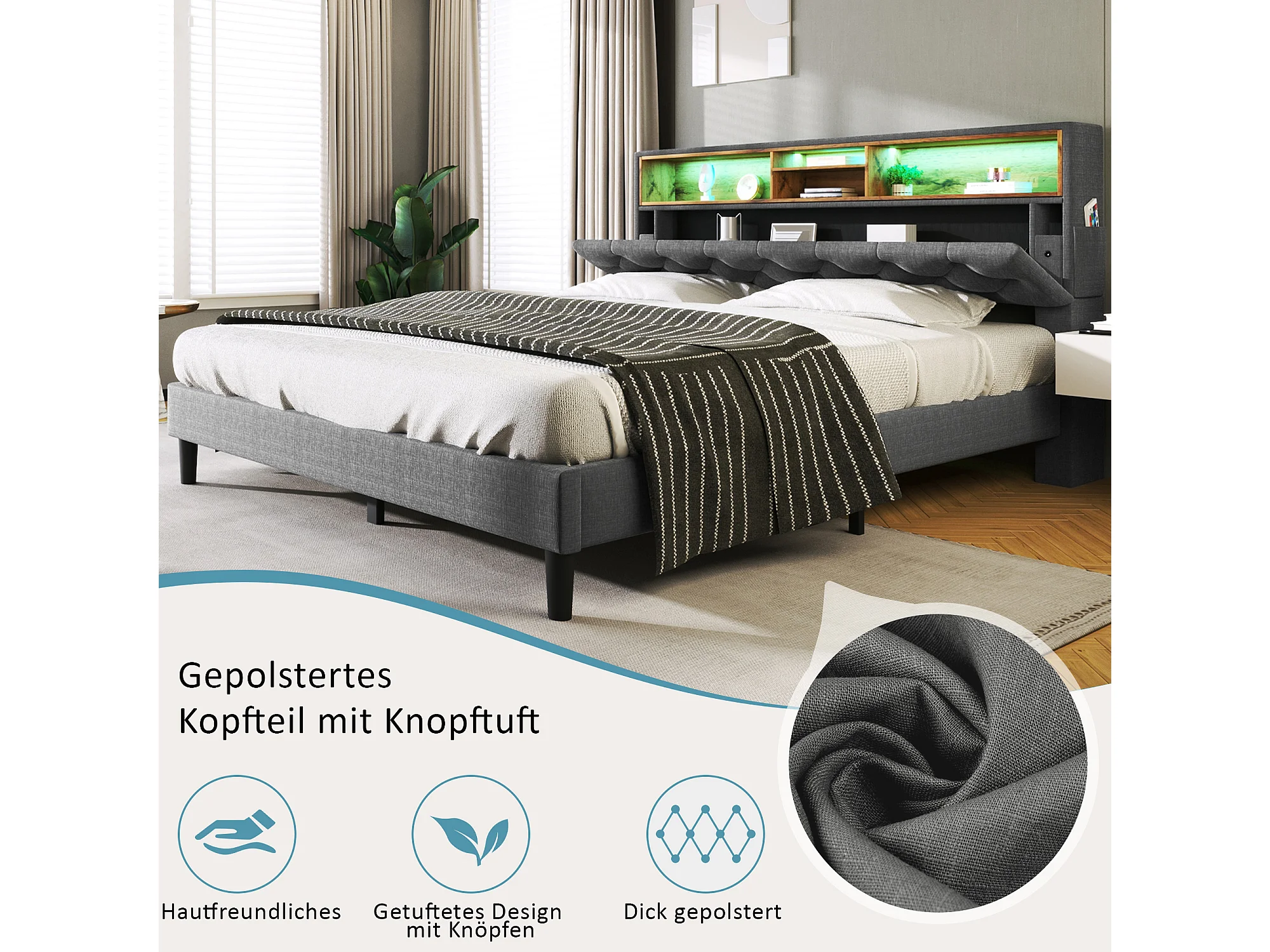 Lit double avec tête de lit de rangement, LED et ports USB, cadre en bois, gris (140x200 cm) (dimensions : 214x149x107 cm)