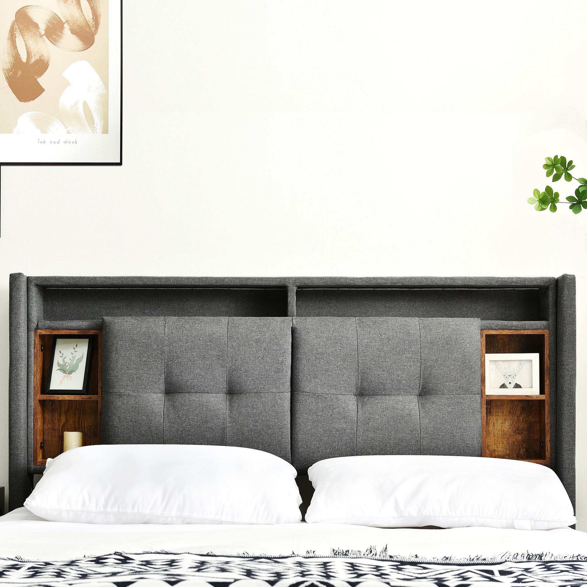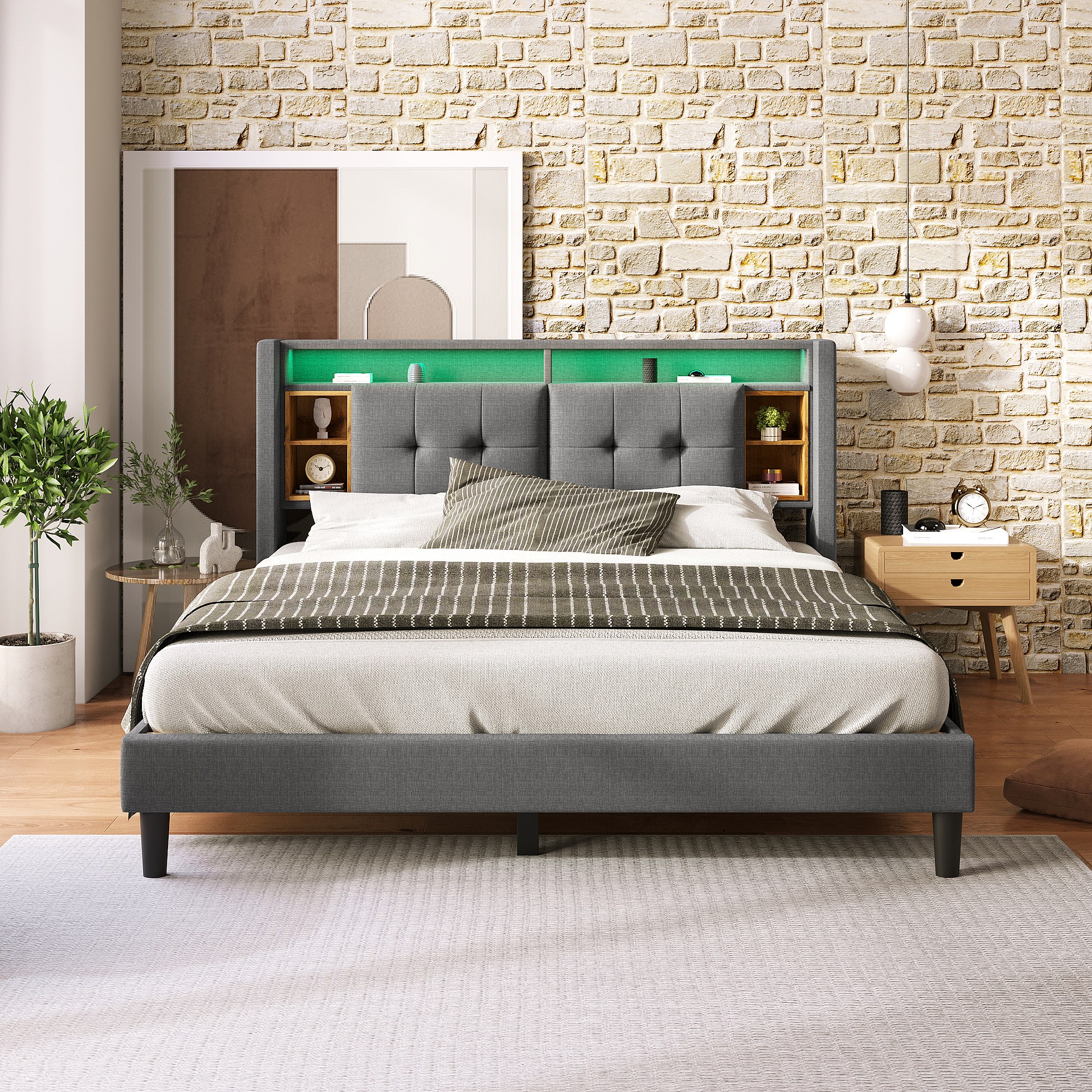 Lit double avec tête de lit de rangement, USB et éclairage LED, 140×200 cm, gris, en bois massif